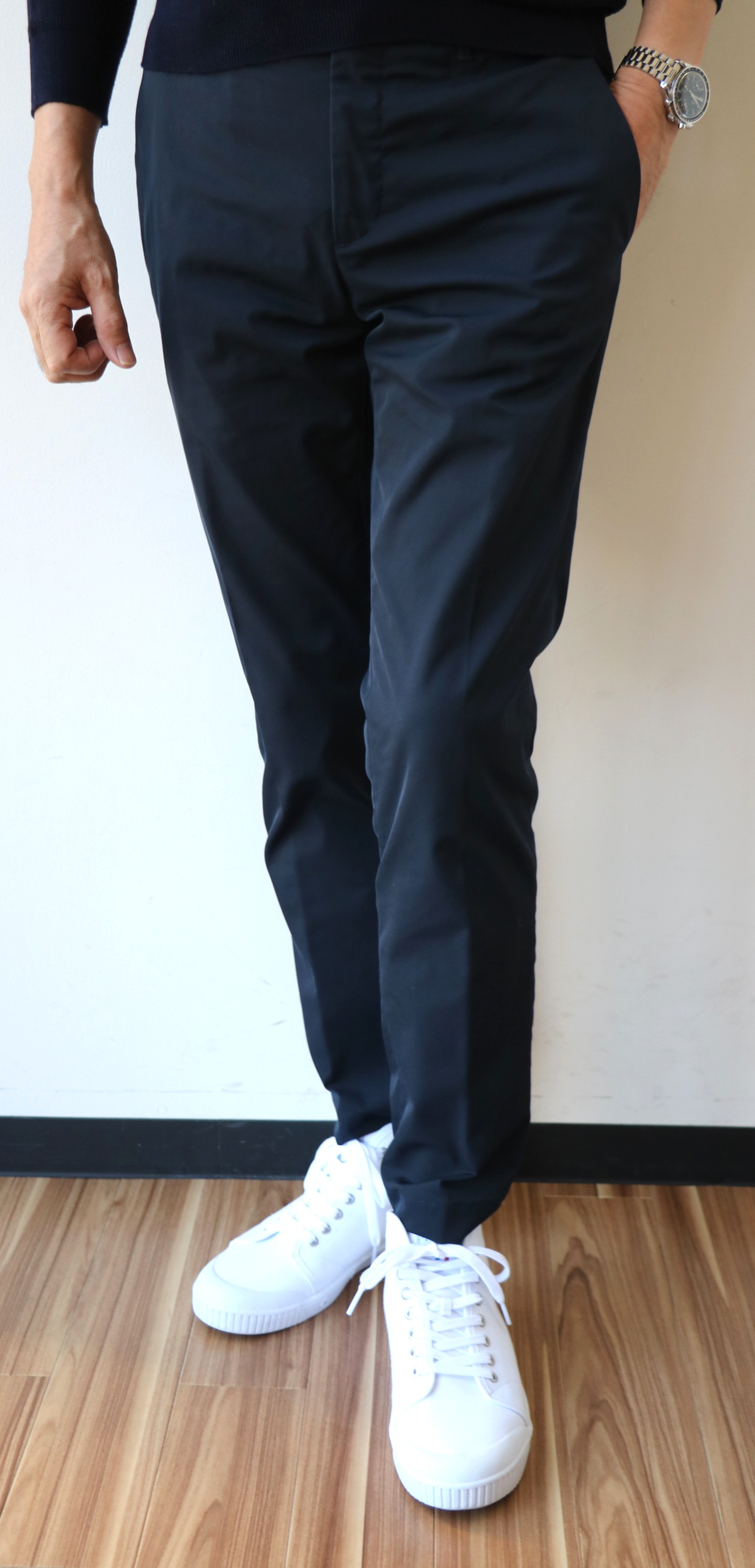 温度差のある、この季節から大活躍のHERNO(ヘルノ)の「ジャージ×ナイロン中綿入り切り替えブルゾン」。インナーは、スウェットの気楽さとニットの温かみの両方を備えた、ZANONE(ザノーネ)の「rain wool」。どちらも手に入れにくい逸品ですが、注目すべきは下半身です。