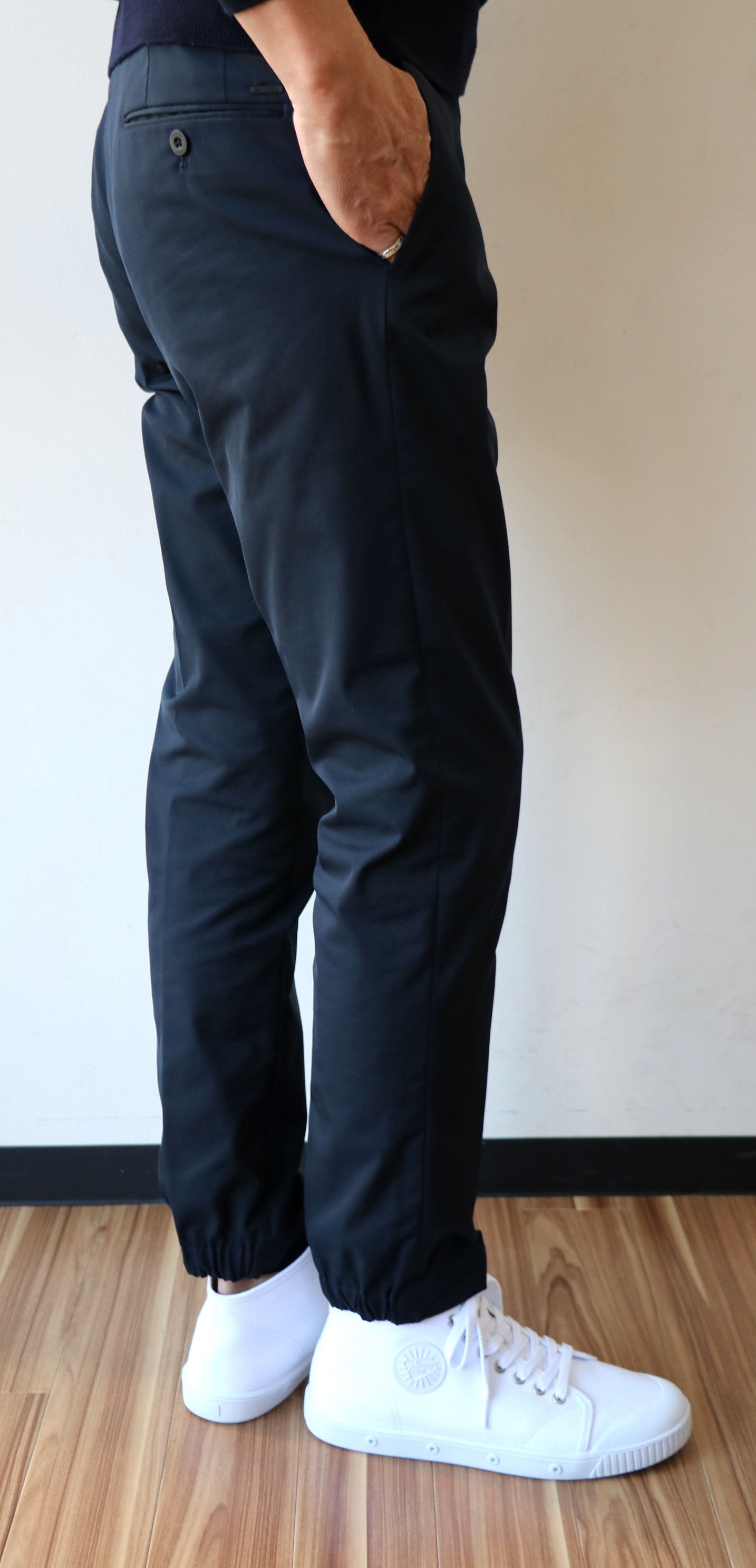 腰回りにシャーリングを施し、フロント部分はシンプルな顔つき。裾も同じで踵部分のみシャーリングが入ります。穿き心地は言わずもがな、フォルムも美しいパンツに仕上がっています。