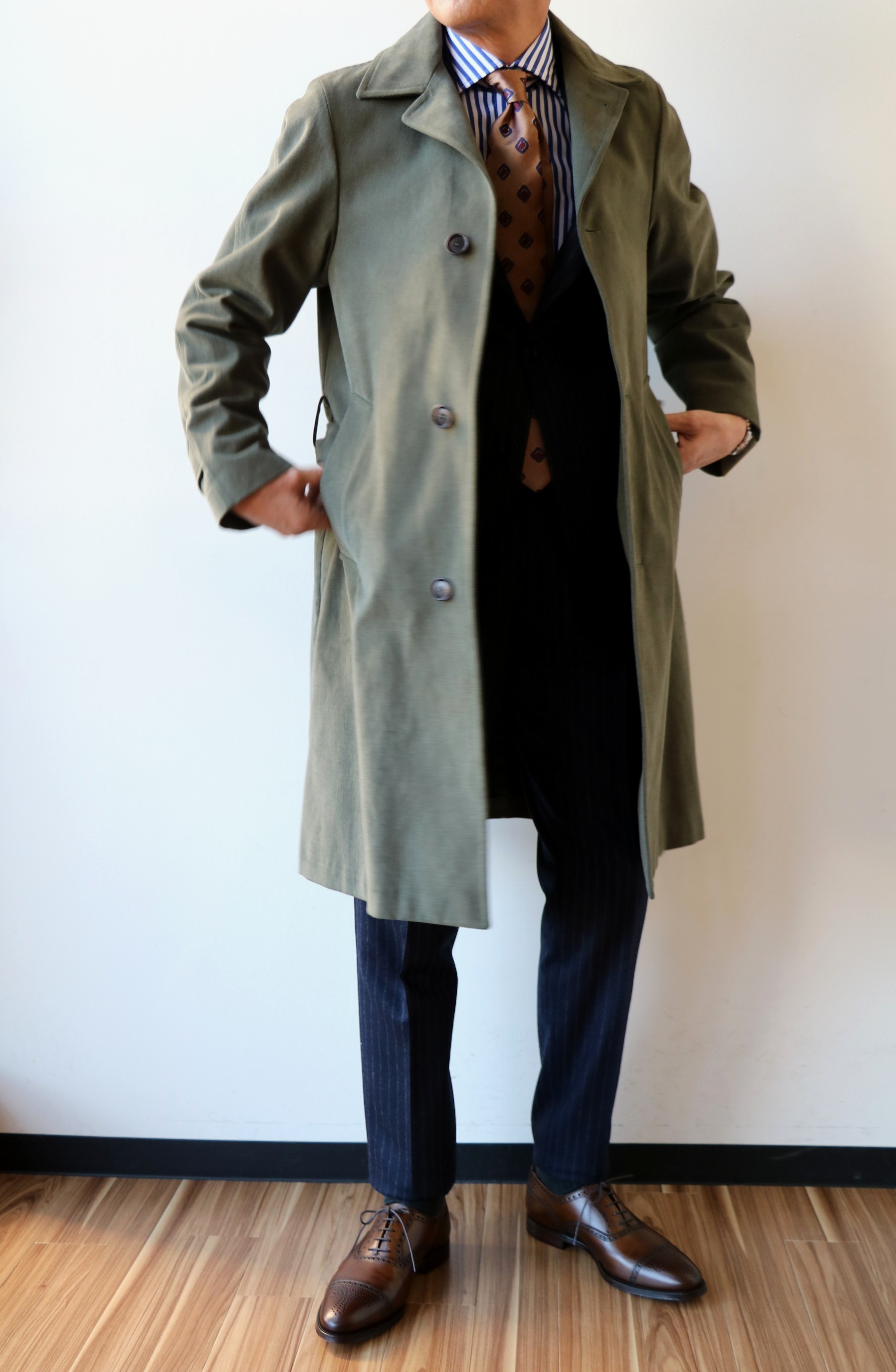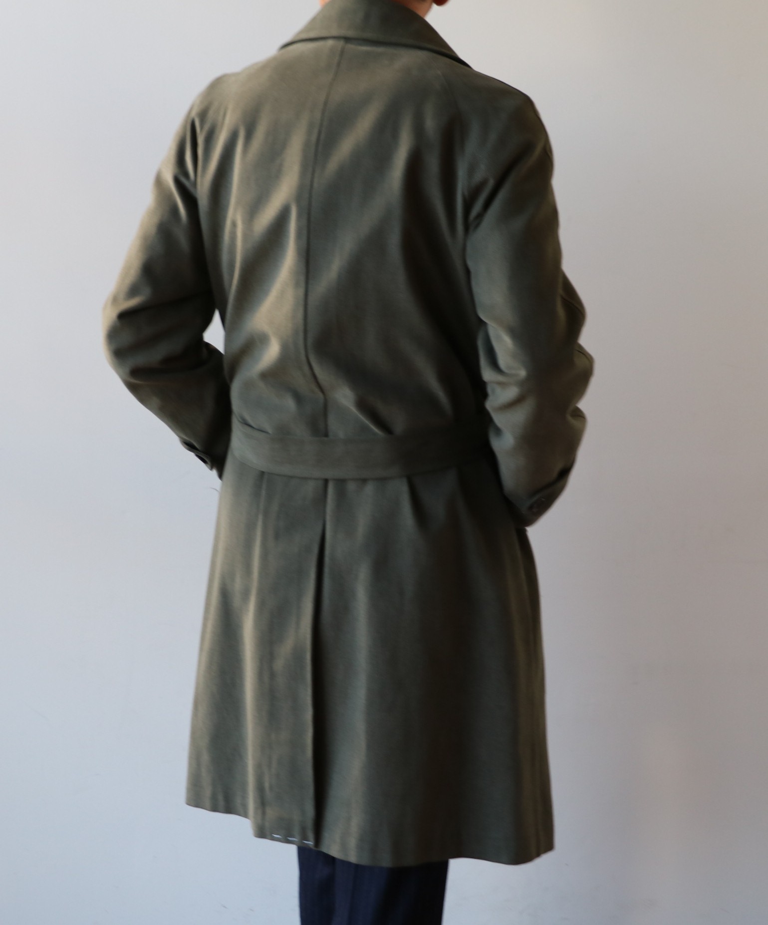 素材は、コットン100%。やや厚手のツイル地ですが、手触りはソフトです。製品染めの生地の風合いと掠れ感のあるグレイッシュオリーブ、さらにエレガントなAラインのフォルムが見事に調和した通好みのコートに仕上がりました。今回、スーツに合わせましたが、機会があれば、ジーンズを使ったコーディネートをしてみたいものです。