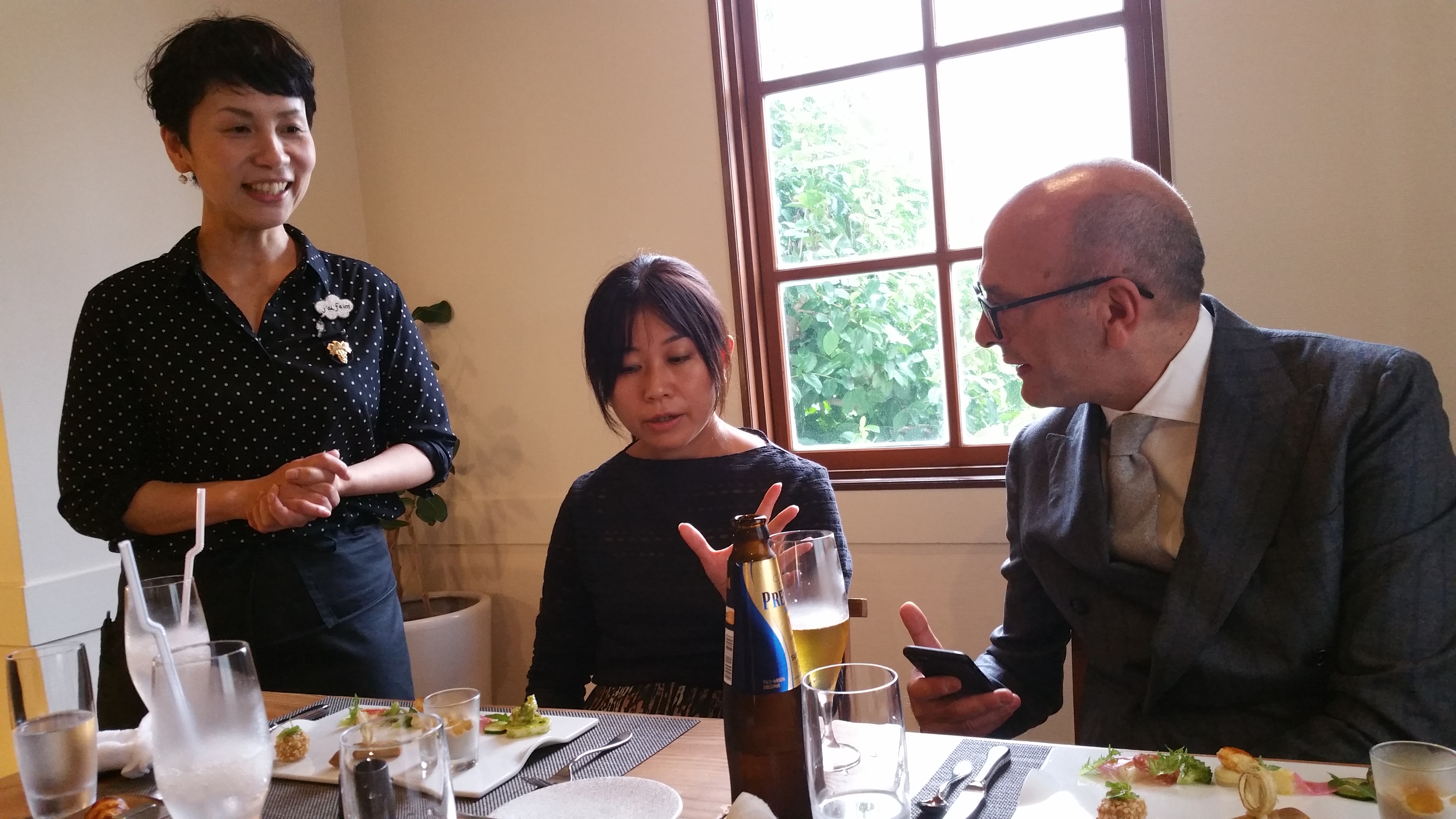 10月11日、来日されていた【De Petrillo/ペトリロ】のオーナー、ベネテッド・デ・ペトリロ氏がご来店です。前日、京都に一泊され、朝の新幹線で、ここ岡崎へ。そして、この日にはイタリア・ナポリに戻られるという慌ただしい日程の中、昼食にお付き合い頂きました。日本食に慣れておられないと聞いたので、ここなら間違いないと、お連れしたのが、京料理に似た季節感のある繊細な料理を出してくれるフレンチの"デッサンプリュス"。マダムが、もとグローリーガイのスタッフであったことから、我儘も聞いてくれます。もちろん、シェフの腕は確か。ソムリエのS君の決め細やかなサービスも申し分ありません。隣の女性は、通訳の相馬さん。魅力的な女性です。担当の遠藤さん、彼も控えめに頑張っております。