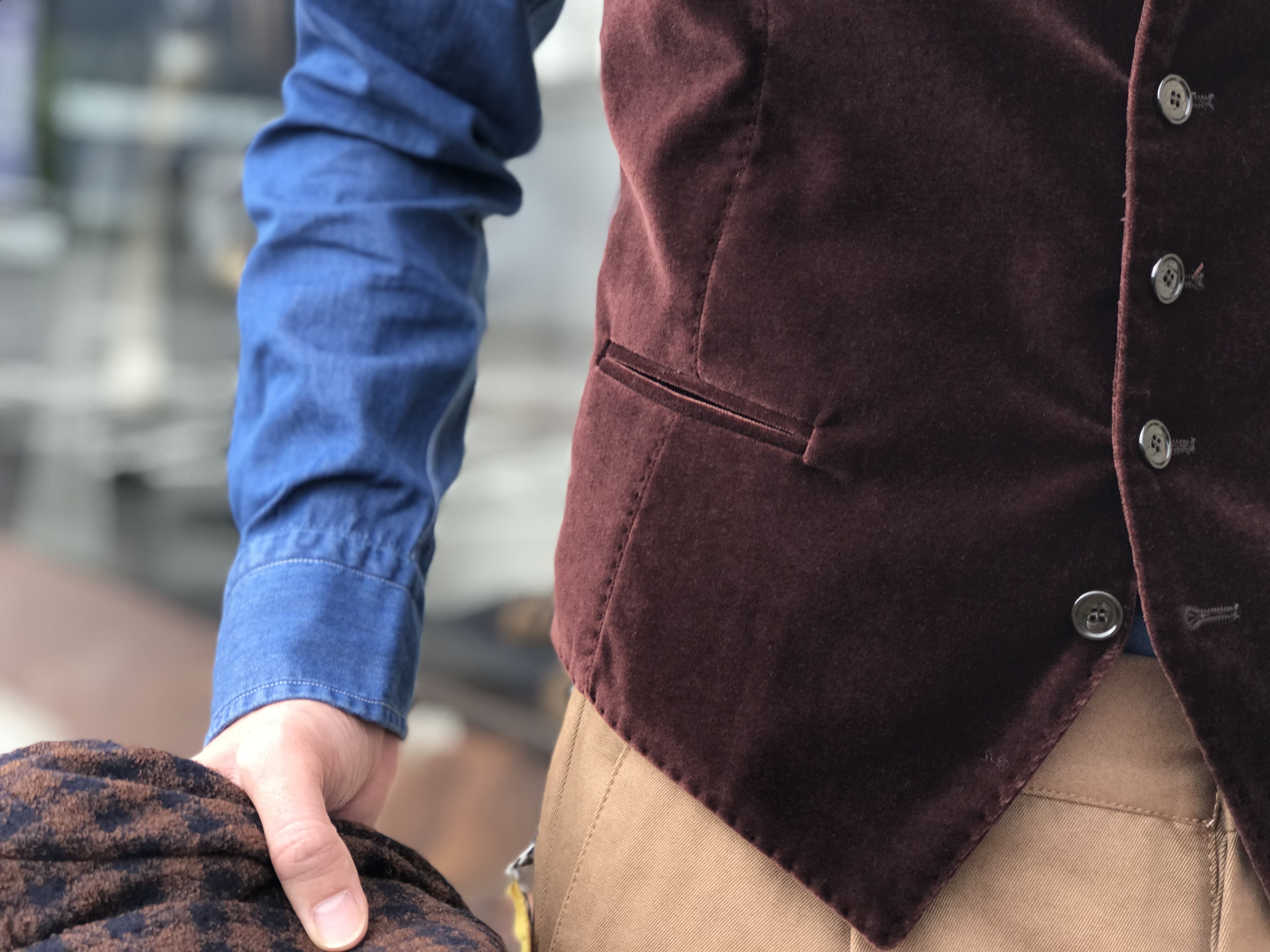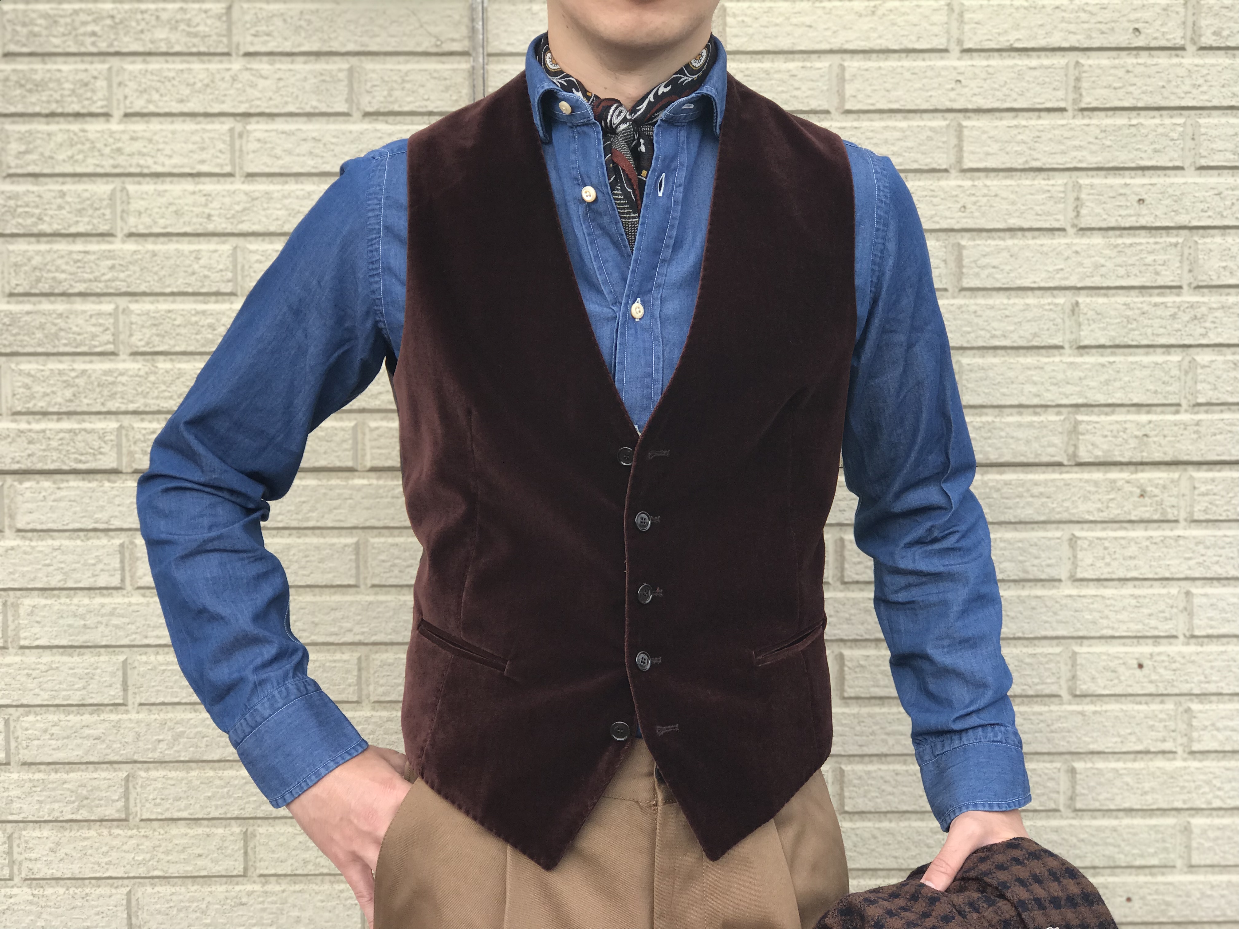 9/2のblogでご紹介をさせて頂いた別珍ジレとは生地違いですが、フォーマル向けや定番カラーとしてのミッドナイトブルーに対し、カジュアルな場面で使い勝手の良いブラウンもご用意しました。