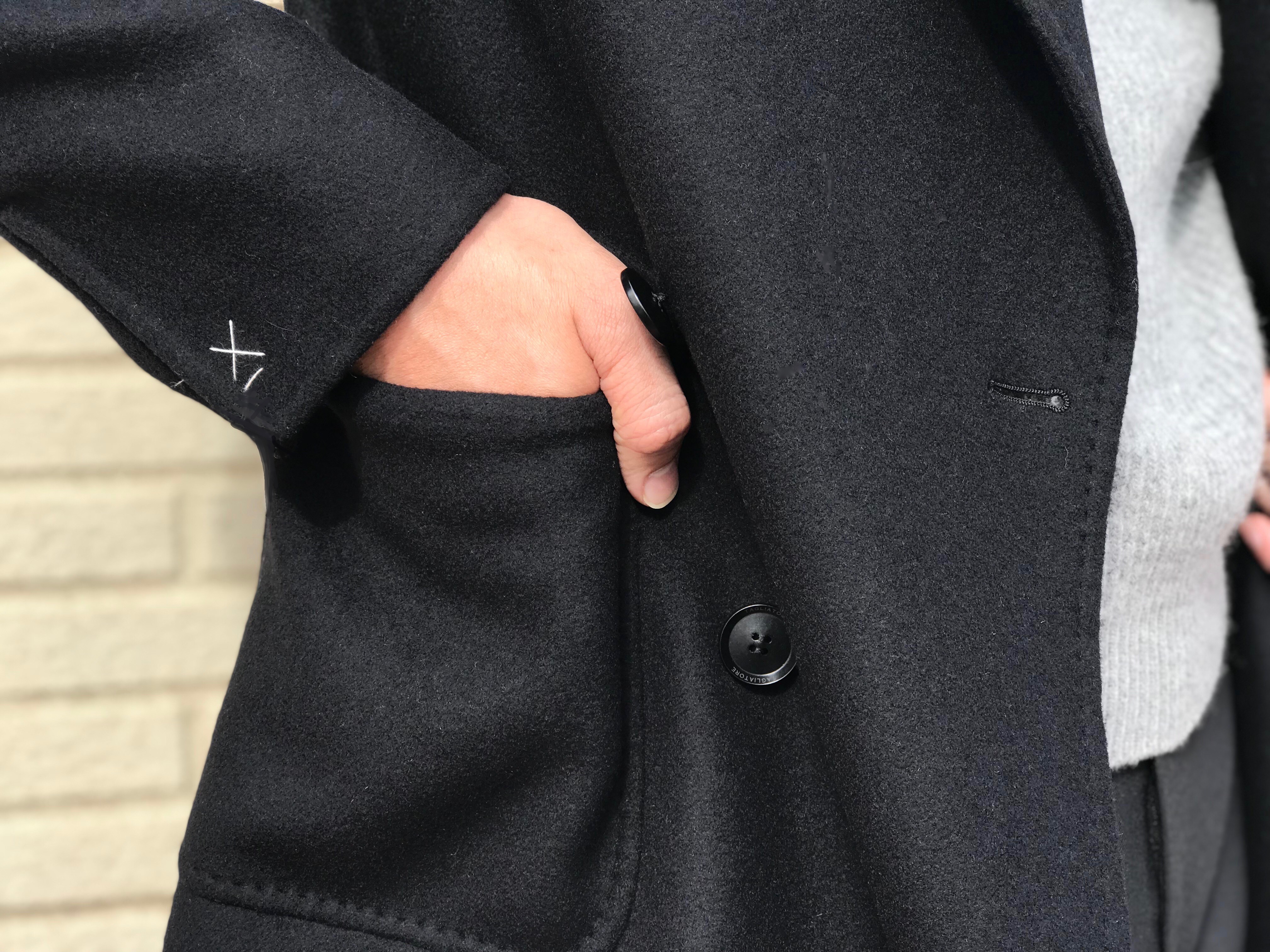 大きなピッチ幅のビッグヘリンボーン柄は、しっかり目の詰まったメルトン生地です。表面には独特の毛羽立ちがあり、頑強なハリコシのある肌触りは、ダッフルコートで有名な英国のG社を知るオールドファンにも、納得の仕上がりではないでしょうか。