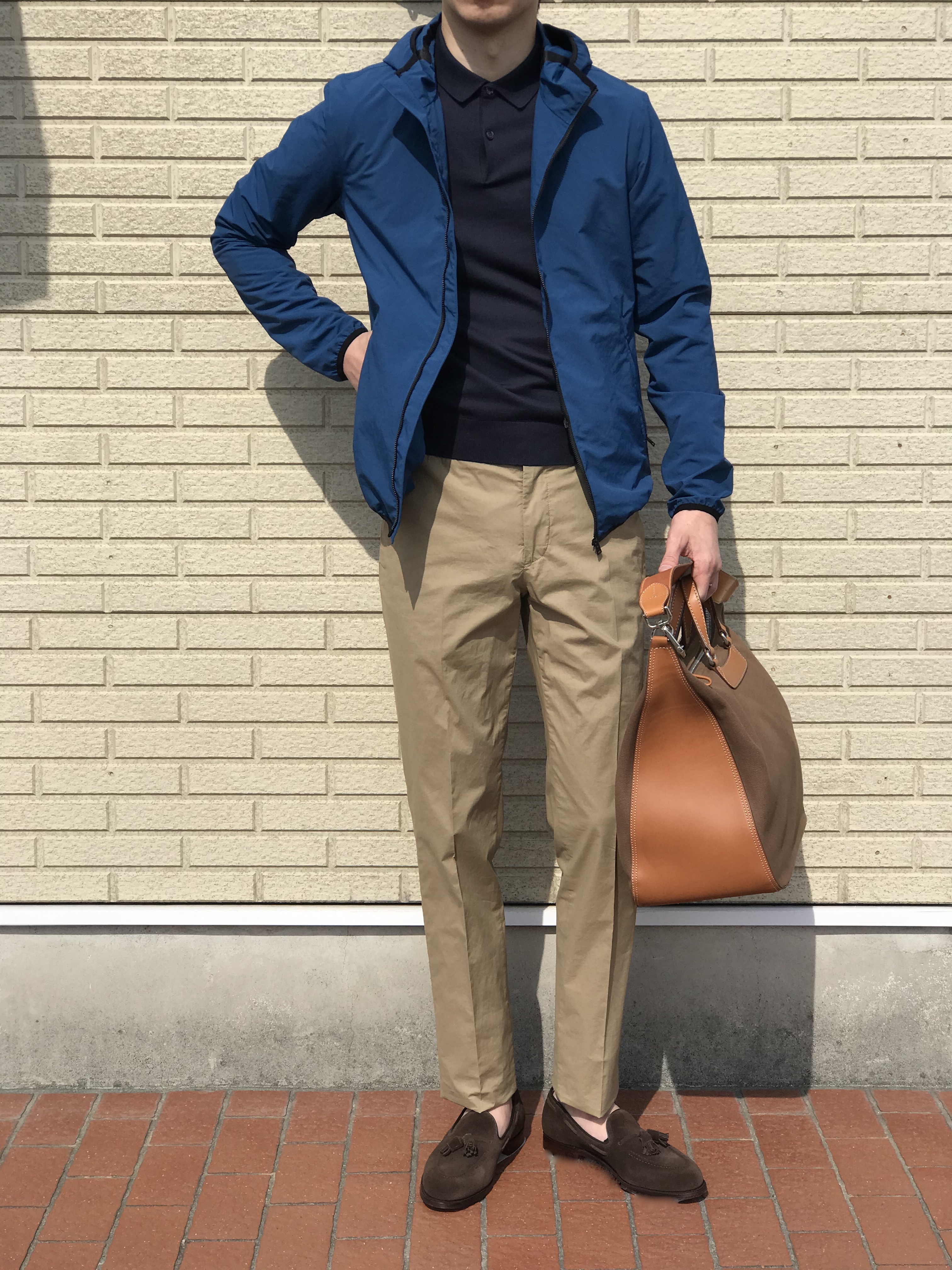 モデルは身長180㎝、体重67㎏、胸囲94㎝で、サイズ46を着用しております。コーディネートしたニットはZANONE、パンツはBorelio、シューズはBAUDOIN&LANGE、バッグはZANELLATOです。