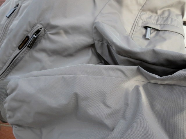 色目は、上の写真が正解。グレイがかったベージュ系です。右側に釦付きのポケット、左側はジップ付きの縦ポケットが装備されています。