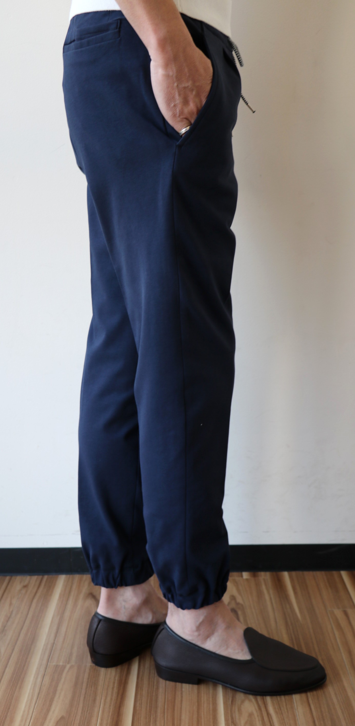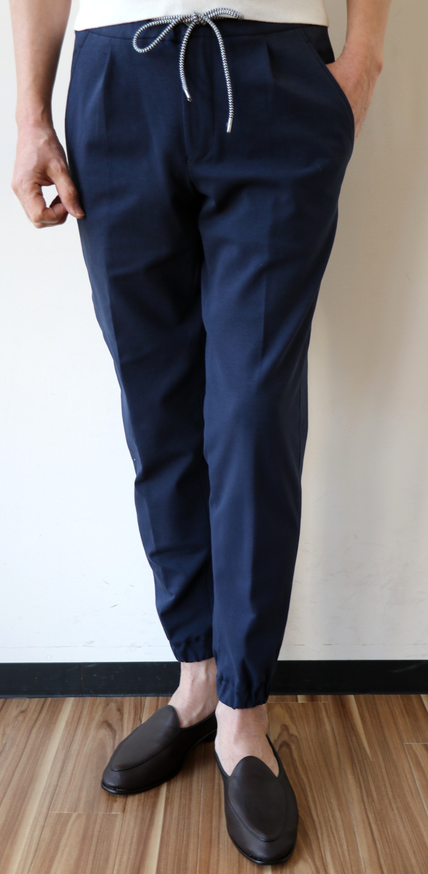 ドローコード付きのリラックスパンツといえば、【VIGANO/ヴィガーノ】と言い切れるほど、かなり早い時期からトレンドとして提案されていました。代理店が代わった今でも、コレクションの中心を占めるほどの定番モデルとなったのが、このモデルです。ただデビュー当時は、ラフだけど、スラックスのようにきちんと見えるシルエットが中心でしたが、より流れがスポーティ化することで、今季はリブパンツに焦点を当ててみました。