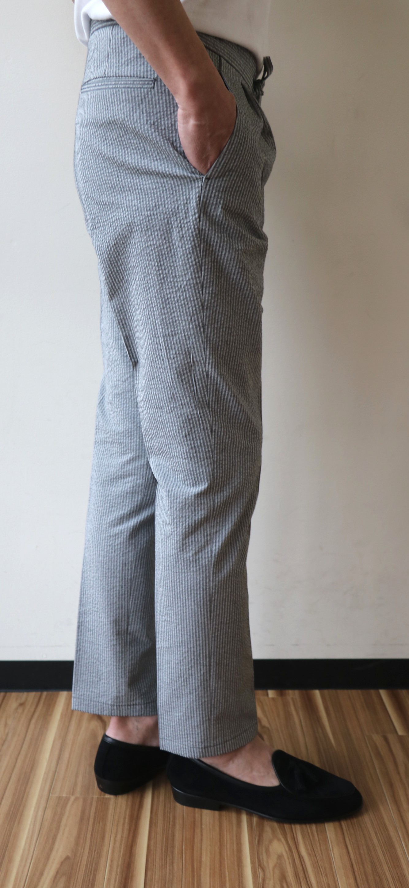 穿いていたのが、シアサッカーのドローコード付きパンツ。フロントはツータックで、裾はタタキ仕上げになります。意外に珍しいグレイのハリコシのあるコットン100%でご用意しました。