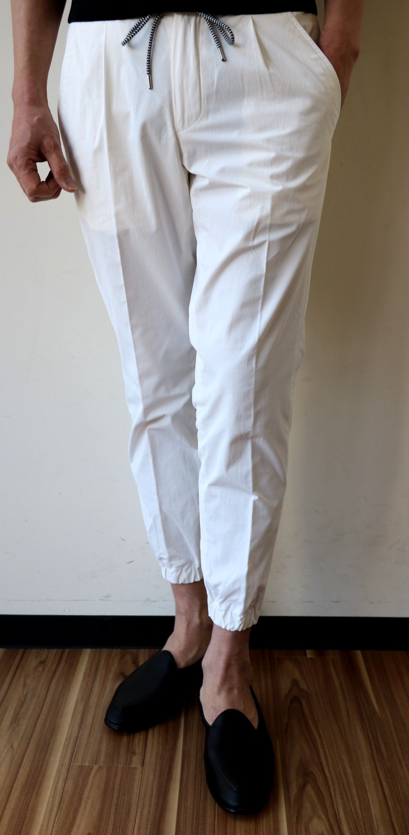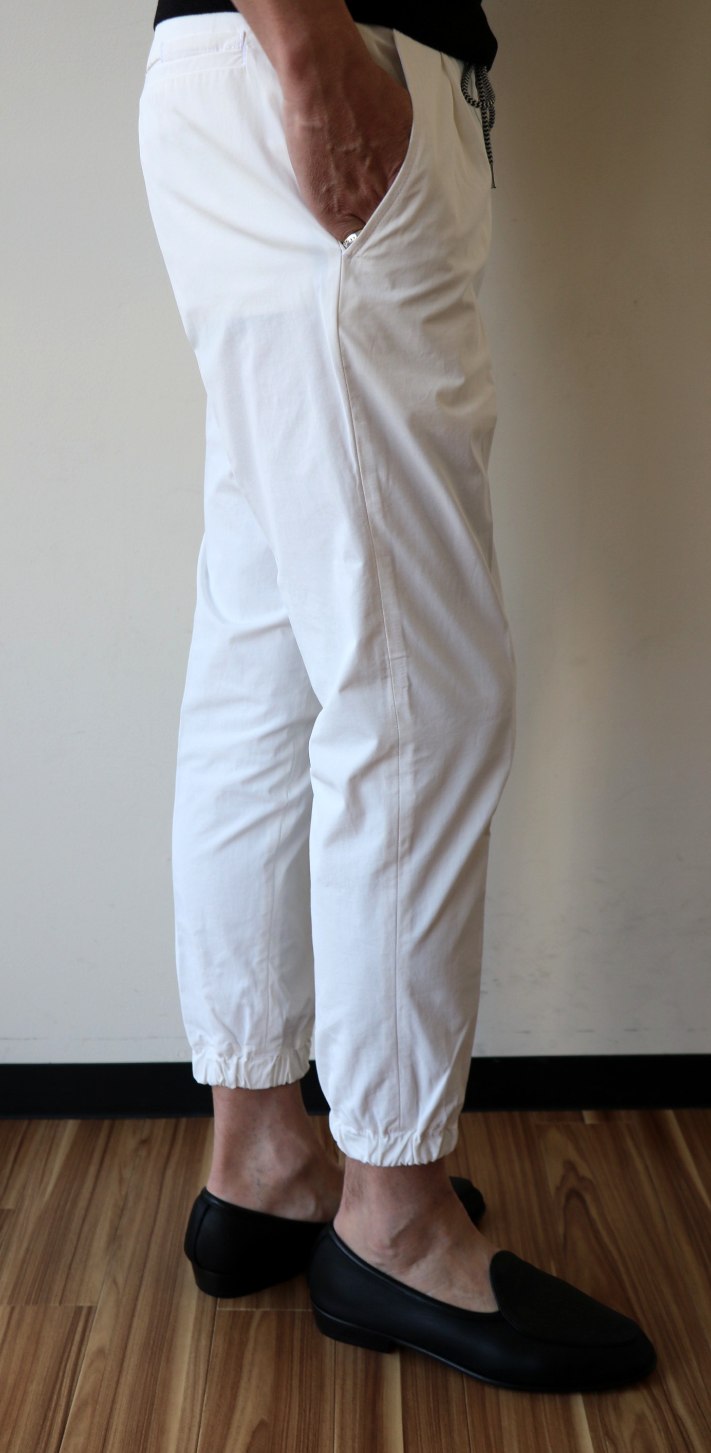 春夏のスタイリングに欠かせないのが、爽やかなホワイト。ただ生地選びが難しいのが、この色のパンツなんですね。まず透け感。夏のヴァカンスに、海辺などのリゾート地で穿くなら別ですが、やはり穿くシーンは、タウンが中心。透けたり、頼りのない生地では、気恥ずかしい。それにリブパンツのスポーティさとも合わない...そこで選んだのがが、ハリコシのあるコットン・ポリエステルの混紡生地。コットンのナチュラルさとポリエステルのハードさが上手い具合に生地のハリコシを持たせてくれています。伸縮性はあまりありませんが、少しゆとりを持ってはいていただければ、リラックス感ある、クリーンなコーディネートが楽しめます。