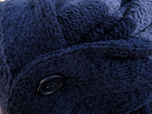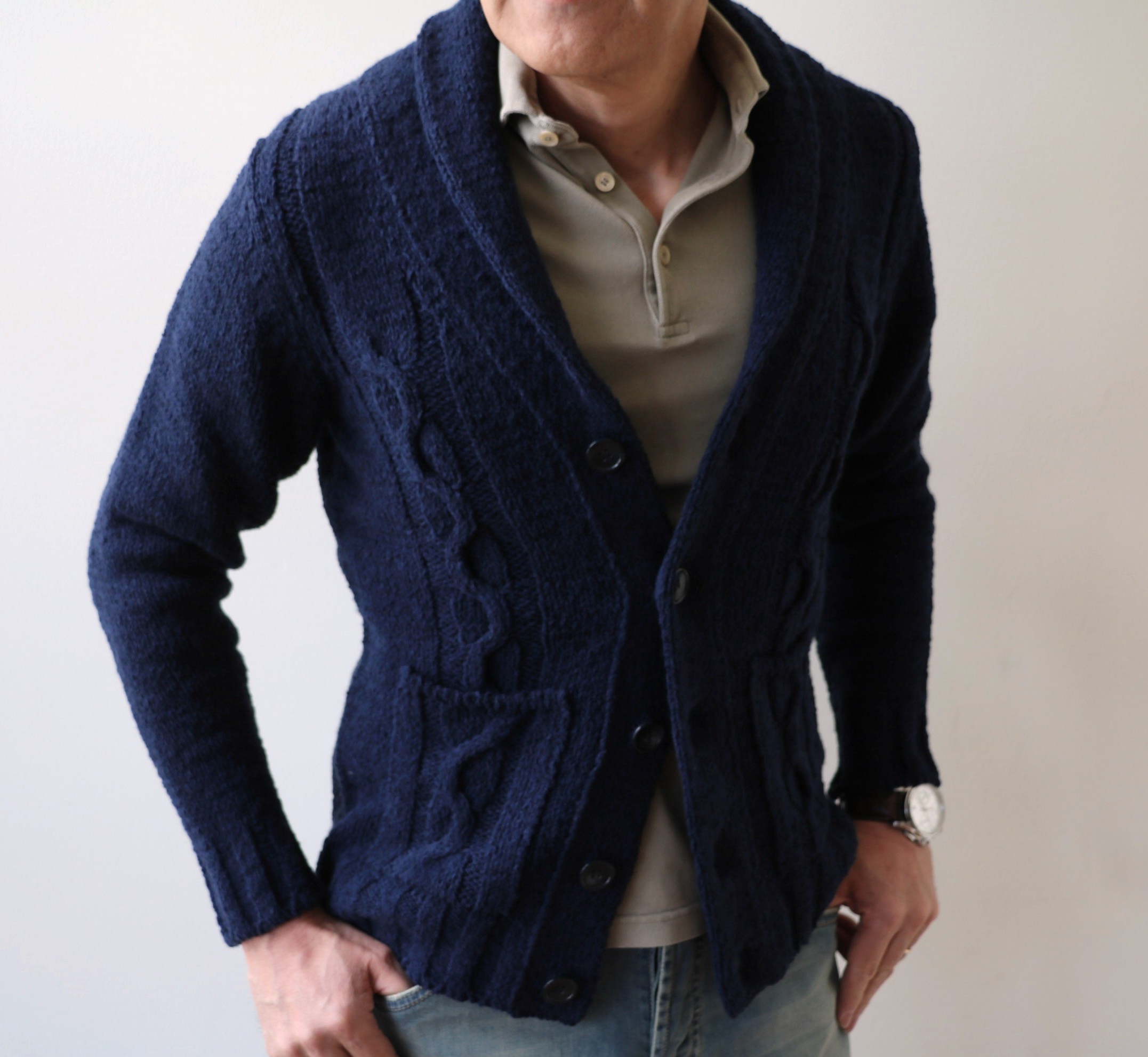 コットン70%、カシミア15%、シルク15%は、不動の混率です。しなやかな肌触り、温もりのある風合い、光沢のある質感と、見た目も申し分ありません。ナチュラルなオフベージュの他にもう一色と、相変わらず自己中心的なセレクトで、やや明るめのネイビーをご用意させていただきました。価格は据え置き、いや、5,000円下がりました。嬉しい配慮です。