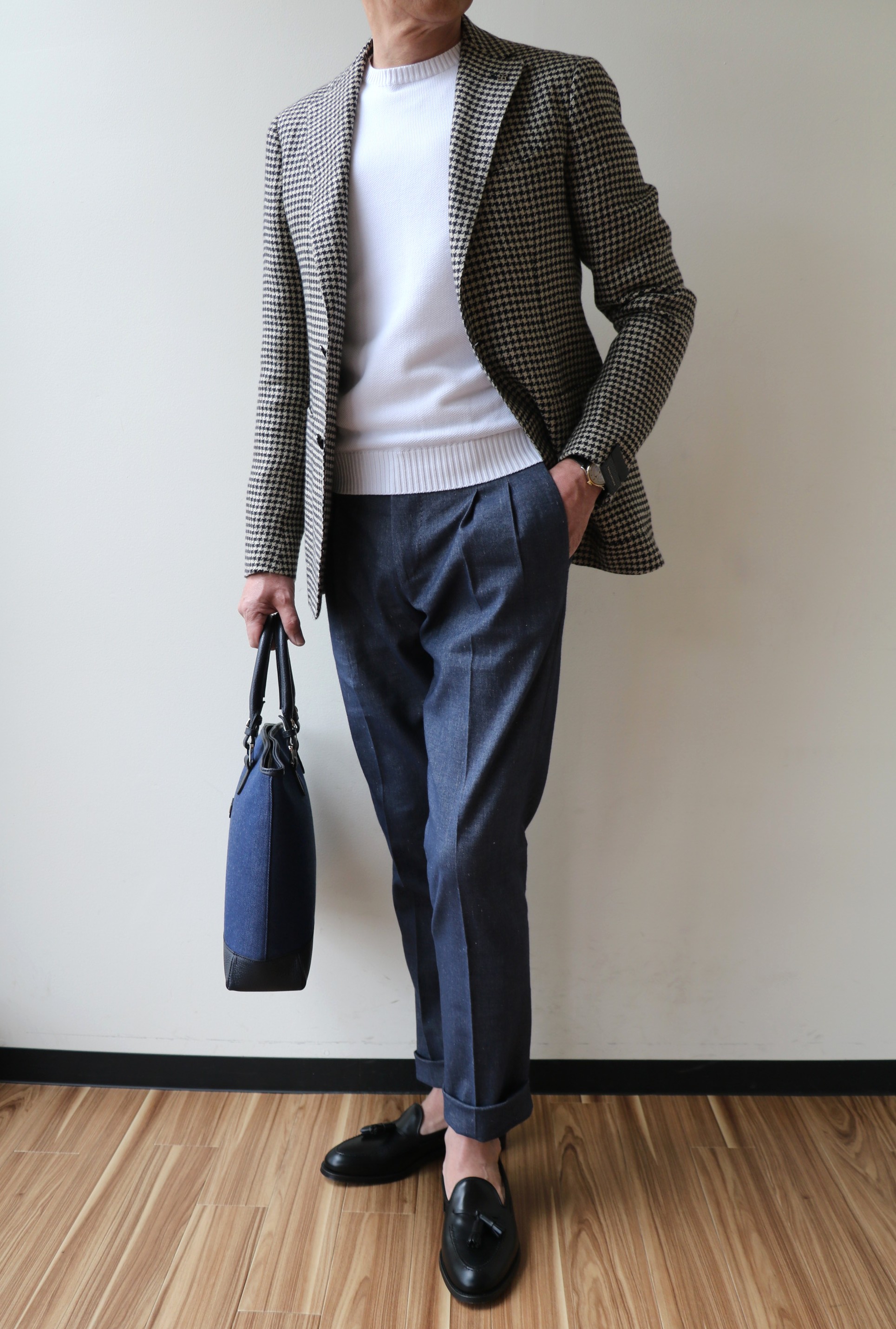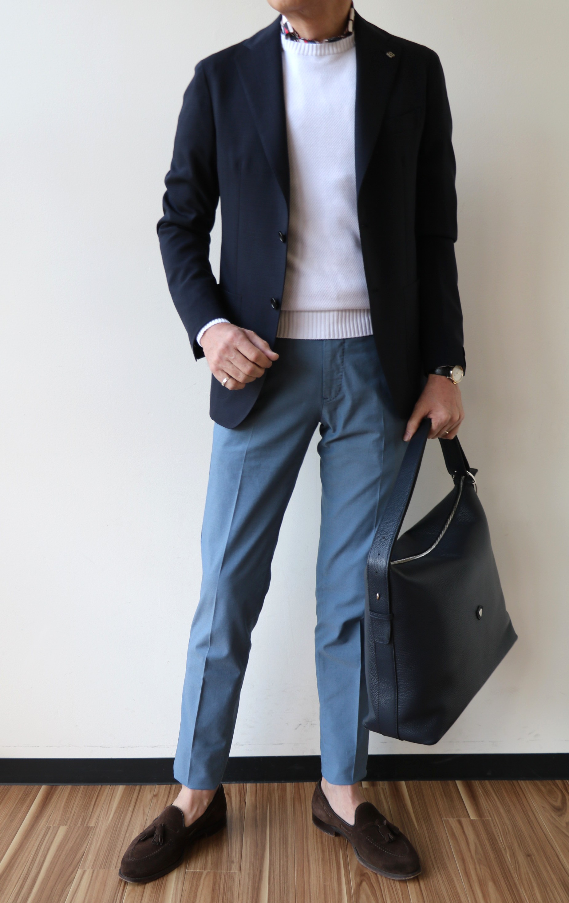 合わせたニットはFEDELI(フェデーリ)、パンツはPT01(ピーティーゼロウーノ)、靴はCROCKETT&JONES(クロケットアンドジョーンズ)、バッグはCHAMBORD SELLIER(シャンボール セリエ)です。