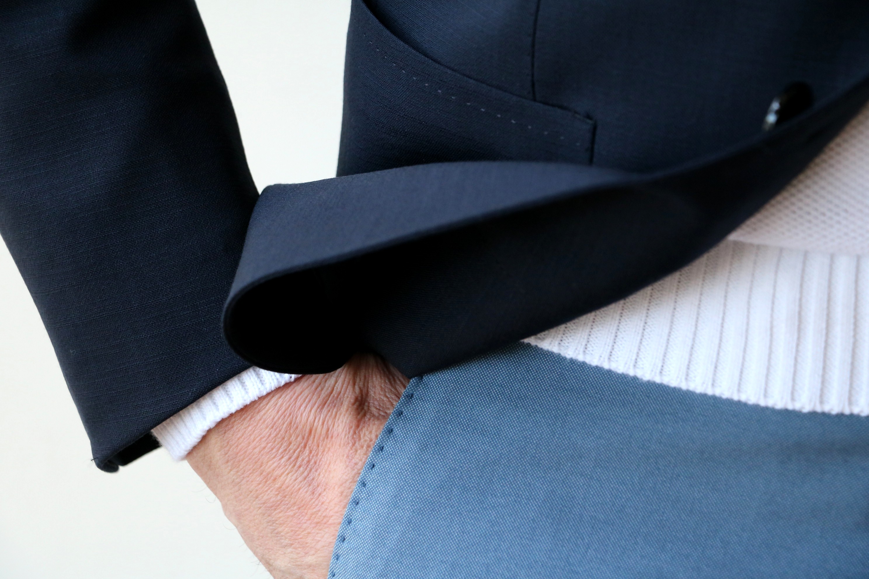 拡大していただくとわかりますが、タテヨコにハケメのような織り柄が入り、今までにないエレガントでクールな表情です。そして、織り柄が入ることで、同じ紺色でも奥行きのある色合いを醸しだします。