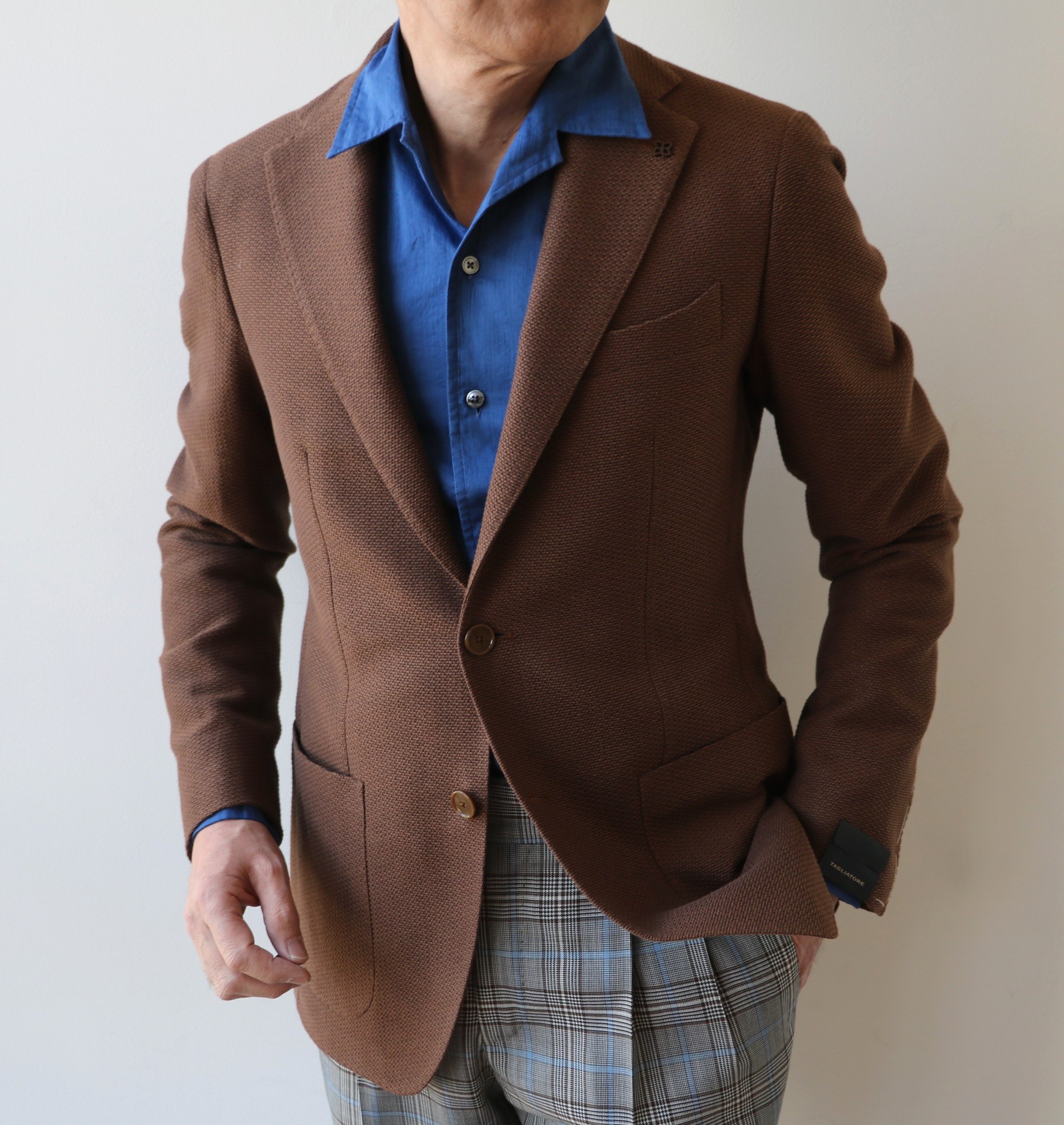 先陣を切るのは、芯地やパットを取り除いたアンコン仕立ての「SAHARA」。クラシックなキャメルのヘリンボーン柄を軽く、スポーティーに見せるのは、このモデルが最適でしょうか。