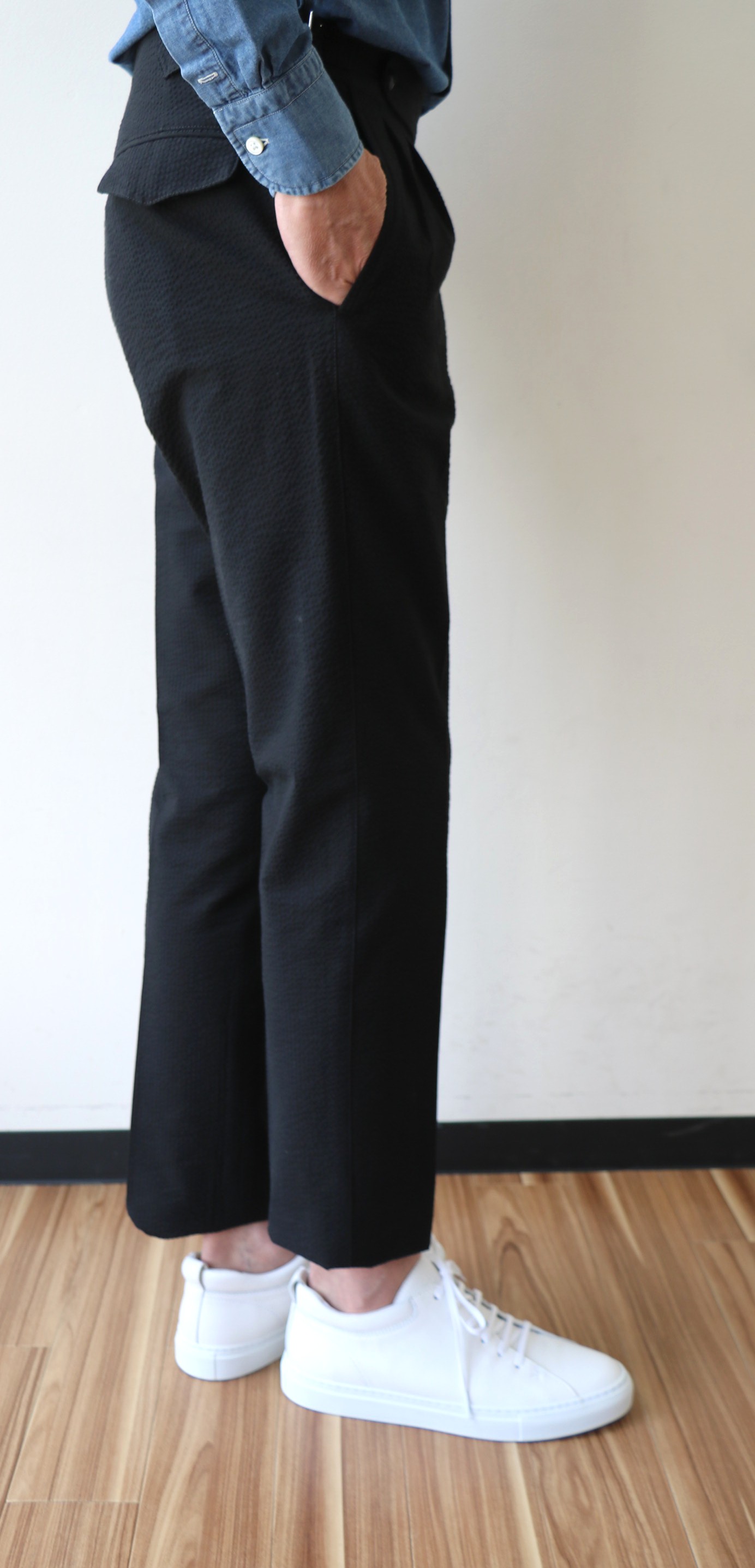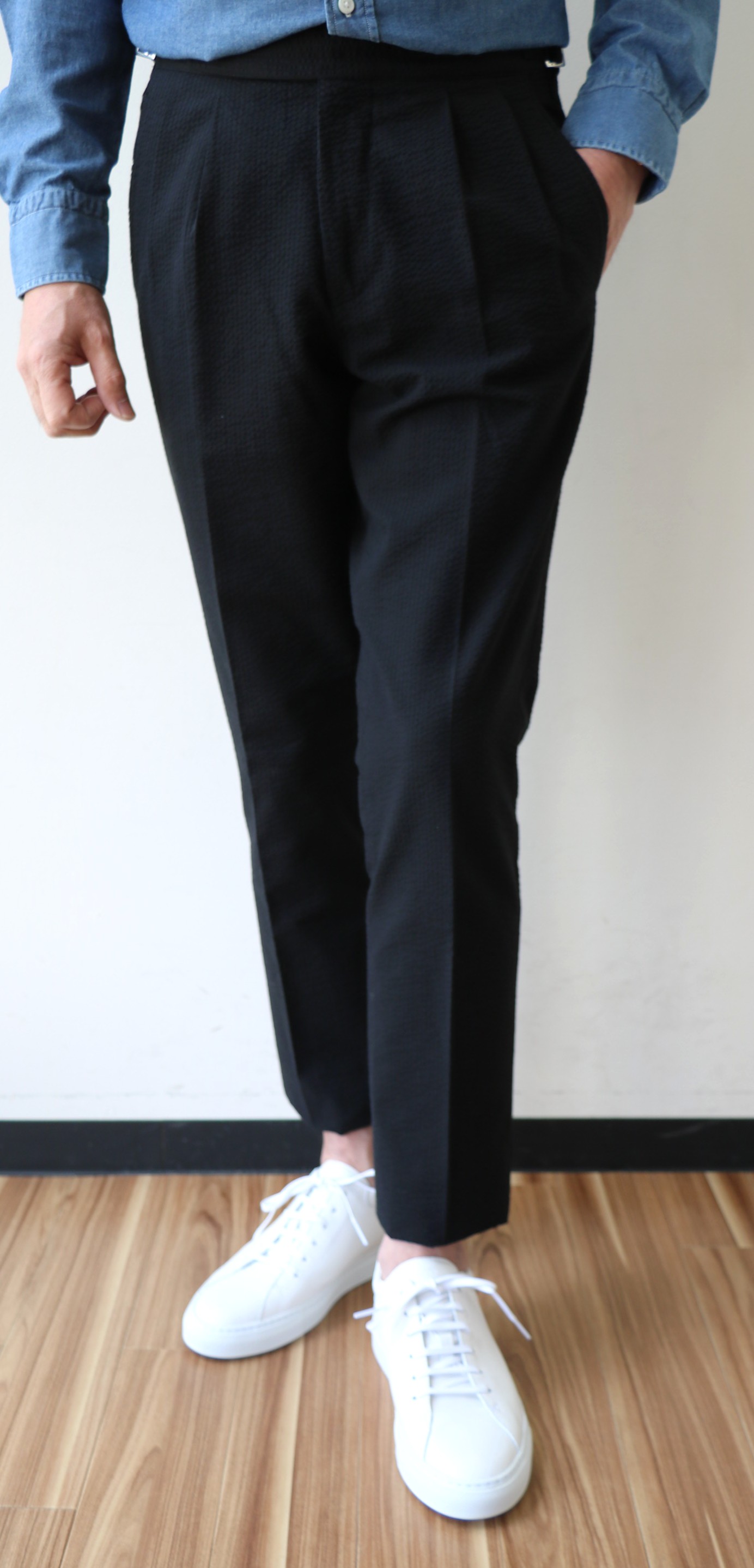 パンツのご案内です。展示会を回っていて、ときめきと同時に新鮮に感じたのが、ブラックのシアサッカー。ここ数年、トレンドカラーとして、様々なアイテムで提案されているブラック。特に夏の黒は、毎年、ファッション誌の紙面で特集が組まれるほどの人気カラー。夏の定番生地シアサッカーであったなら...そう考えるのは必然のことでしょう。あのナポリのDe Petorillo(デ ペトリロ)でさえ、コレクションに加えているぐらいですから、やはり気になるのは、シアサッカーのブラックなんです。