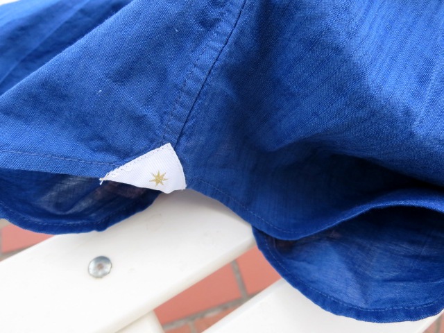 展示会で見て、これいい!!と絶賛の叫びを上げたのは、この柄だけではありません。使っている生地は、良く女性の春夏向けのブラウスに使われる透け感のある、薄手のコットンローン。薄手なのにハリコシもあります。写真では分かりづらいかもしれませんが、目を凝らして裏地の色を見てください。もともとはホワイトとネイビーの配色ですが、表面を黄色の顔料で染める事で、ヴィンテージ感のある仕上がりです。