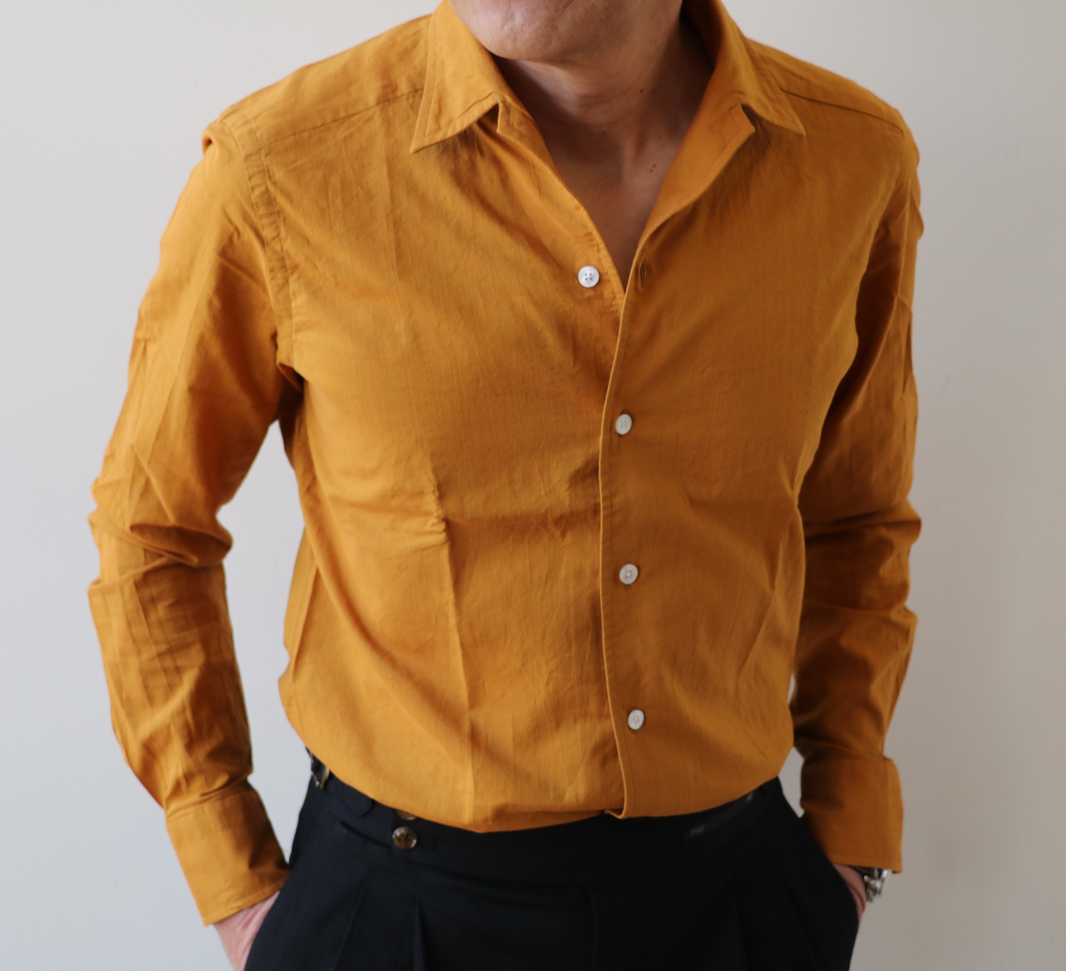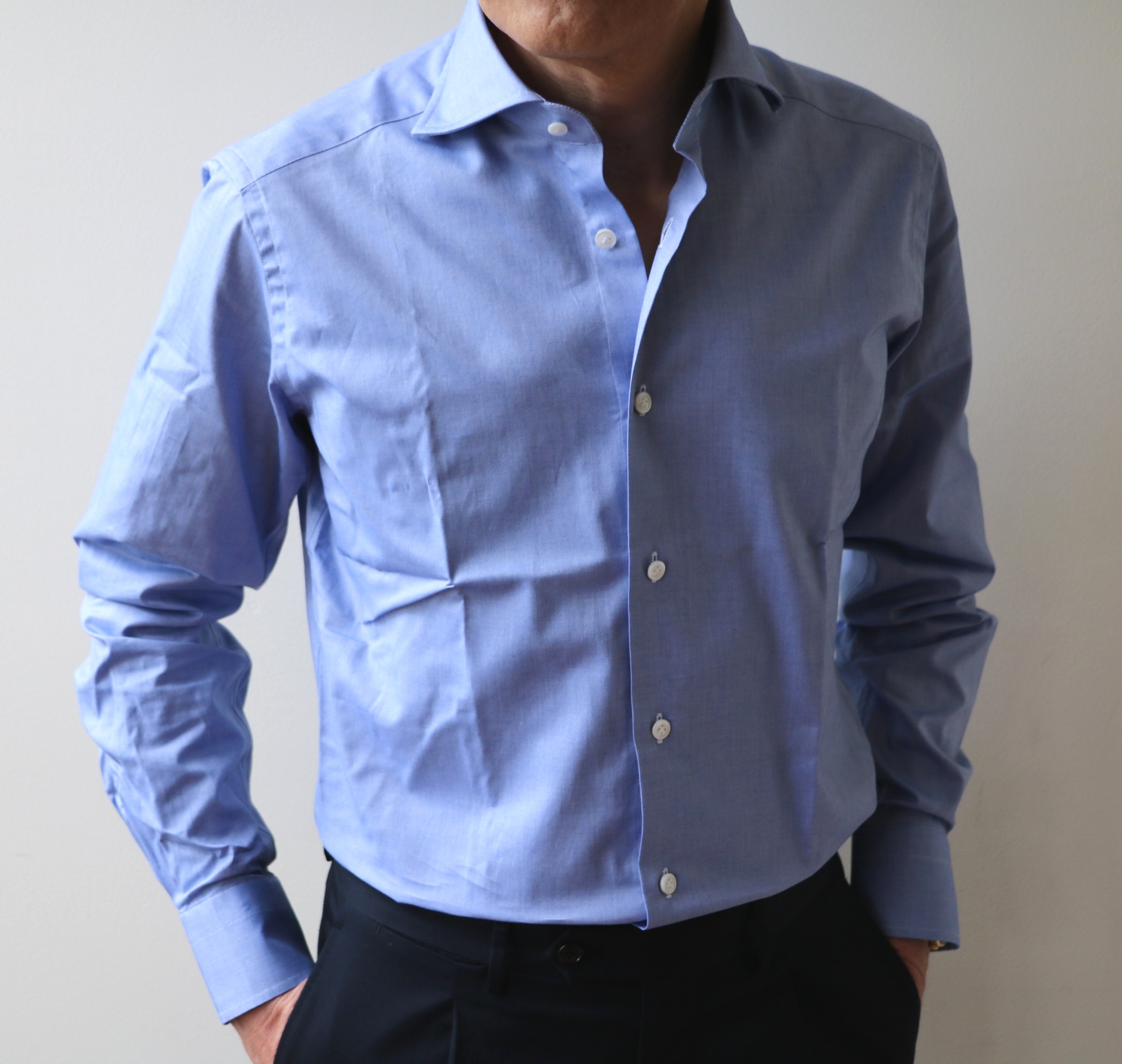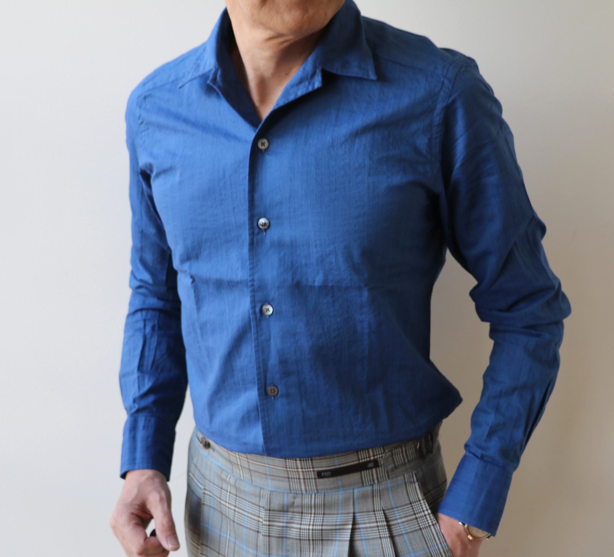襟についてです。台襟付きのワンピースカラーは、オープンカラー(開襟シャツ)のようにラフになり過ぎず、ジャケットを羽織った際もきれいに見せることができます。また半袖ではなく長袖を選んだ理由も、ジャケットを羽織ることを意識してのことです。夏の装いに優雅さを求めるなら、長袖を選ぶべきでしょうね。