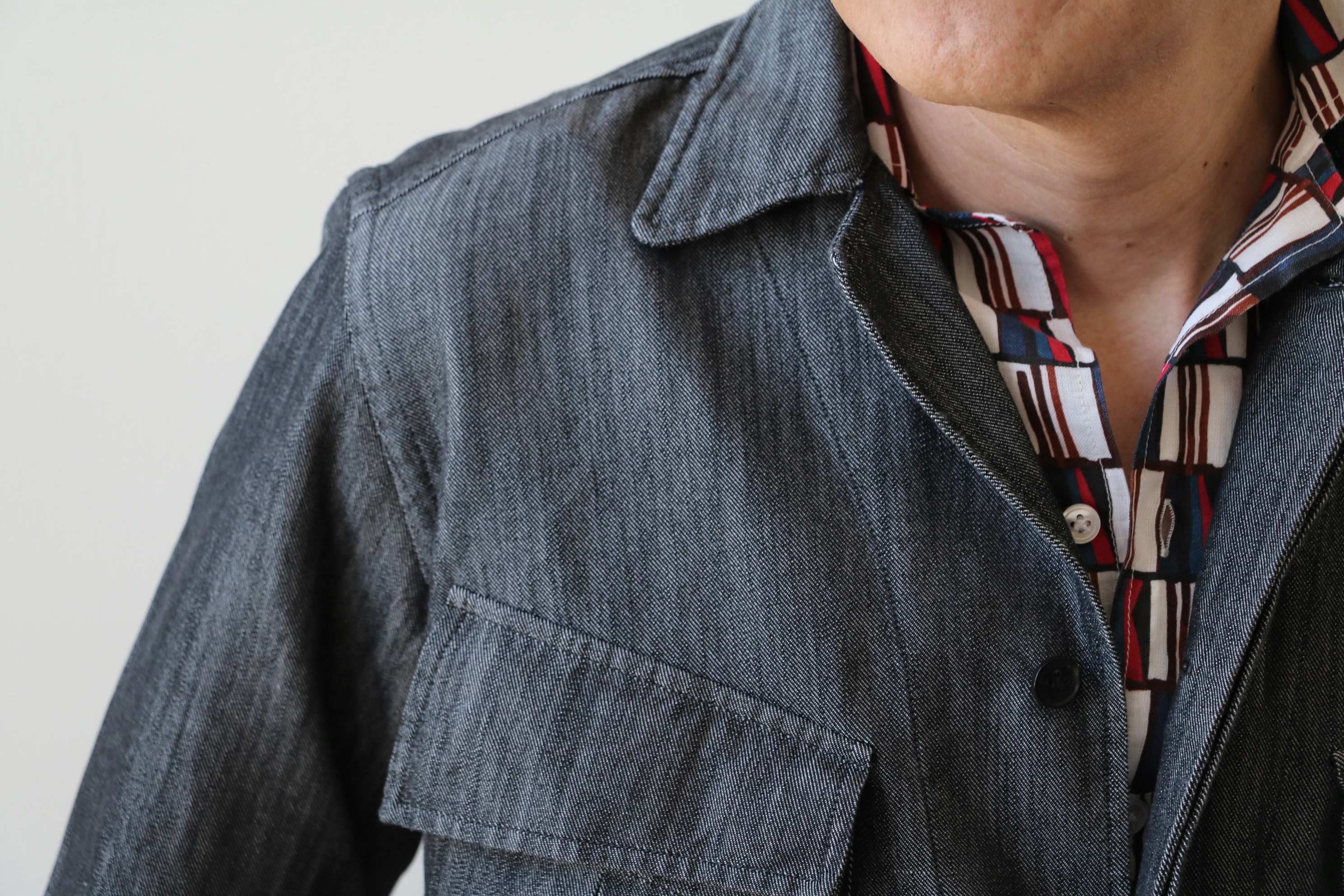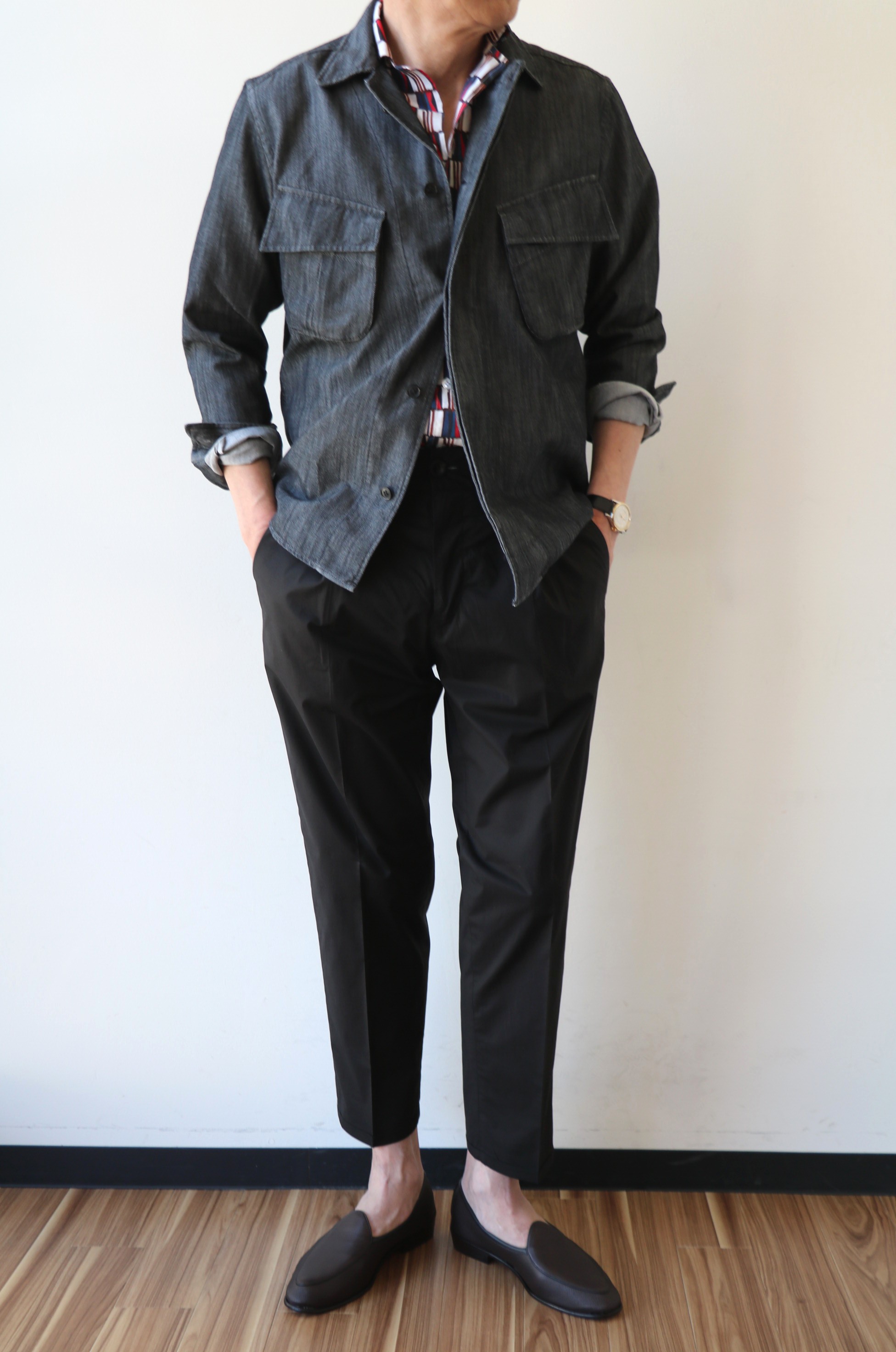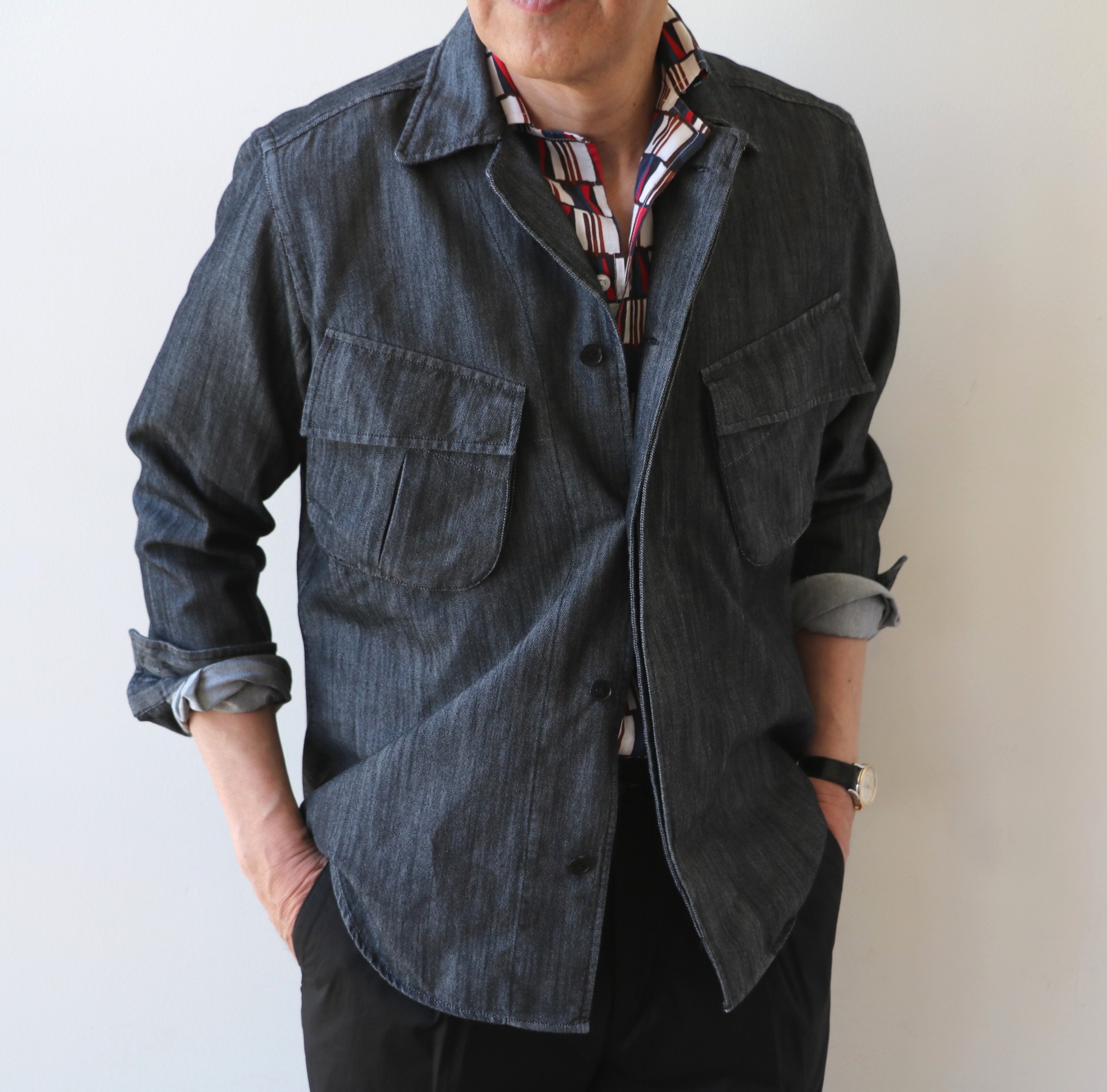 オックスフォード地より、打ち込みのある、やや厚手のコットン地。洗いをかけることで、ブラックの強い色が和らぎ、抜け感のある雰囲気に。ビンテージ感を求めるなら、このシャケット「BRAD」でしょうか。
