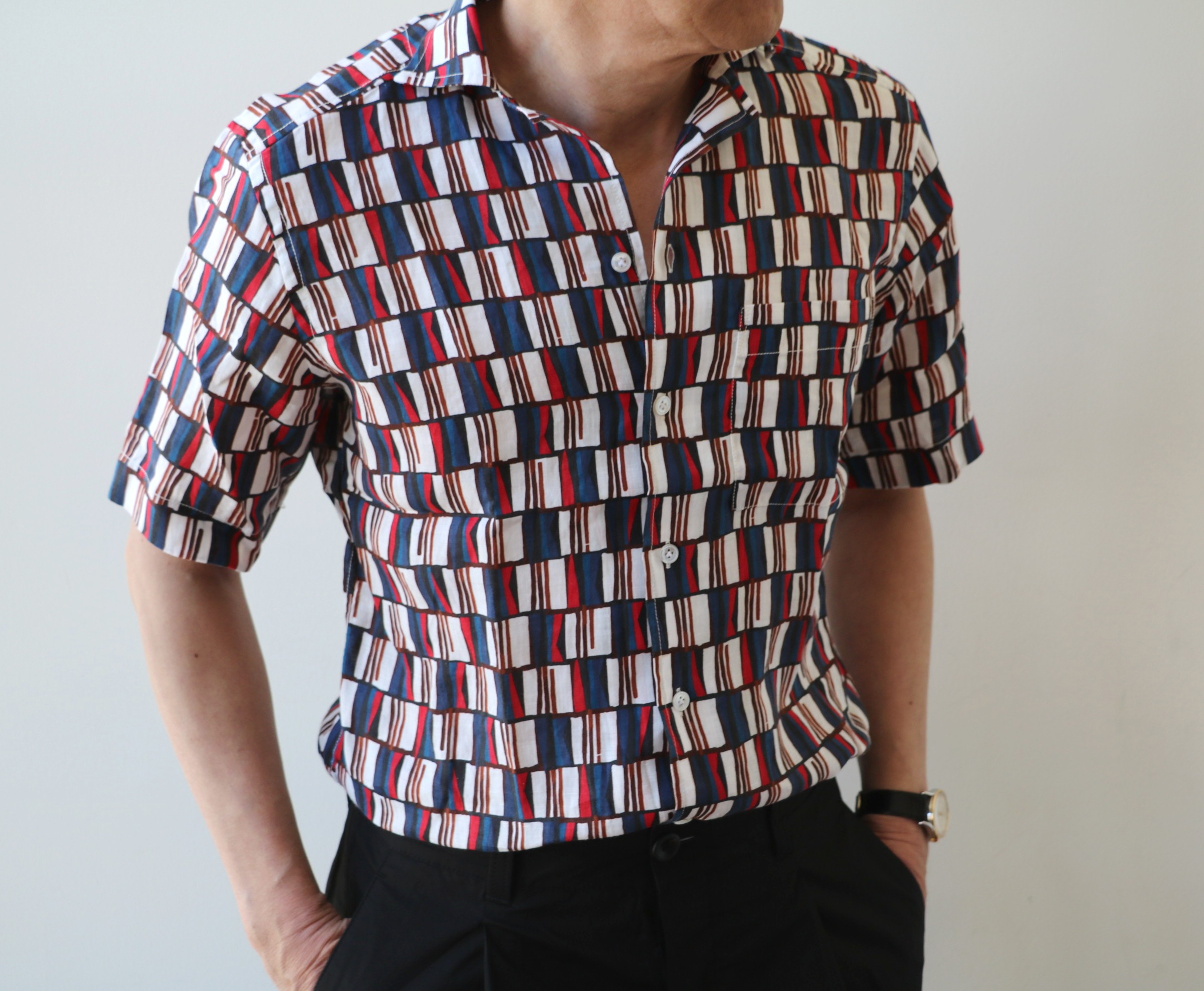 パンツをベージュに戻し、FEDELI(フェデーリ)のTシャツに羽織ったのは、同じオープンカラーの「MAUI」。この夏、フラのイベントがあれば、着て踊りたいシャツです。生地は、薄手のコットンローン。前回ご紹介させていただいた「JOHNNY」と同じ生地です。風鈴のように涼しげな音色を奏でてくれる、そんなシャツです。