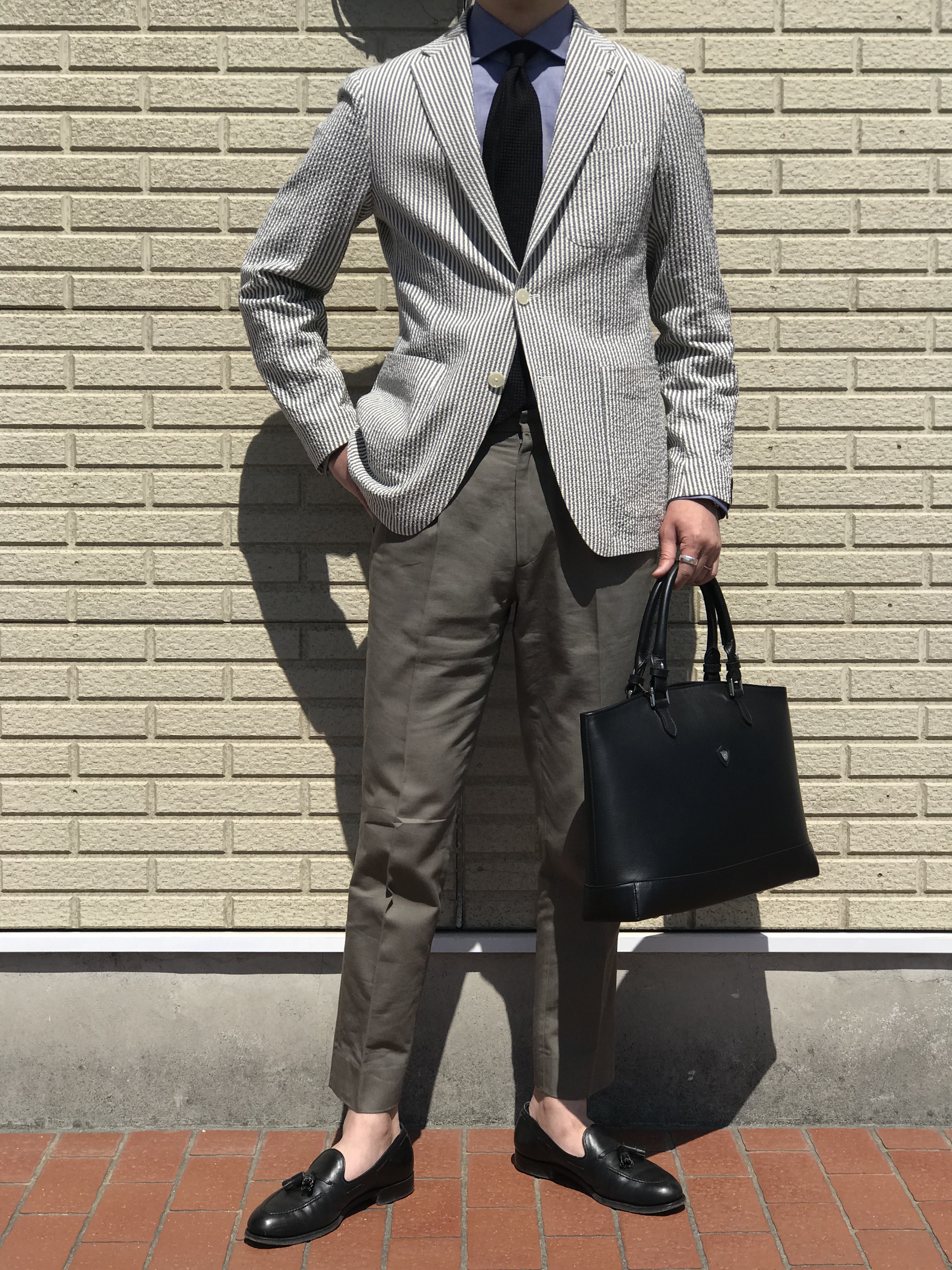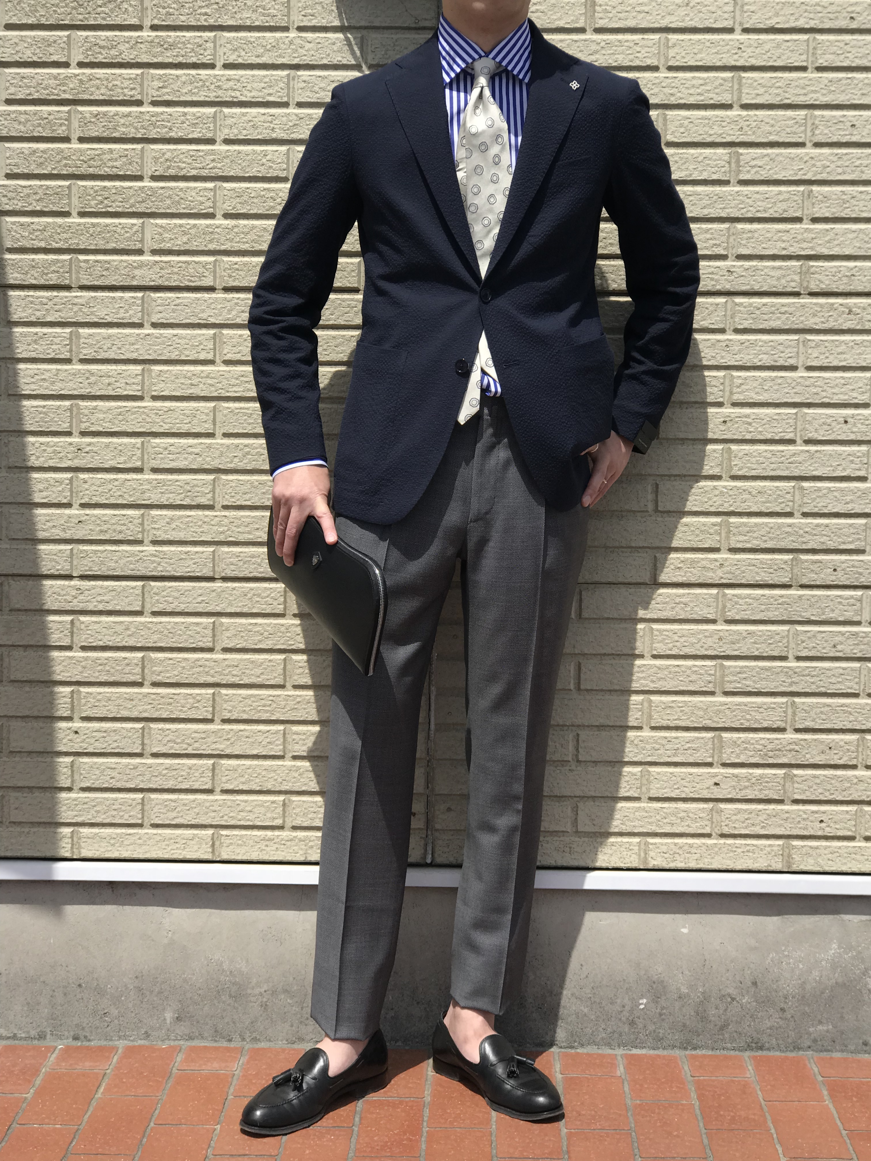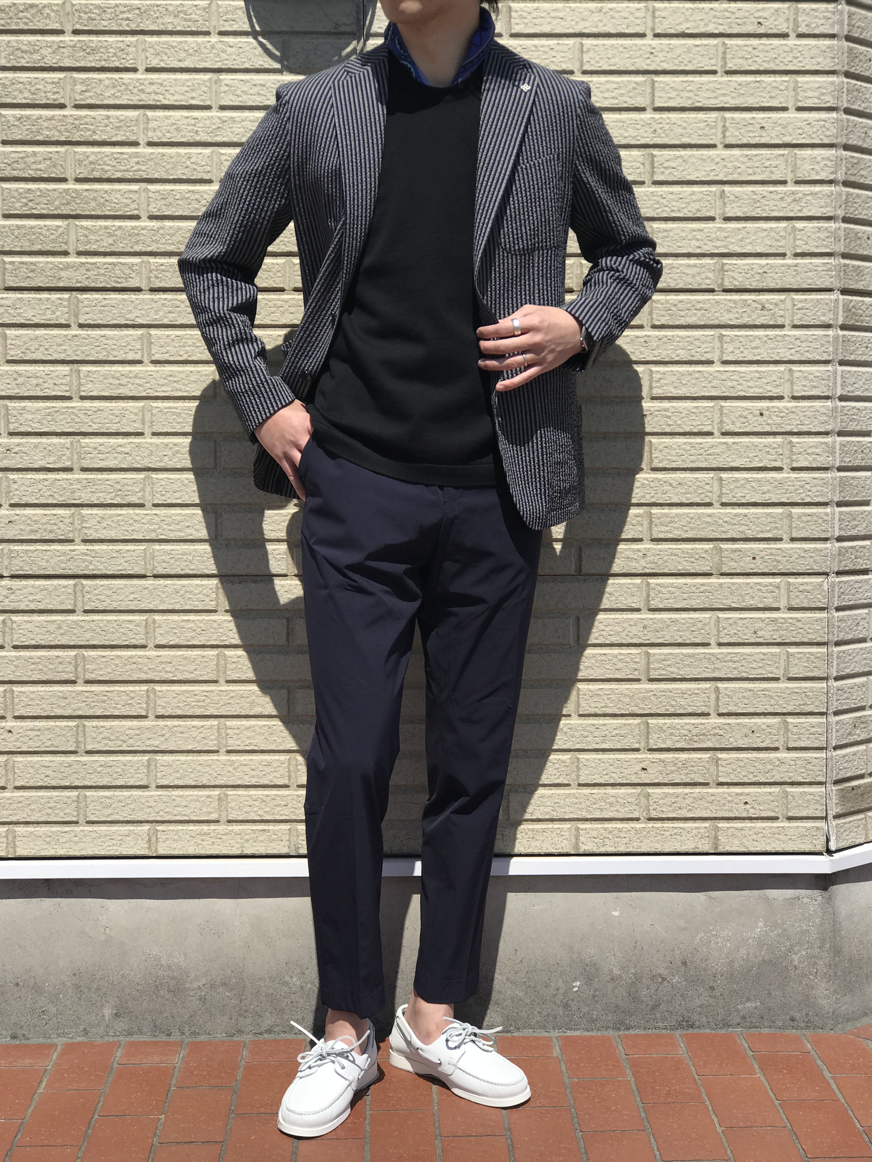 アイボリー×ネイビーは、タイドアップを。一見、トラディショナルなスタイルも、軽快なサッカー地とHolliday&Brownのフレスコタイが、新しい時代のビジネスシーンを印象付けます。グレイ×ネイビーは、BorelioのナイロンパンツとJOHN SMEDLEYの24Gクルーネックニットでリラックススタイルに。上の画像ではTHE GIGIのパーカに合わせたり、ジャケットを普段着として楽しめます。