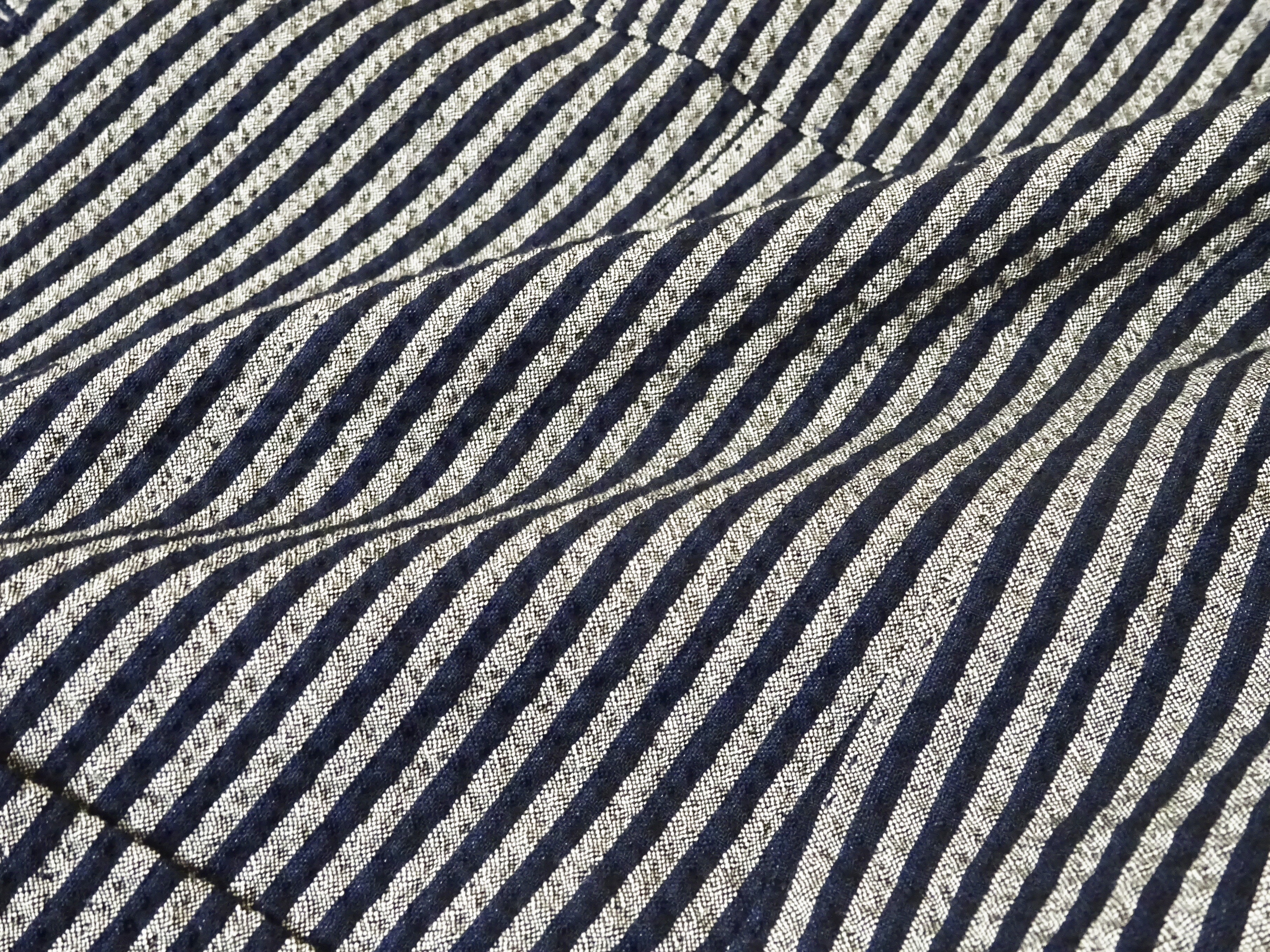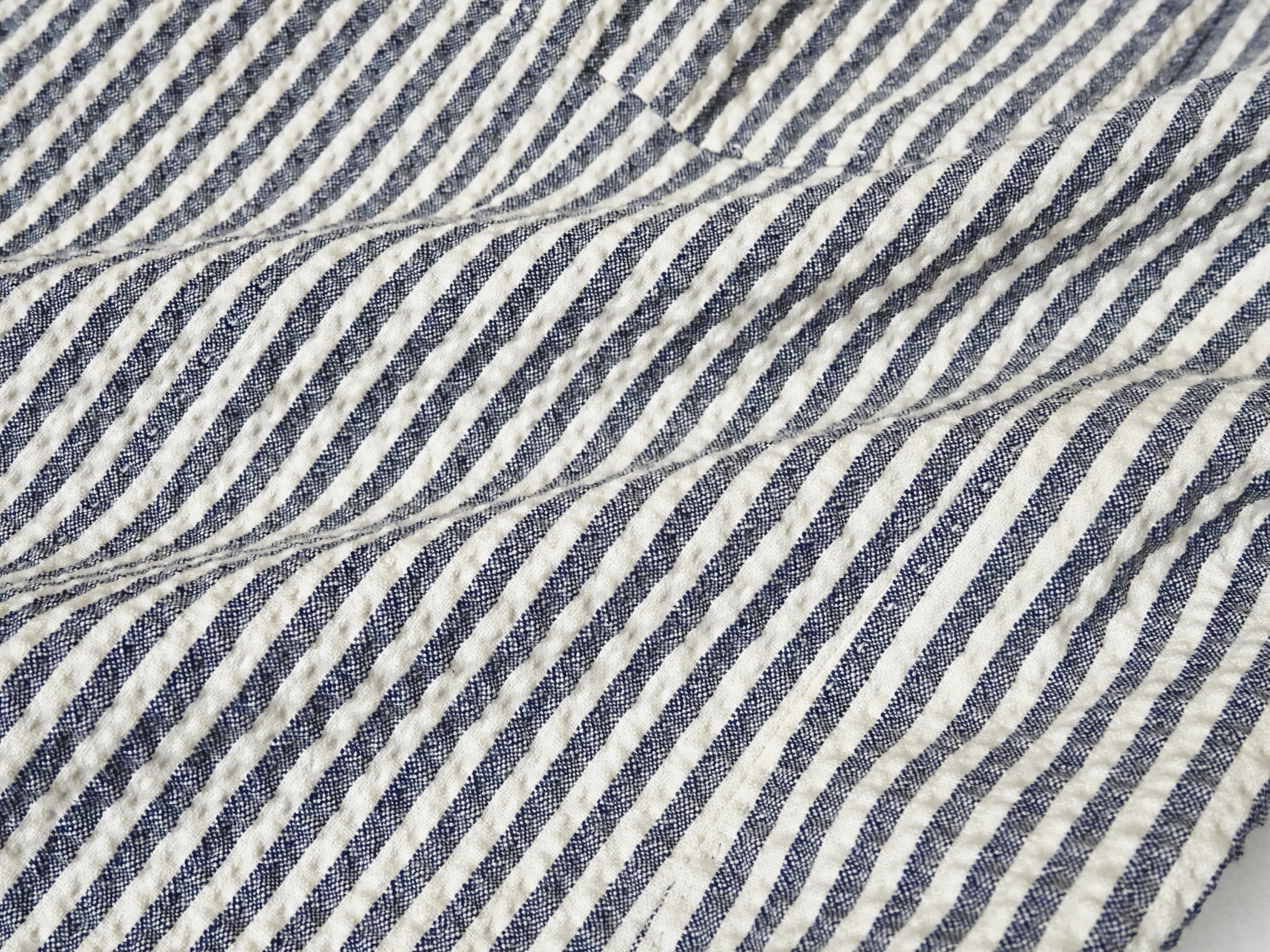 まずは、4パターンを一気にご覧頂きました。全て同じ素材のシアサッカー生地ですが、ストライプと無地タイプの2型に分かれ、ストライプはアイボリー×ネイビーとグレイ×ネイビーの2色を、そして無地タイプもネイビーとグレイの2色をご用意しています。