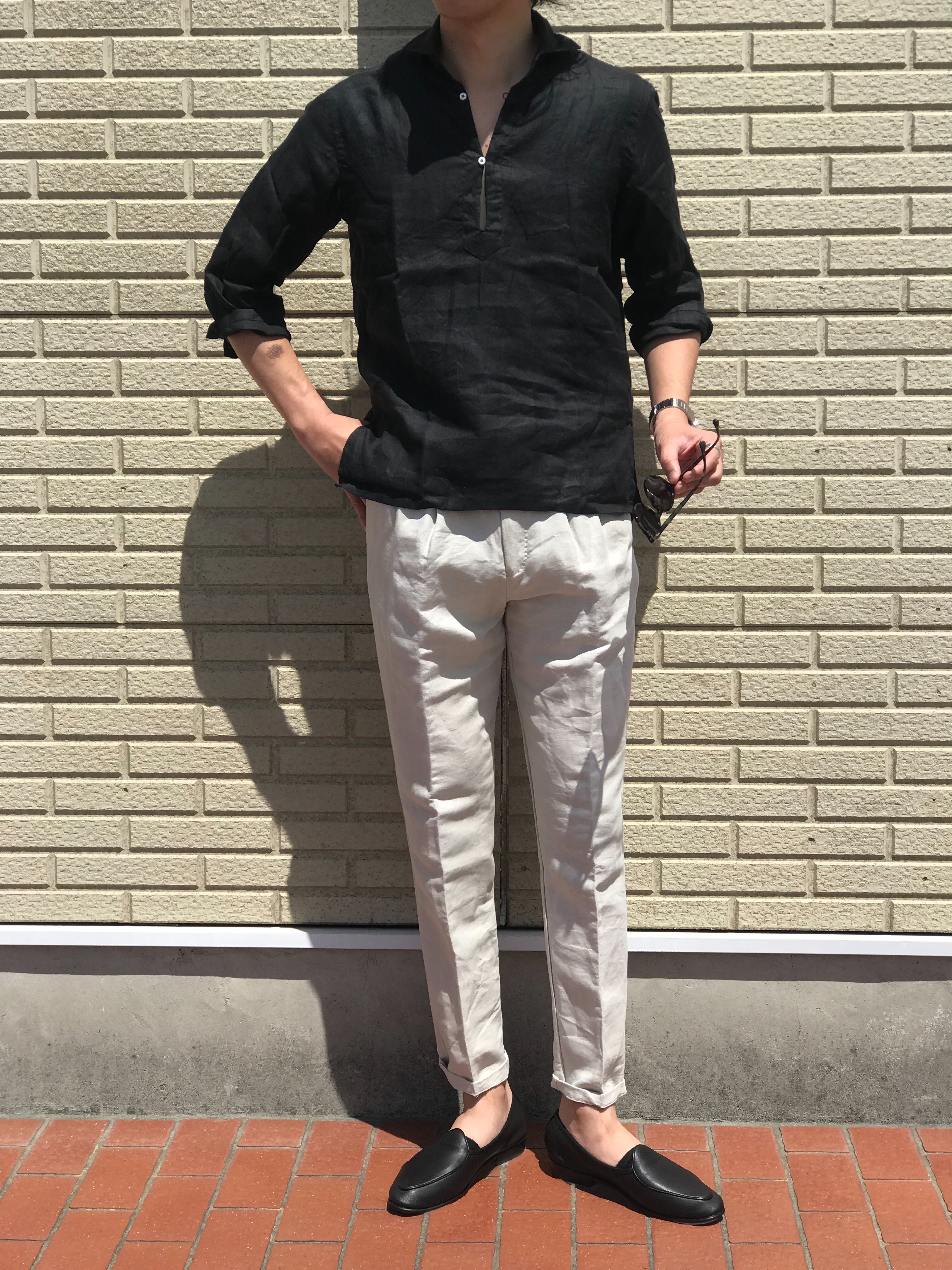 ブラックには、VAGANOのリネン・コットン ドローコード付シャーリングパンツを合わせました。
