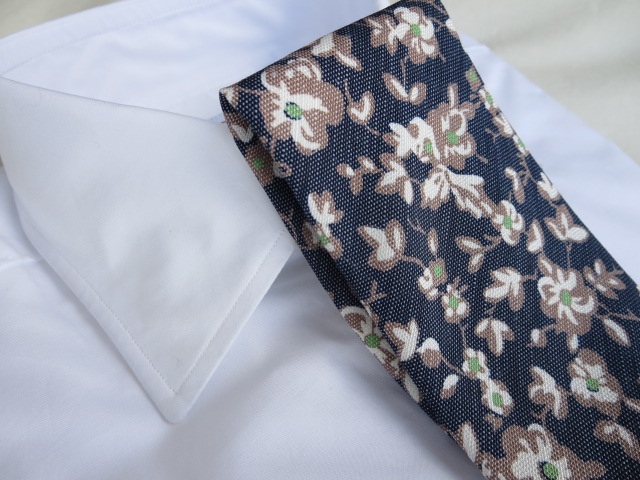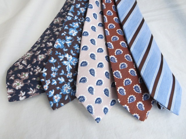 シルク・リネンのコレクションは、向かって右のストライプ柄のみシルク53%・リネン47%。後のペイズリーと花柄は同比率のブレンドになります。掠れ感のある涼しげな生地感。締めるだけで、心地良い風にのって爽やかな香りが漂ってきそうな、そんな居心地の良いネクタイです。