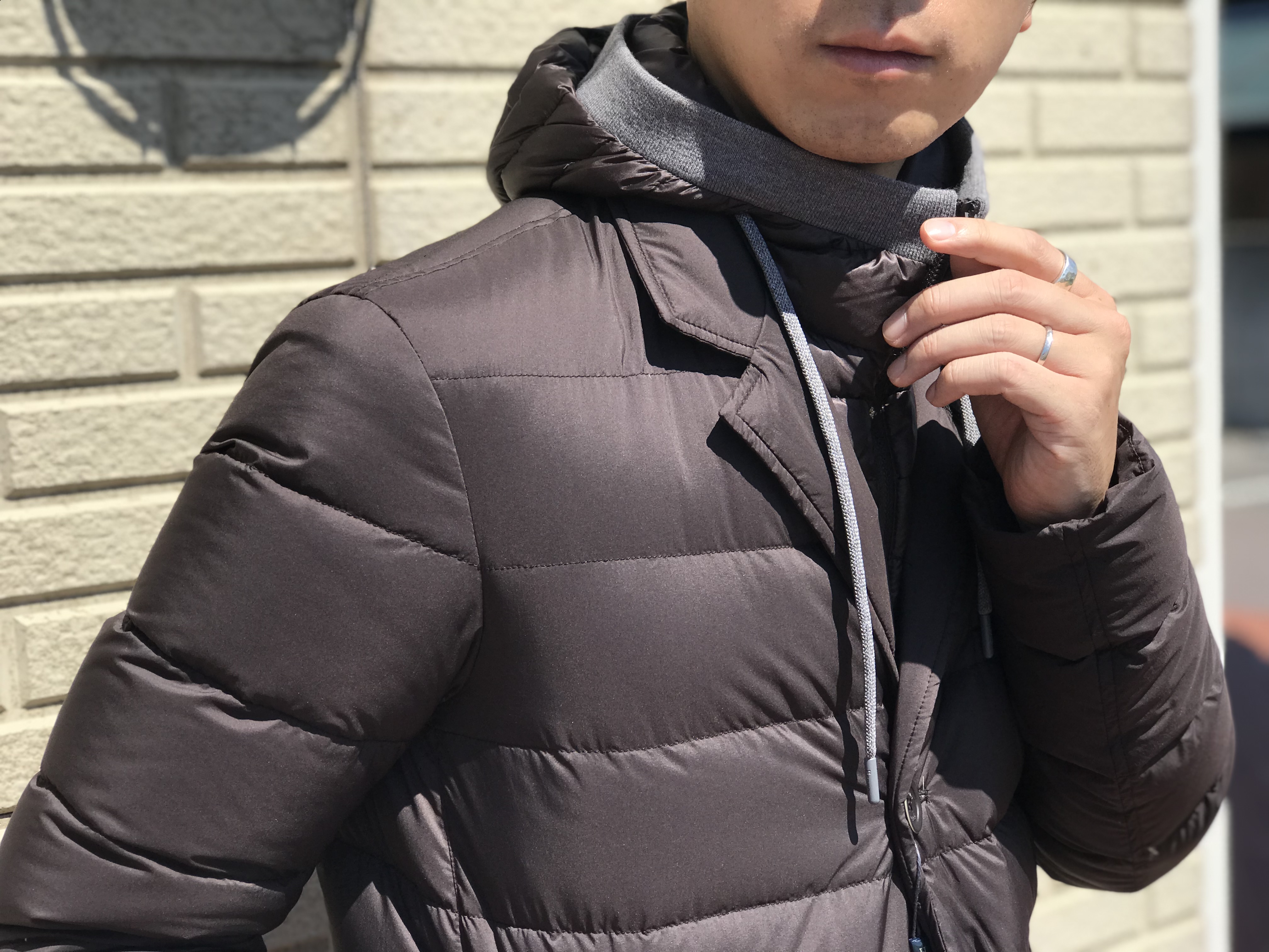 続いても、レイヤードタイプ。レイヤード部分がフードというスポーティなデザインで、チェスターコートをベースにしたダウンコートは、驚くほどに軽量です。