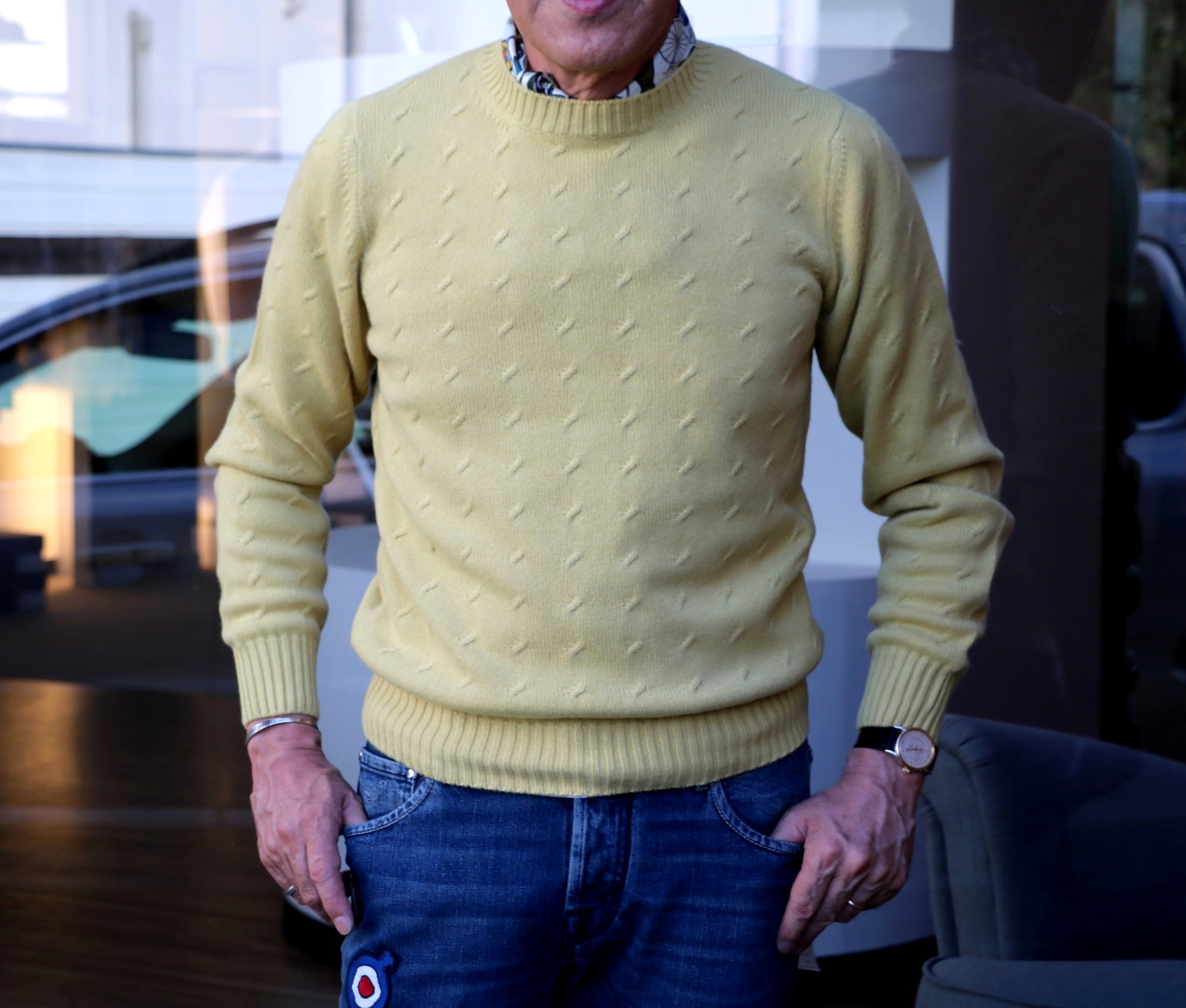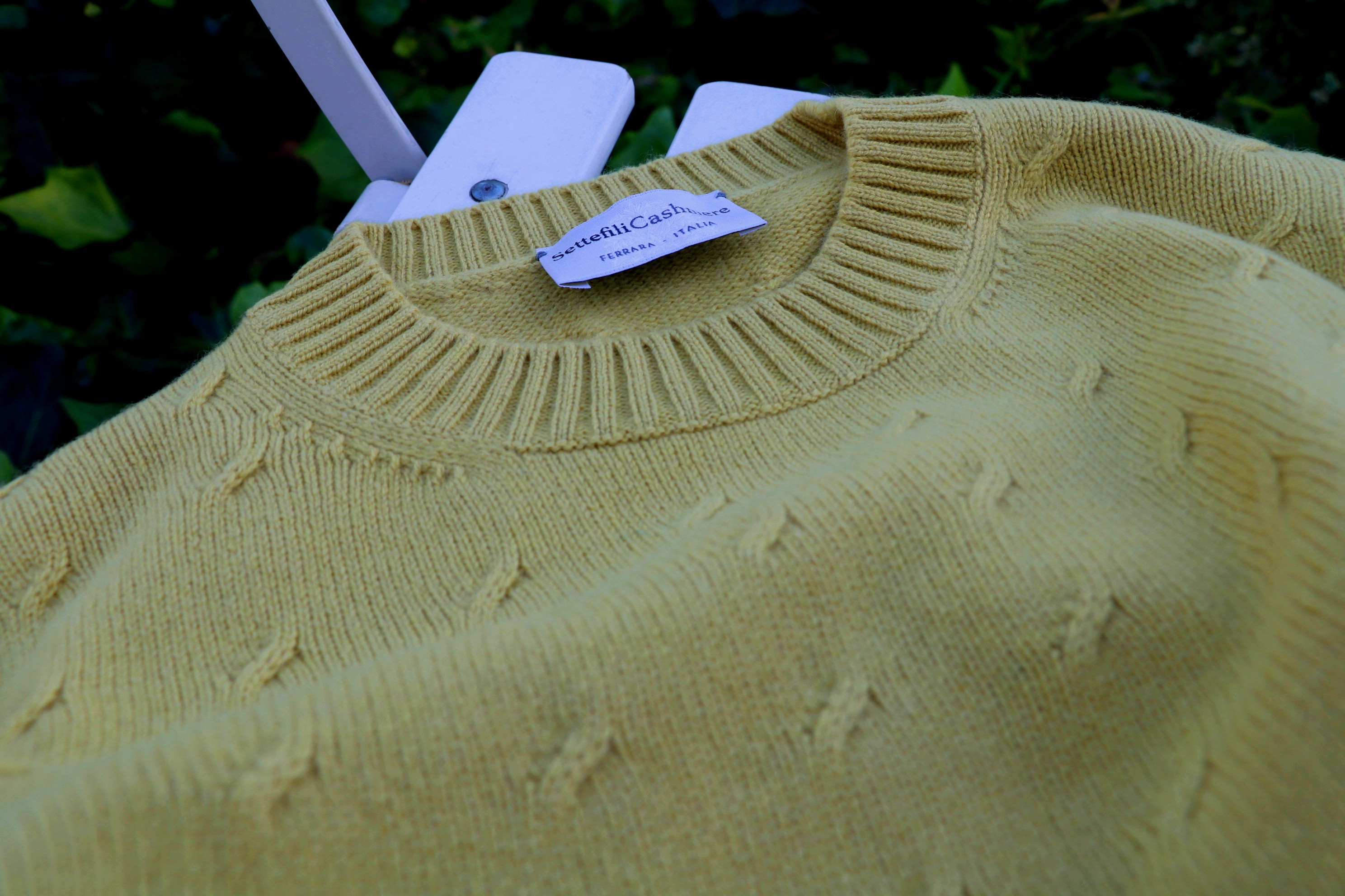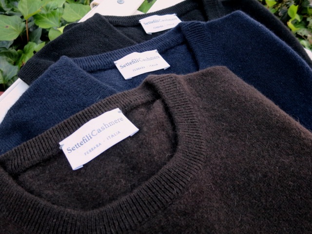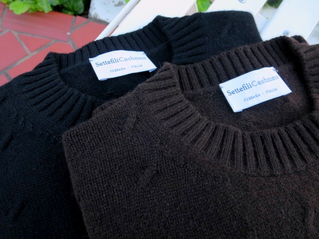 時計の針は、17時を回りました。暑さに慣れたのでしょうか、この時間になると、不思議に涼しいとさえ感じます。それでも、このセーターを着るのは、まだまだ先のこと。【Settefile Cashmere/セッテフィーリ カシミア】のミドルゲージのクルーネックセーターのご紹介です。飛びケーブル柄とでも言うのでしょうか。シンプルでありながら、表情豊かなニットです。