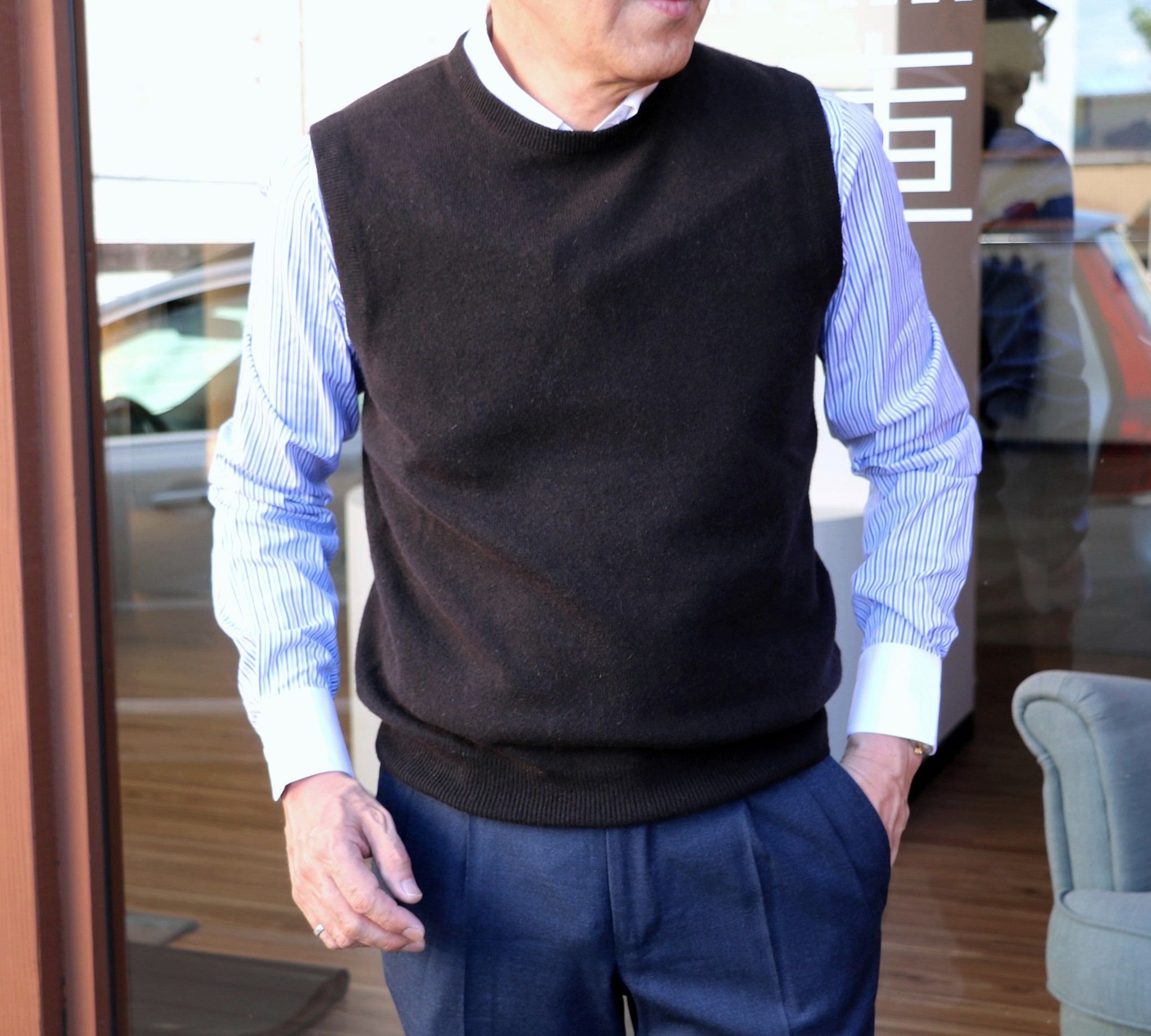 コーディネート写真の上から、ネイビー、ダークブラウン、ブラックの基本3色です。レザーブルゾンやジャケットのインなど、嵩張らずに温度調整できる優れもの。Vネックでは、襟元が寒いし、なんとなくオヤジ臭い...なんてオヤジ好みのラウンドネックニットベストでした。![]()