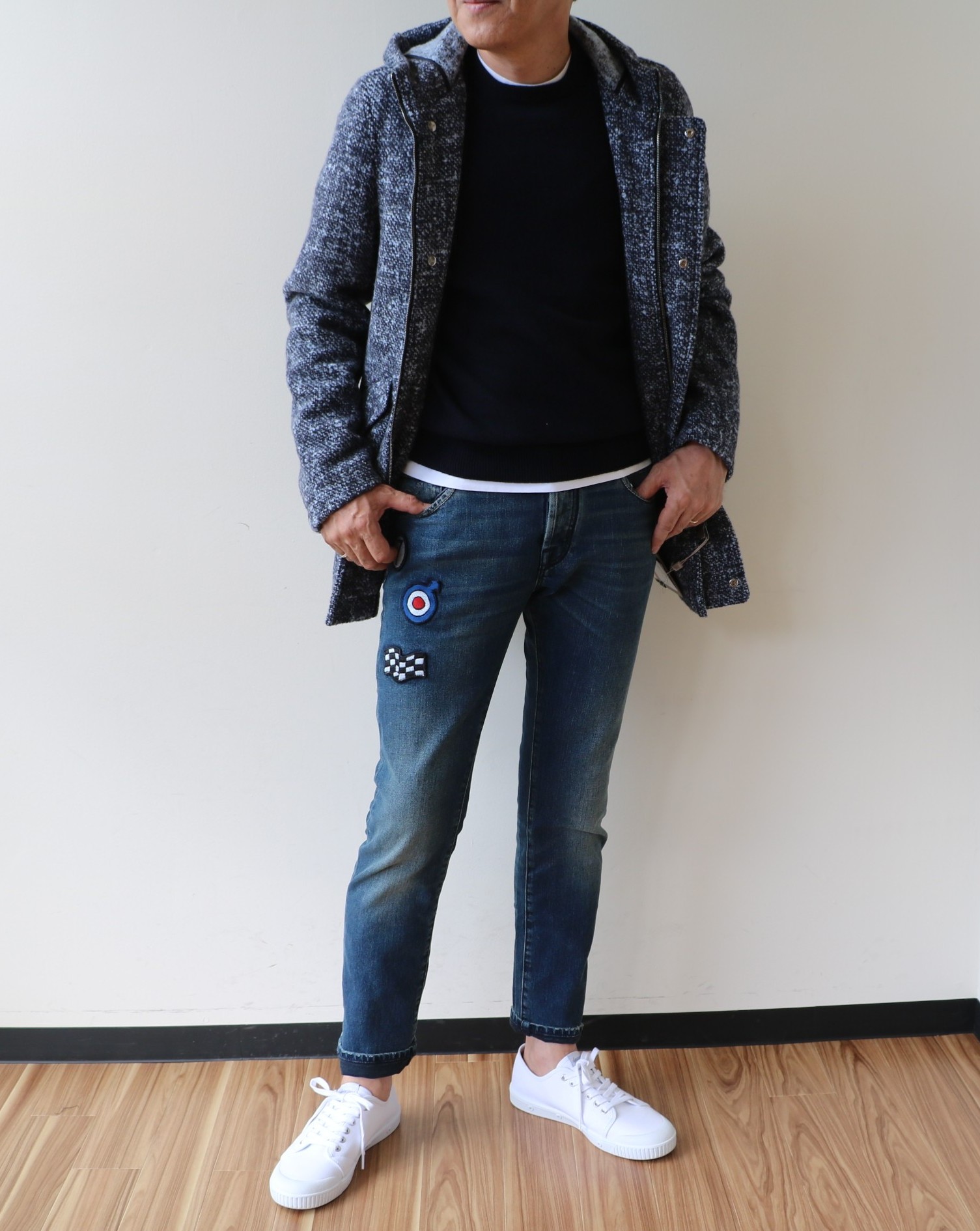 イエローで合わせたデニムはJACOB COHEN(ヤコブ コーエン)、ブラウンのデニムはRICHRAD J. BROWN(リチャード ジェイ ブラウン)、ブラックのパンツはElective(エレクティブ)。スニーカーはSUPERGA(スペルガ)、ローファーはCROCKETT&JONES(クロケットアンドジョーンズ)、肩にかけているバッグはDE.CO.CA(デーコカ)です。