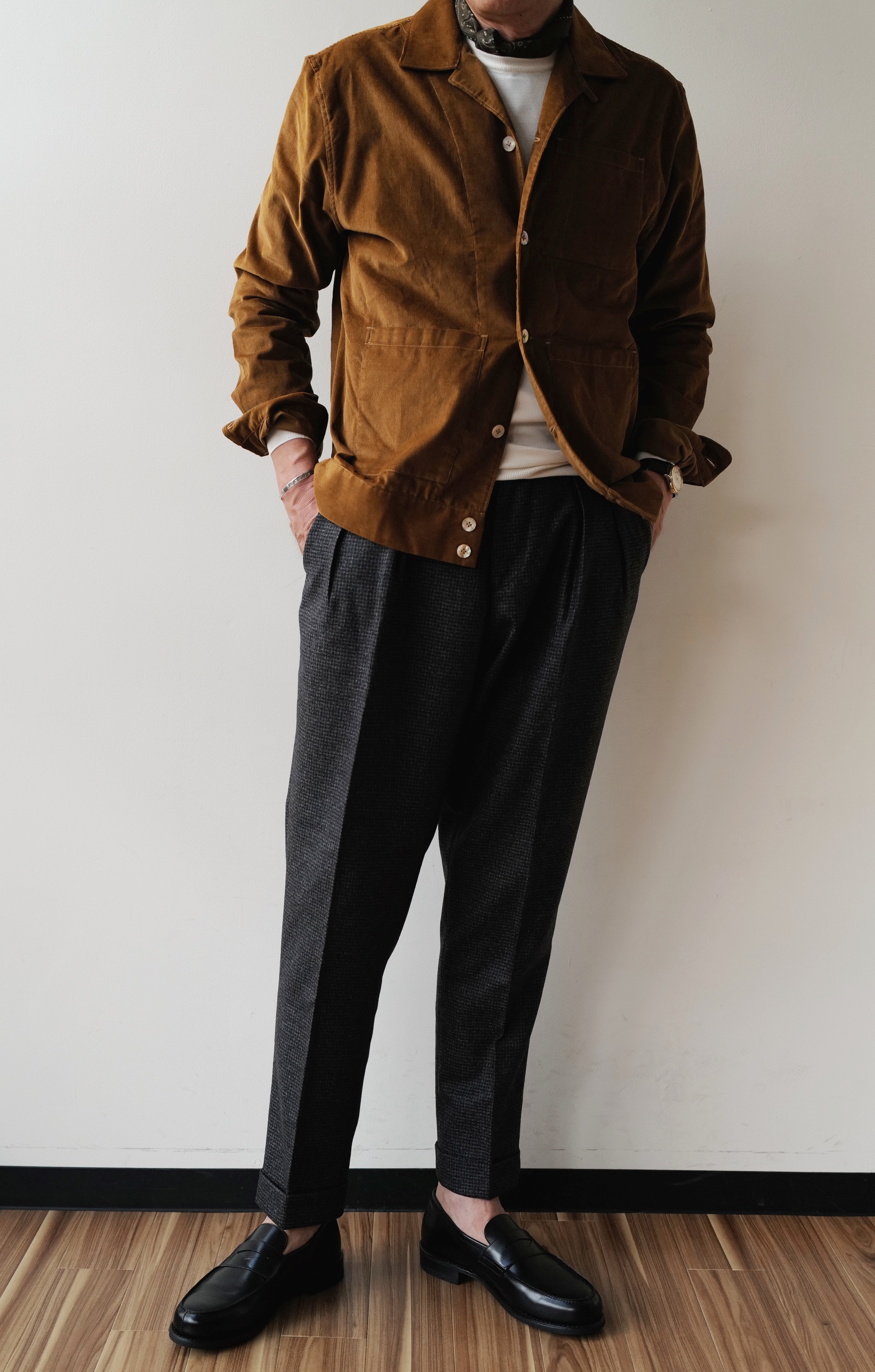 羽織ったジャケットはTHE GIGI(ザ ジジ)、ニットはFILIPPO DE LAURENTIIS(フィリッポ デ ロウレンティス)、靴はParaboot(パラブーツ)を履いております。
