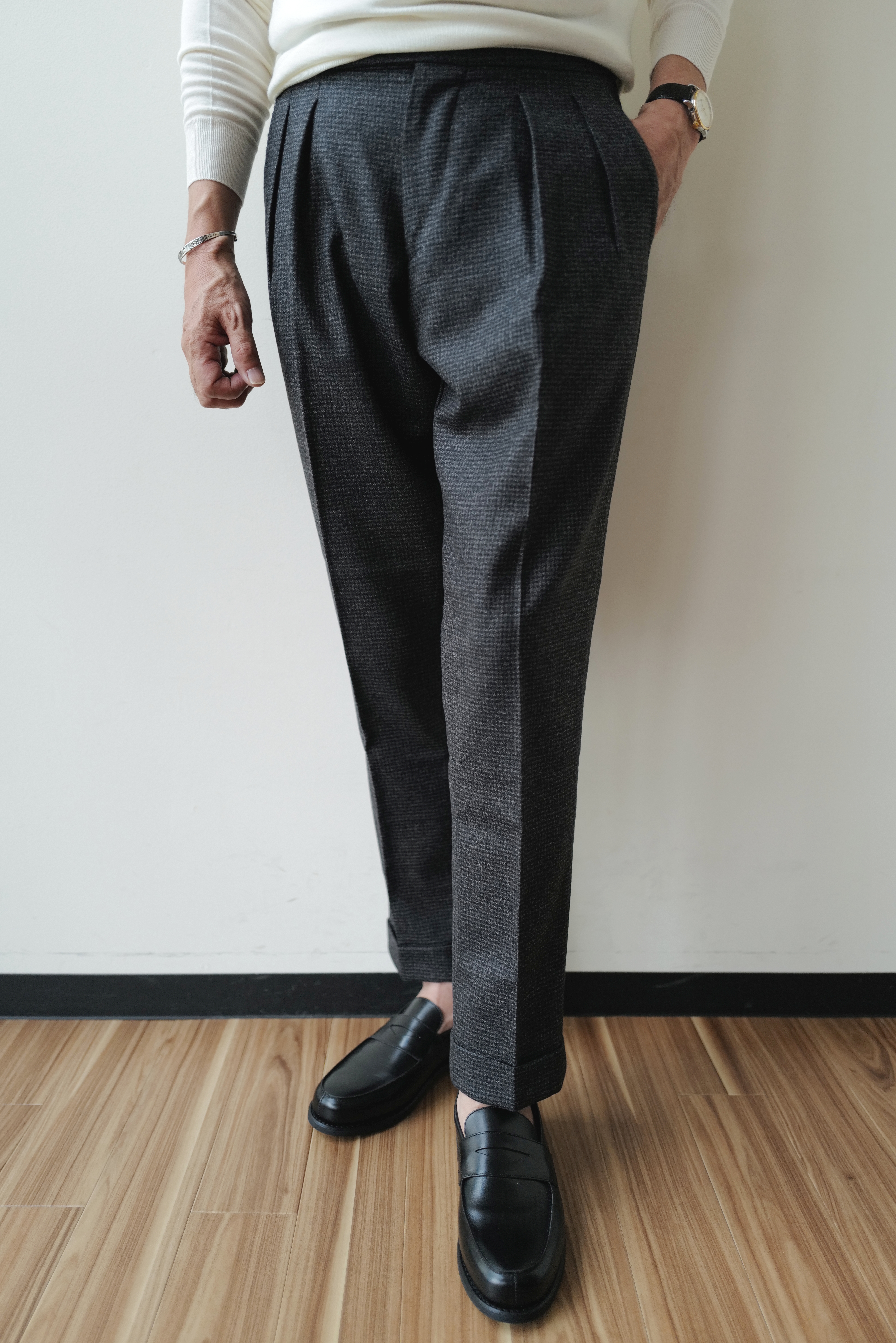 同じモデル「SCOTCH」で、もう一型ご用意しました。ワークススタイルを上品にまとめるには、クラシック柄のウールパンツが最適です。
