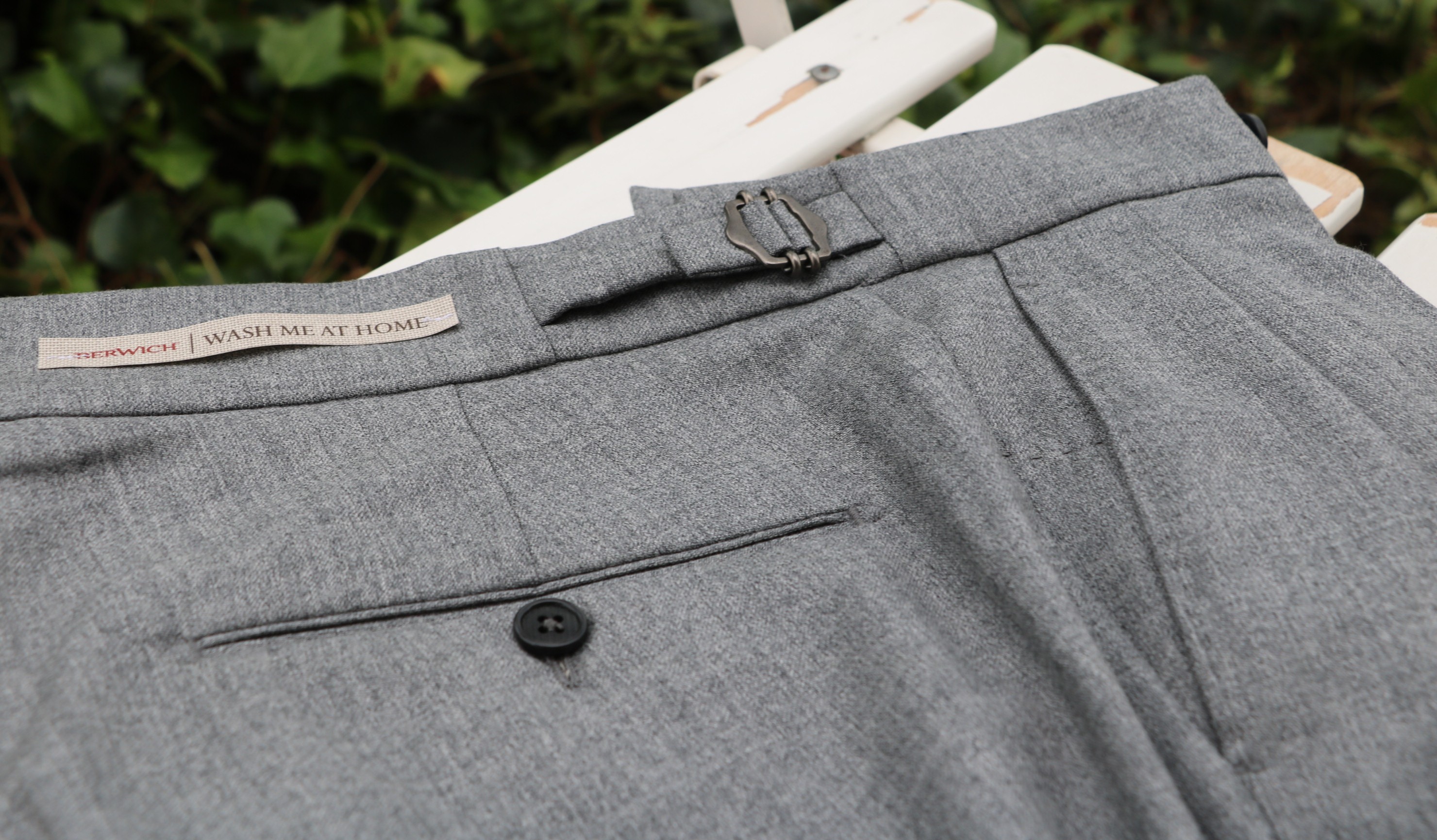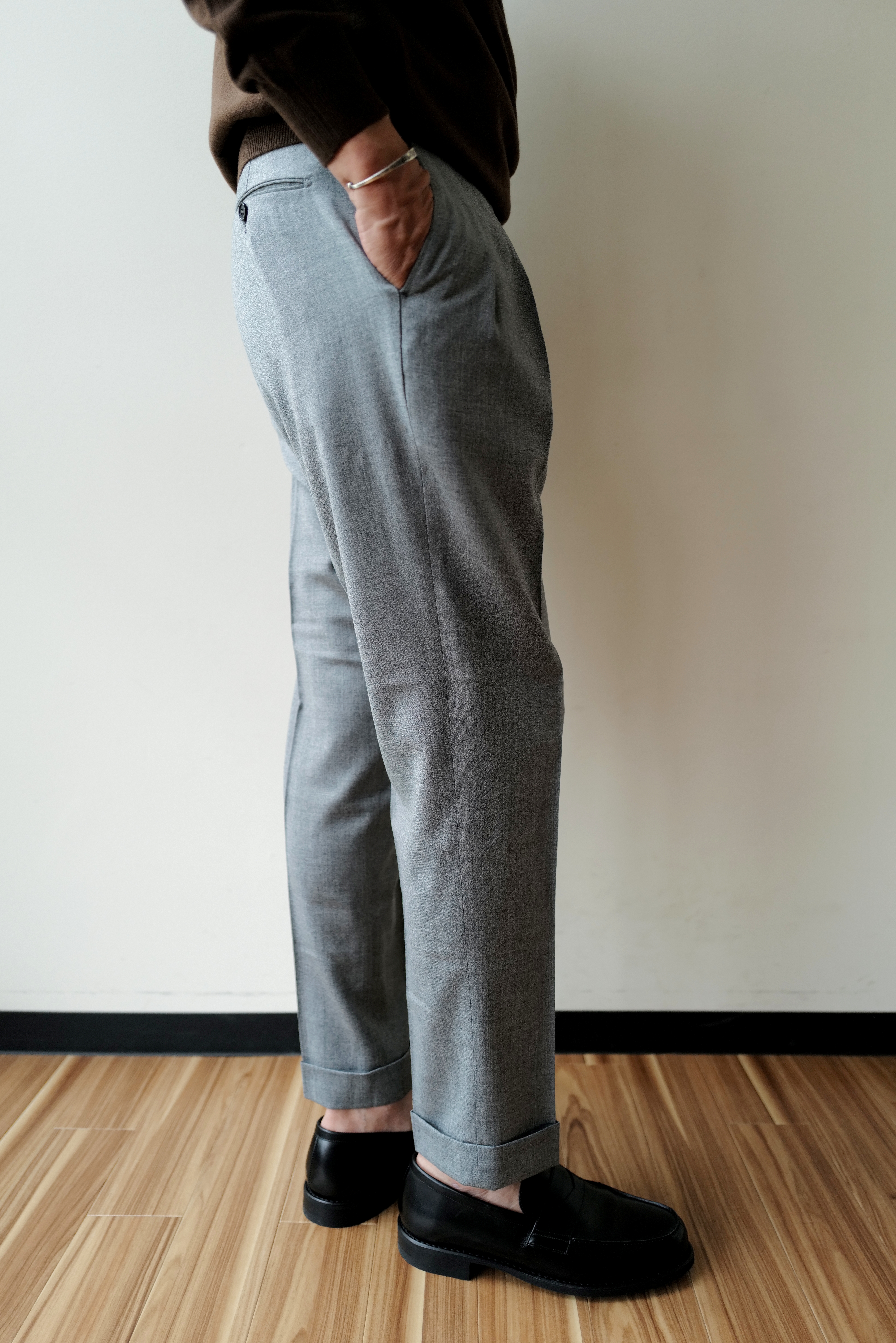 サイドアジャスト付き、インの2タックモデル「SCOTCH」は深めの股上、ゆったりとした腰回りから裾にかけてテーパードさせた、【BERWICH/ベルウィッチ】の中で最も話題性のあるモデルです。"WASH ME AT HOME"と家庭で洗うことのできる手軽さも魅力。ライトウェイウールのライトグレイと、軽さに拘りました。
