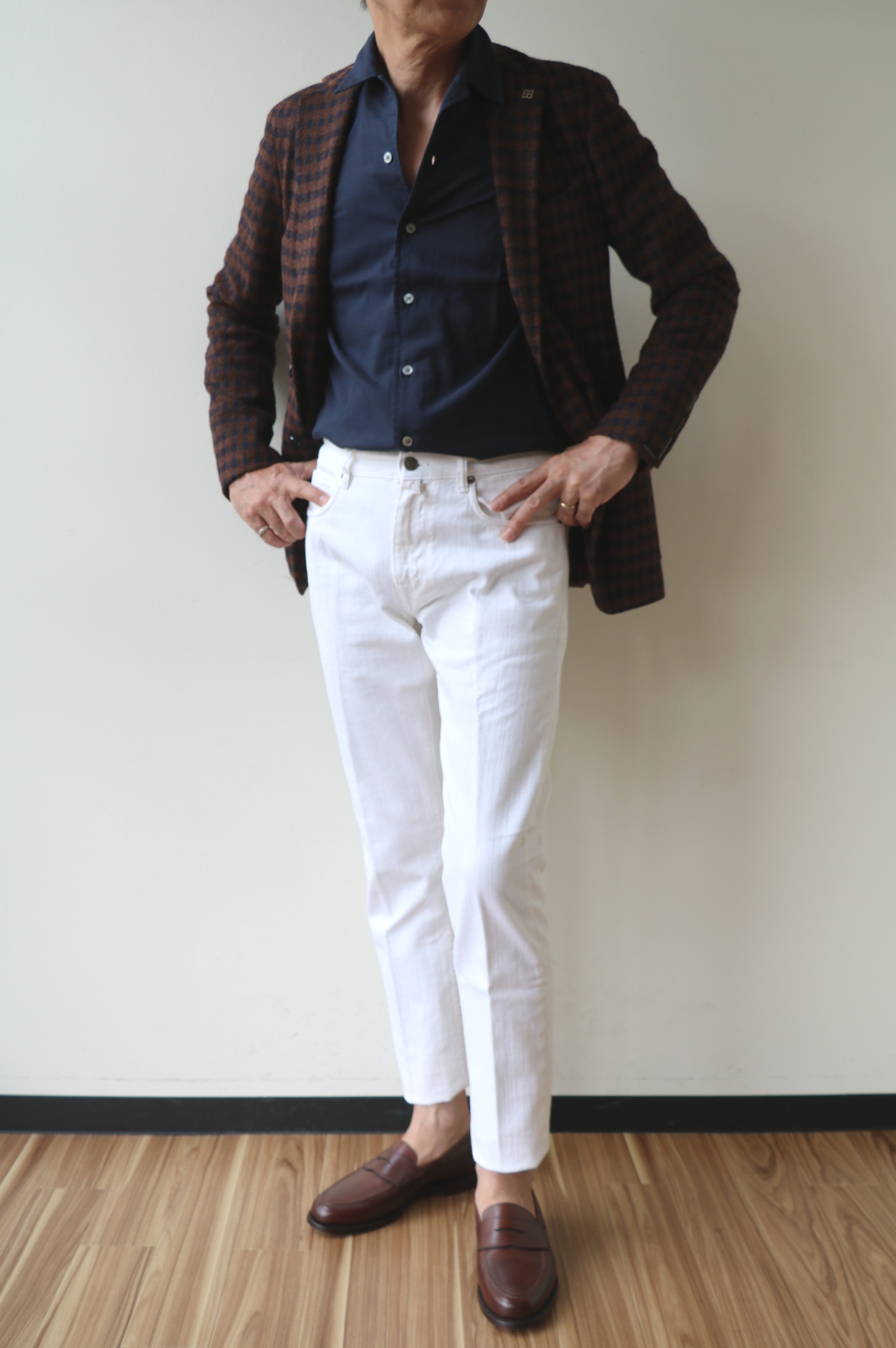 橙色で合わせたニットは未公開のFEDELI、パンツは未公開のPT01、靴は追加予定のCROCKETT&JONES、手に持ったコートは未公開のTAGLIATORE。ネイビーで合わせたジャケットはTAGLIATORE、パンツはINCOTEX、靴はCROCKETT&JONESです。