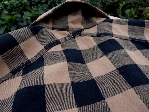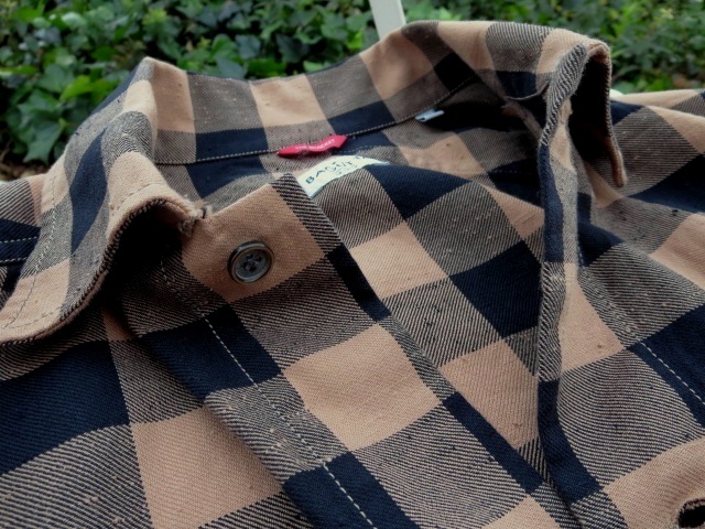 コットン100%のツイル地は、通常のシャツ地よりも、ほんの少し地厚。というよりハリコシがあります。写真はやや薄くなりましたが、橙(だいだい)色とブラックのブロックチェック柄。所々に施されたネップが素朴な表情を作り出します。ラフな柄行きのシャツを着丈を長くすることで、エレガントにも魅せる技は、さすがです。