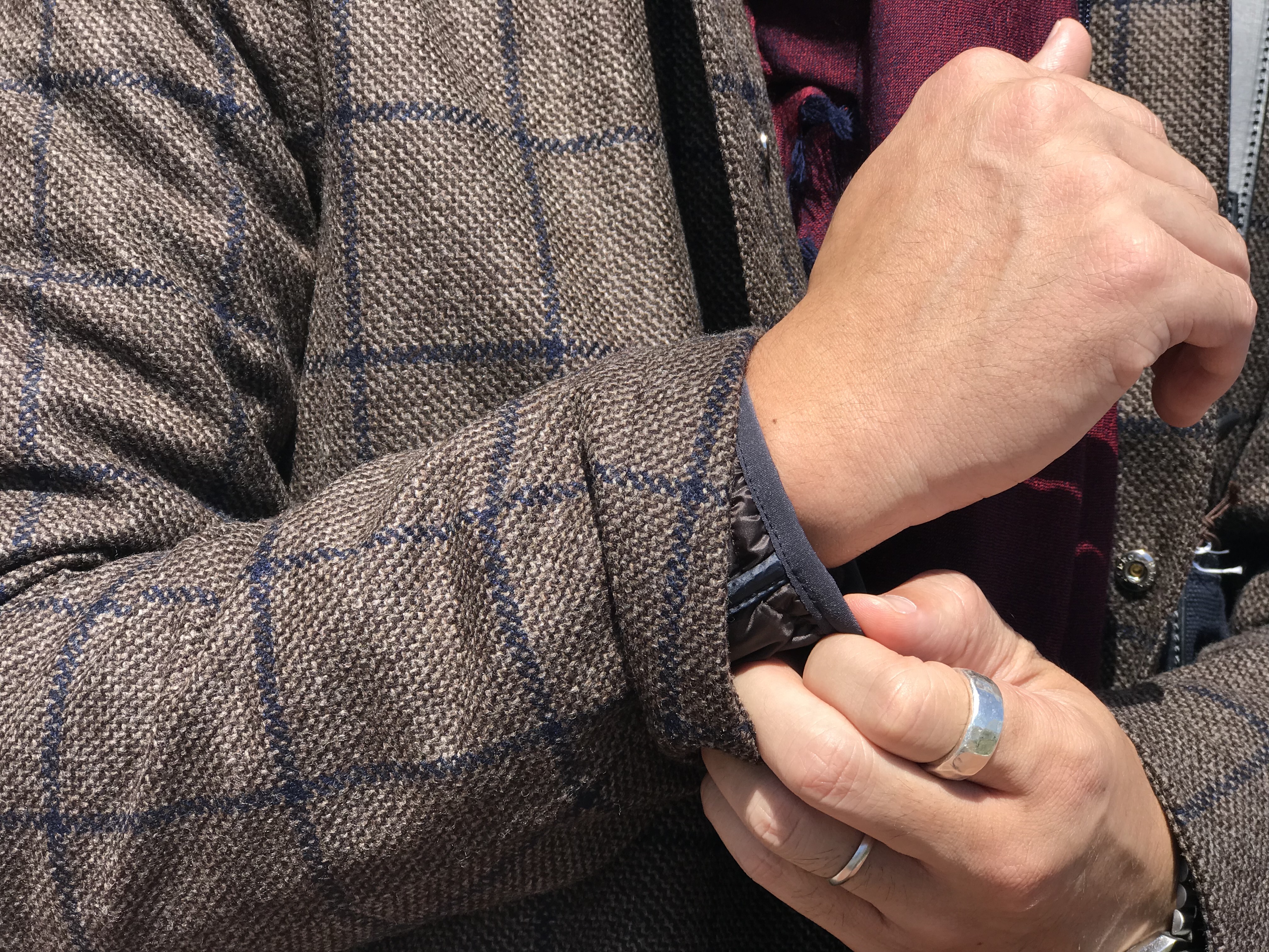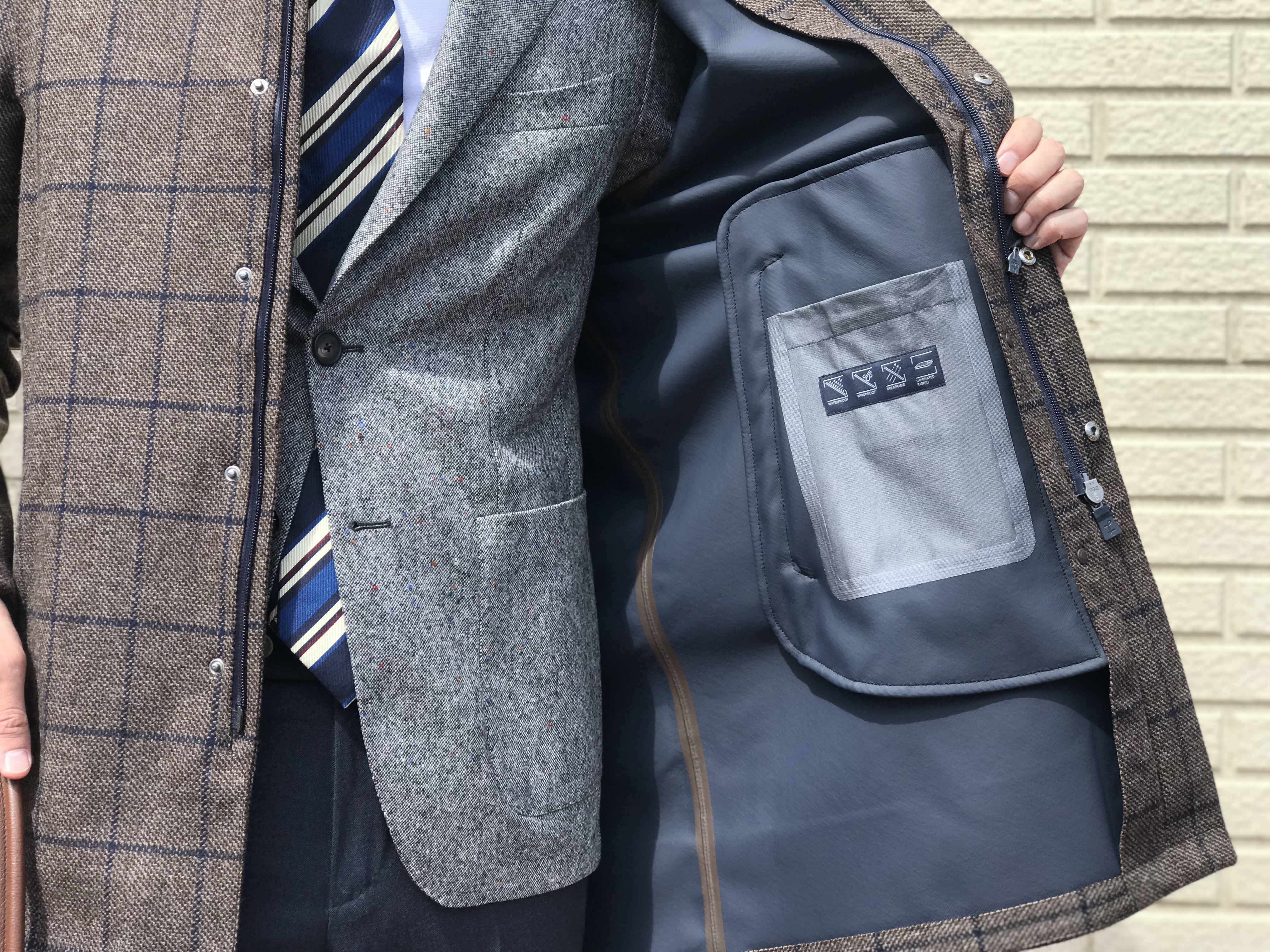 そして、ウール×カシミアを贅沢に使用した生地は、ラミネート加工によって撥水加工がなされ、ポケットやその他のつなぎ目部分すべてには、水の侵入を防ぐ止水テープが施されています。さらに、着心地の不快感をなくすため、生地は呼吸をするように湿気を発散してくれます。