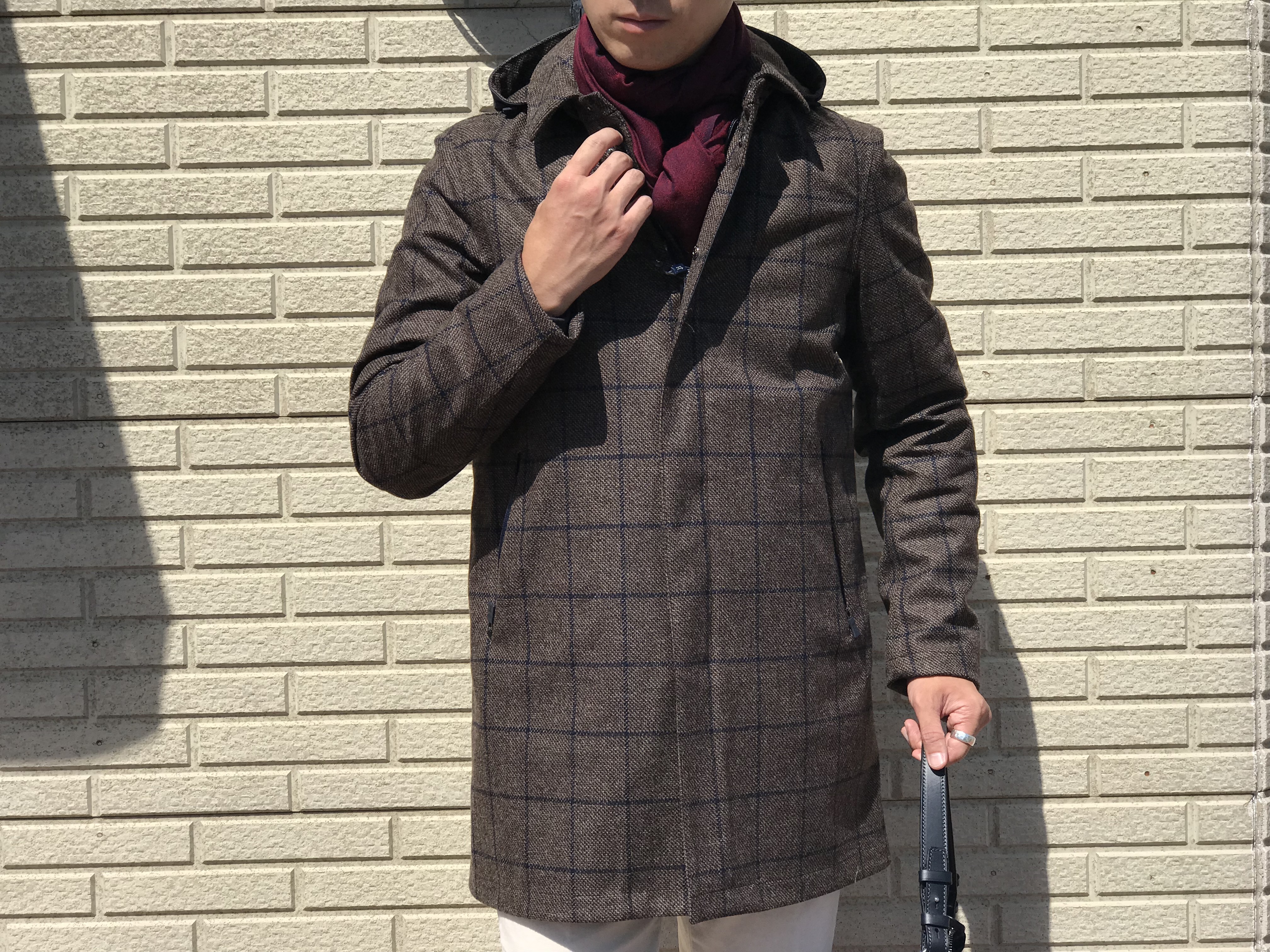 ベースはバルカラーコートですが、脱着式のフードが付属されています。フロントはスナップボタンとダブルジップの併用で、やや短めに採られた着丈の長さが、絶妙のバランスです。