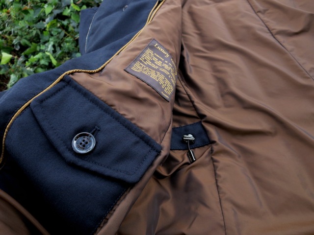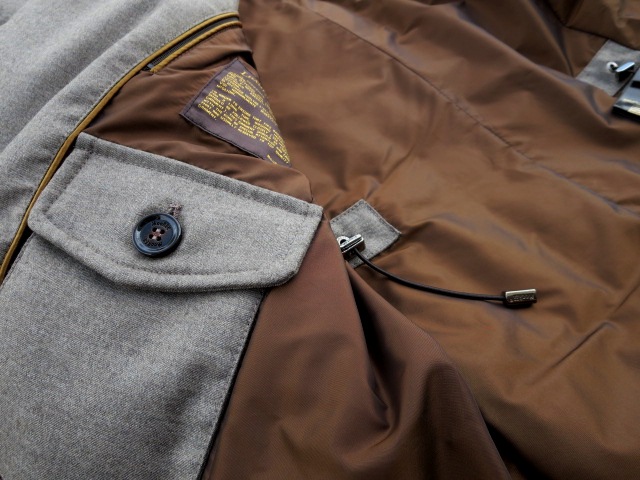「内側の装備も完璧です。右には縦にジップ付きポケットとウエスト部分にフラップ付きポケット。左にもスラントのジップポケットが付きます。ウエストのドローコードを締めれば、更に保温性が高まります」と、外側だけではなく、内側の美しい機能美も、当時と全く変わることはありません。