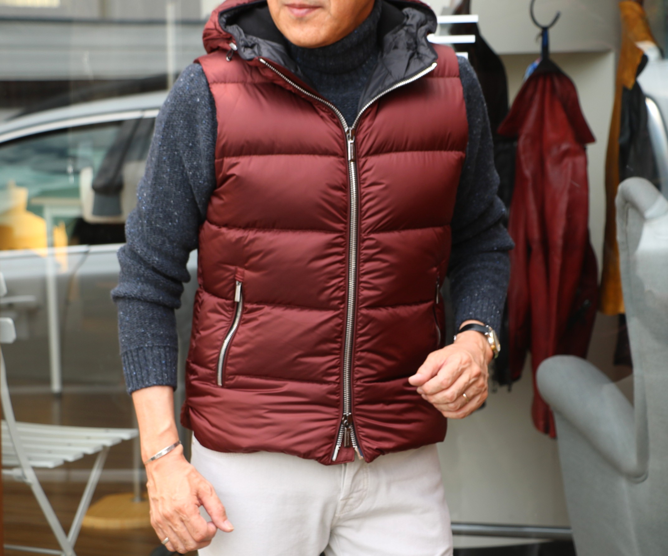 本日のご案内は、順調な入荷状況の【MooRER/ムーレー】。メインコレクションで見つけた艶やかな海老茶(ボルドー)。モデル名は「PERSEO/ペルセオ」のフーデットダウンベスト。この秋冬は色で楽しみたい、でも色の組み合わせが難しくて...そんな方にお勧めしたいのが、ボルドー系。ブラック、グレイ、ホワイトのモノクロやベージュからブラウンの茶系までと幅広くコーディネートできるカラーです。