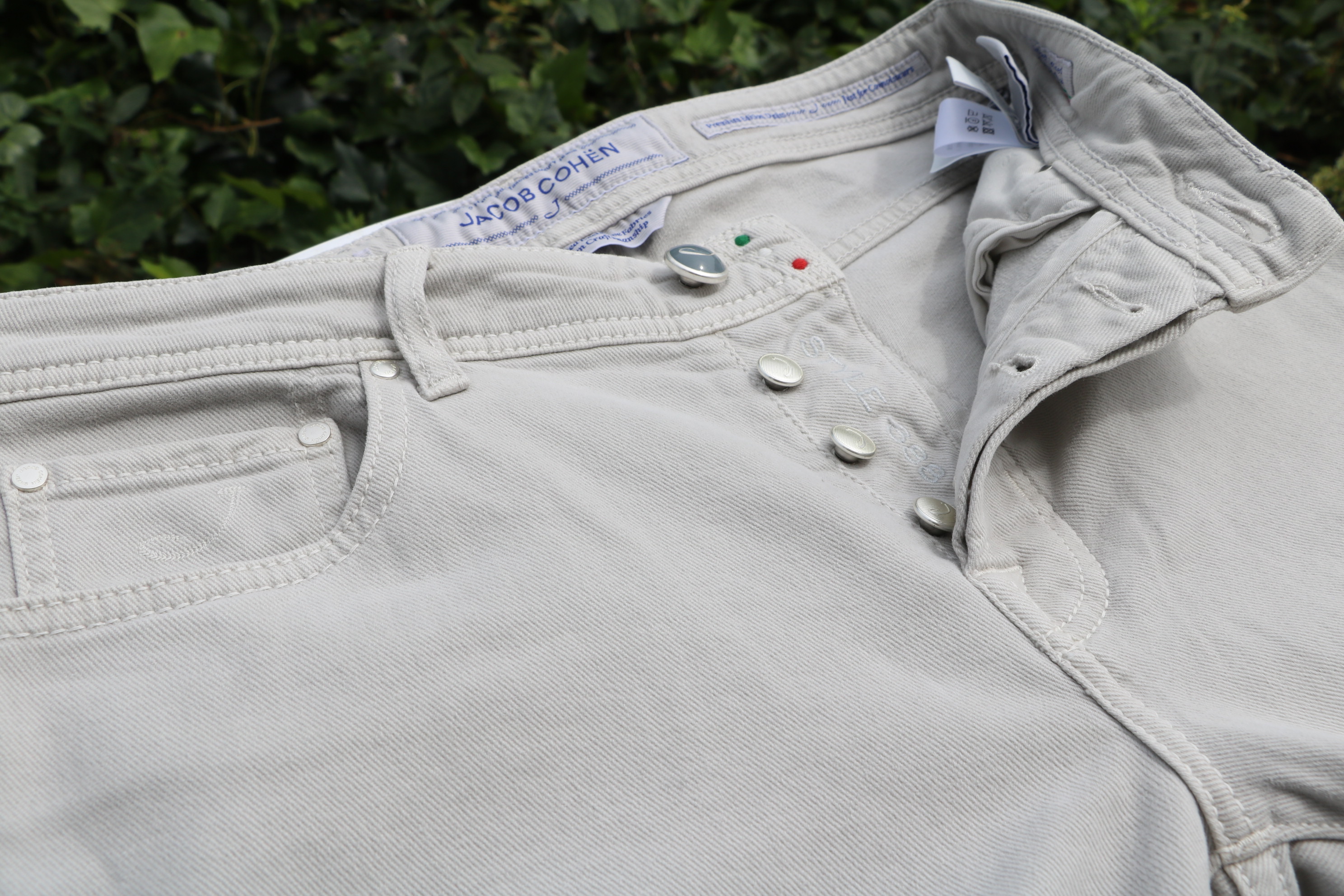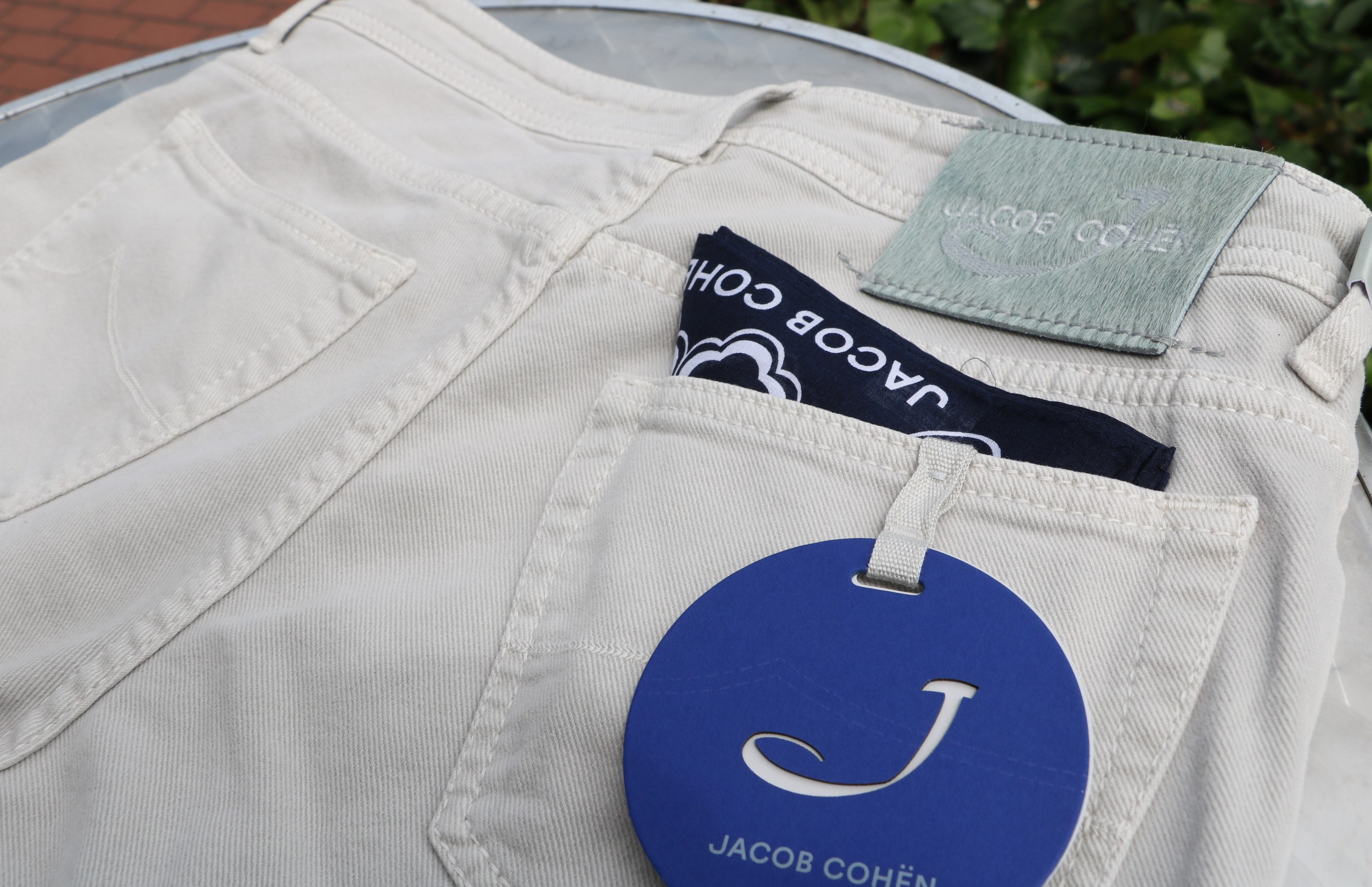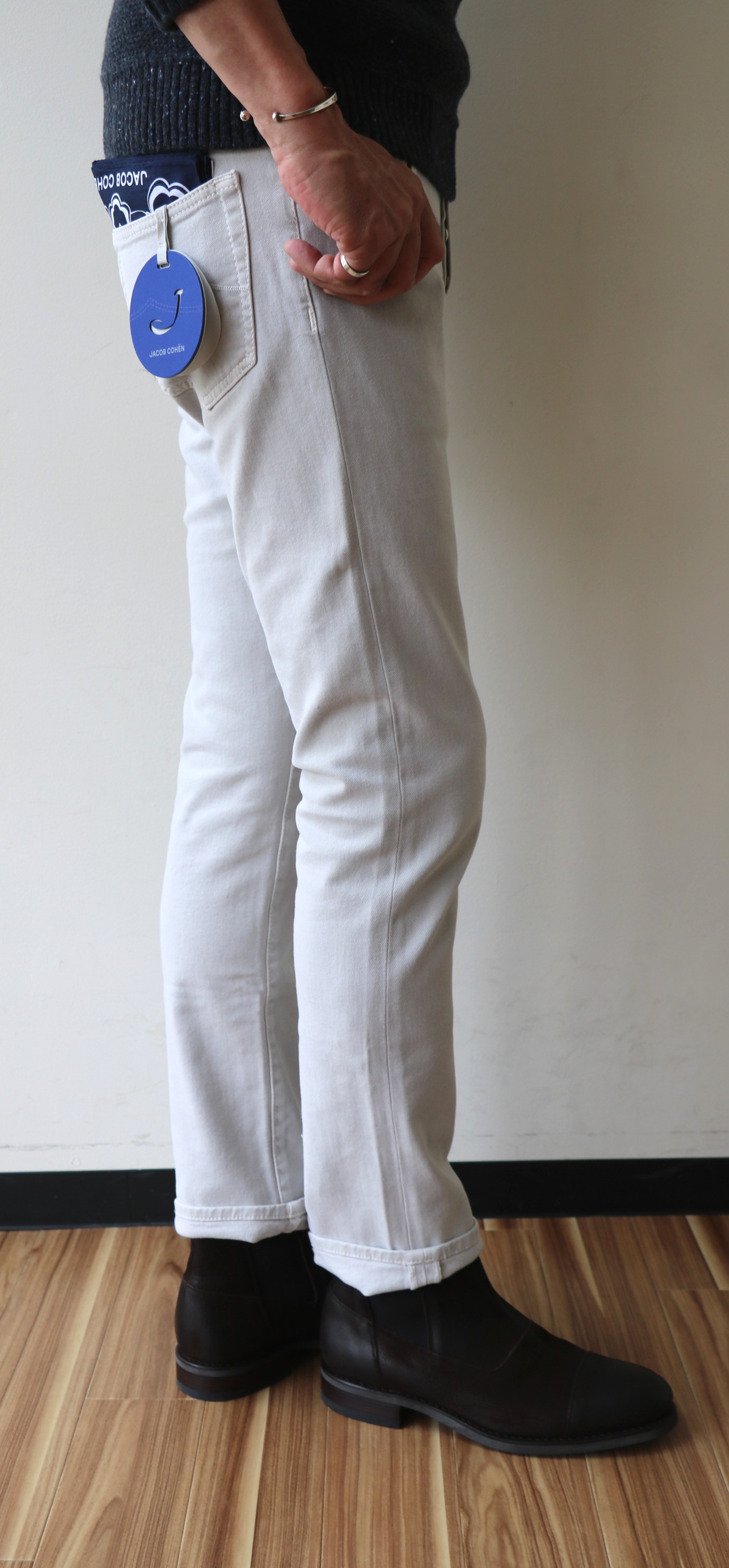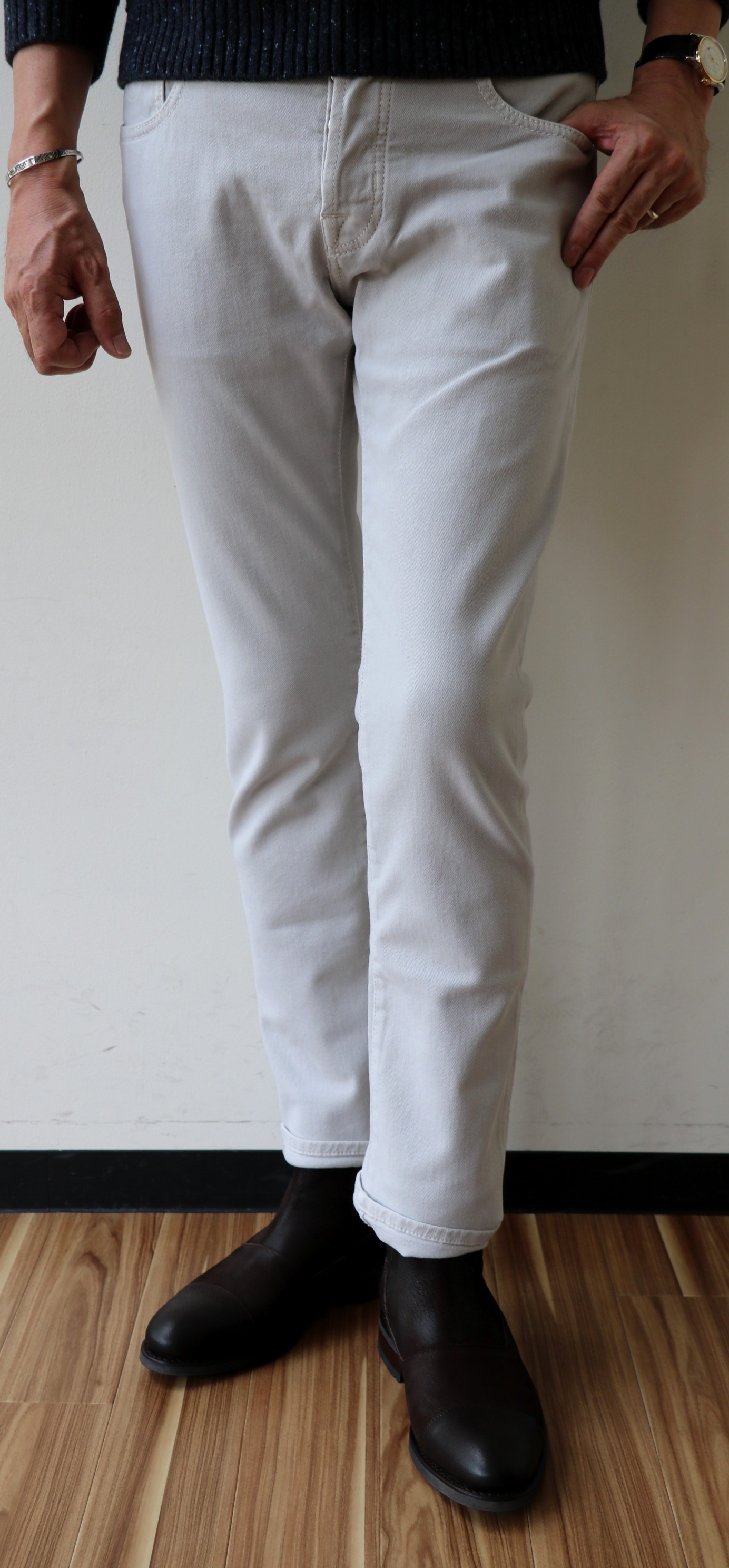 【JACOB COHEN/ヤコブ コーエン】です。ウォッシャブルブルー&ブラックの次に登場するのは、グレイッシュなホワイト、オイスターホワイトのコットンツイル。やや起毛感のある秋冬春のスリーシーズン使える5ポケットパンツです。柔らかな黄味のあるアイボリーホワイトに比べるとクールな表情になります。「622」と比べ、やや深めの股上をもつ「688」でセレクトです。