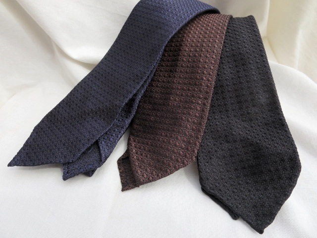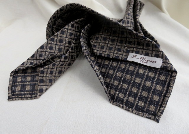 「噂によるとによると、なんと主婦が自宅にネクタイの素材を持ち帰り、台所で縫い上げているそうです。もちろん、ただの主婦ではありません。熟練した技を持つスペシャリストです。工房で時間がなくなれば、自宅でと、マシンメイドではないハンドならではの逸話です。更に凄いのは、朝締めたら、夜外すまで結び目が緩まないこと。これは、表地と芯地の絶妙な組み合わせを瞬時で見極めてしまうフランチェスコ・マリーノならではの経験による見識です」と以前のブログからの引用ですが、その噂はどうやら本当のようです。セレクトの内容をご覧ください。