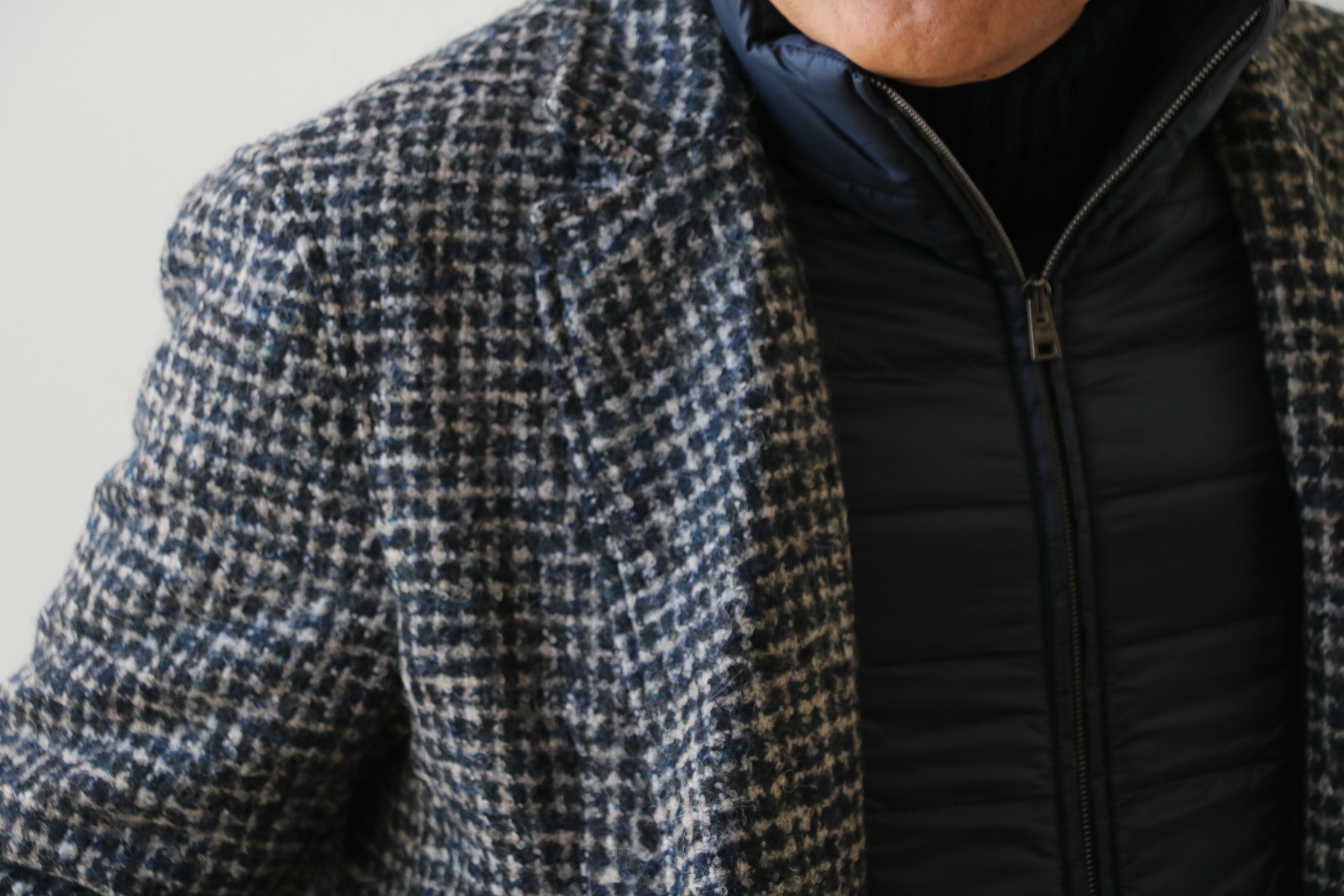 ウール・ナイロン・アルパカ・モヘア・その他と賑やかな素材で作られたチェック柄は、表情豊かです。