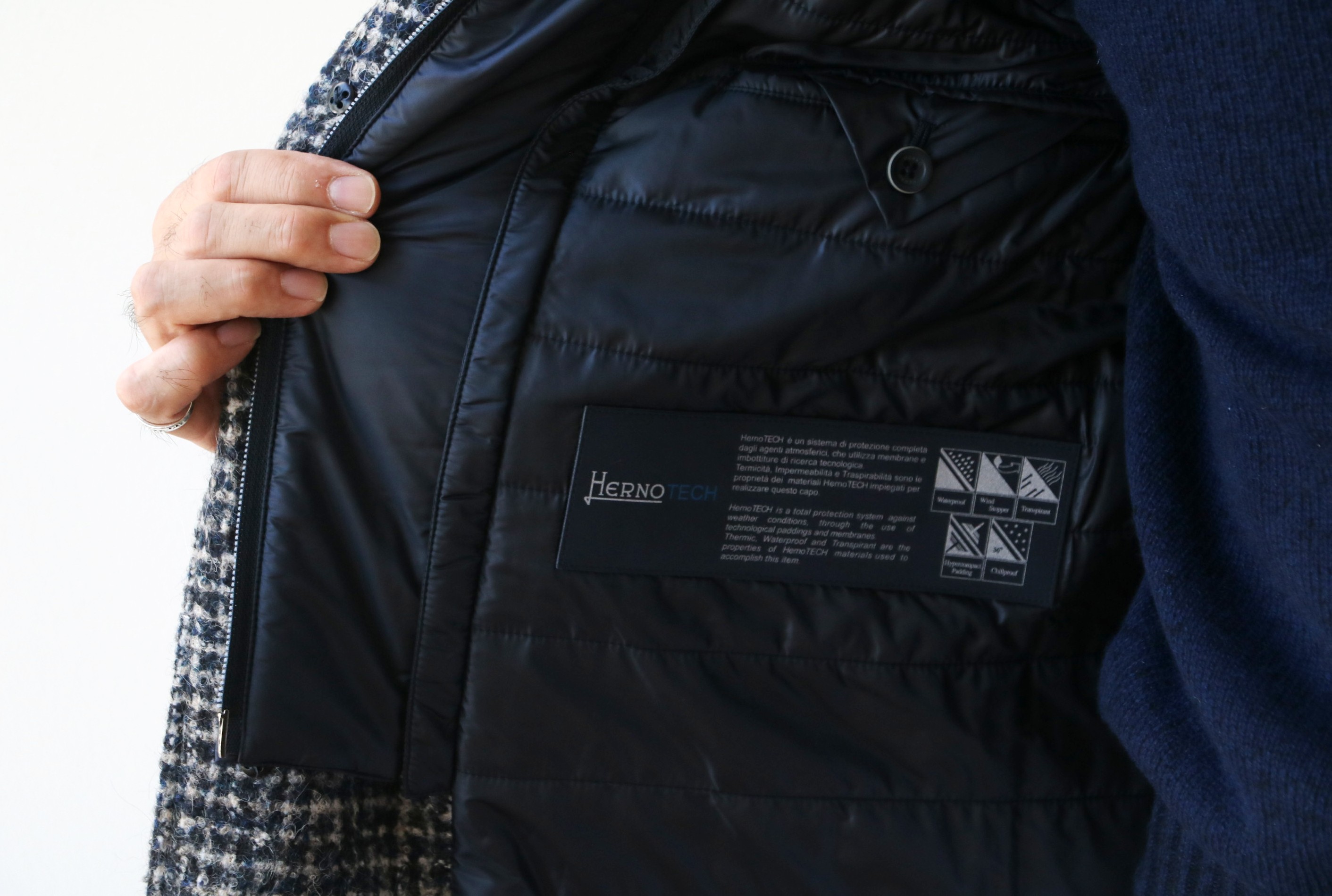 中綿はダウンではなく、ポリエステル100%。独自に開発した多機能ファブリックの「HernoTECH」は、雨と風をシャットアウトしながら、内側にこもった湿気は発散。雪が降るような環境下でも内側を36℃に保ちます。