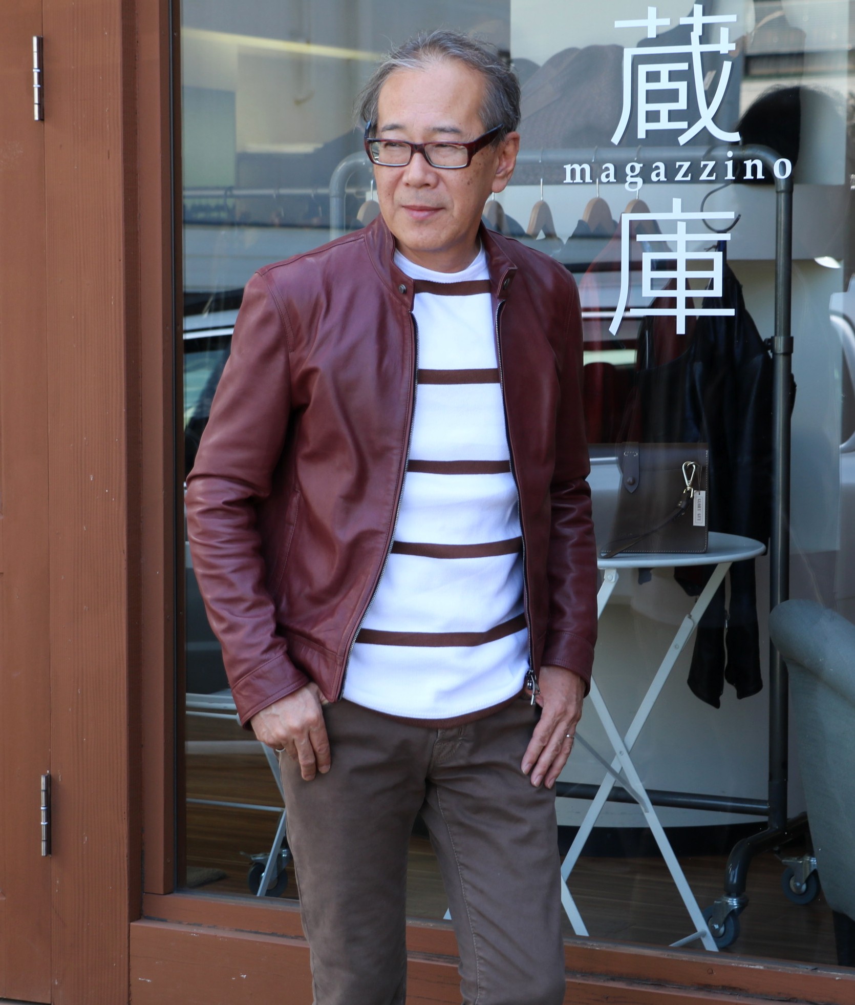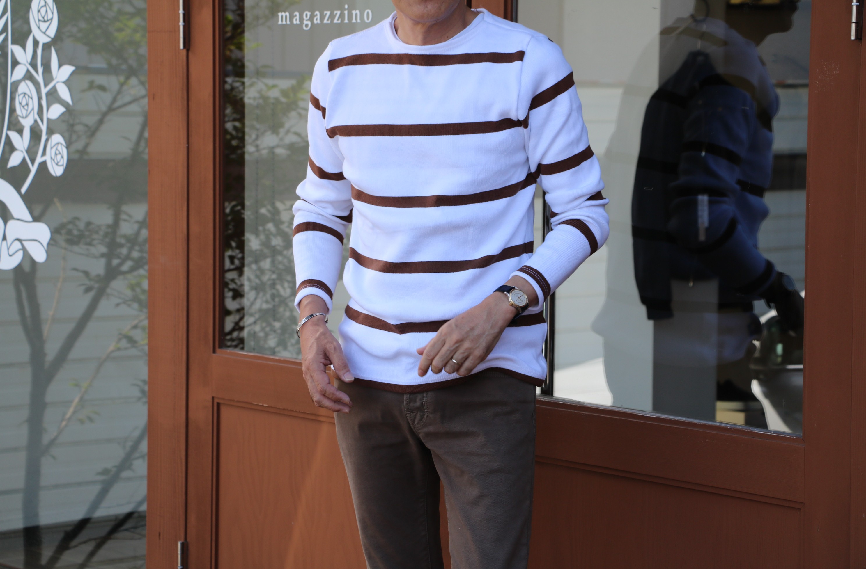 皆さんご存知の、あのボーダーカットソーで人気のSAINTJAMES(セントジェームス)。かつてグローリーガイにも並んでいたことがありますが、ボーダー嫌いだった私の独断と偏見でいつのまにか取引中止。ただ還暦過ぎて、気になりだした理由とは、"ちょい可愛いがモテる"というスケベ心。物心付いて初めて着たのは、この夏、購入したmey story(マイストーリー)の細かいボーダーの半袖Tシャツ(実は本日も着ております)。ただ気をつけないといけないのは、"とっちゃん坊や"にならないこと。やはり可愛さに含まれるのは、大人の色気です。そこで、これならと紹介前に秘かに?着たのが、間隔のあるボーダー柄。それもブラウンとなれば、ずいぶん大人っぽい雰囲気に。生地も、程よいハリのある柔らかさ。そうなると上にあわせたくなるのが、EMMETI(エンメティ)の「JURI/ユリ」。赤茶のレザーが、憎いほどにぴったりなんです。