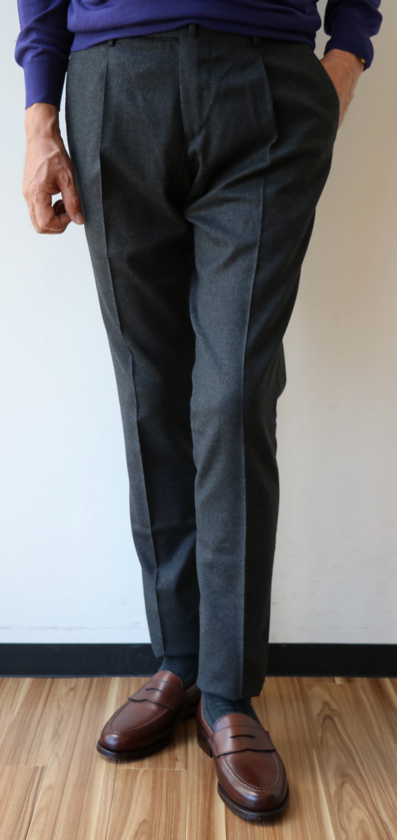 もうお馴染みですね。9月25日のTAGIATORE(タリアトーレ)のジャケットに合わせているのが【PT01/ピーティーゼロウーノ】の代表素材「TRAVELLAR」。機能素材を使う事で、今までのドレスパンツの概念を覆した、楽チンドレスパンツの火付け役と言っても過言ではありません。さらに今回、例年なら「SUPER SLIM FIT」でセレクトするところを、やや深めの股上と腰回りにゆとりをもたせたワンプリーツの「EVO FIT」でご提案。もともと日本人の体型(ヒップ周り)に合わせたモデルですので穿き易さはもちろんのこと、クラシック回帰のトレンドを加味してのバイイングです。