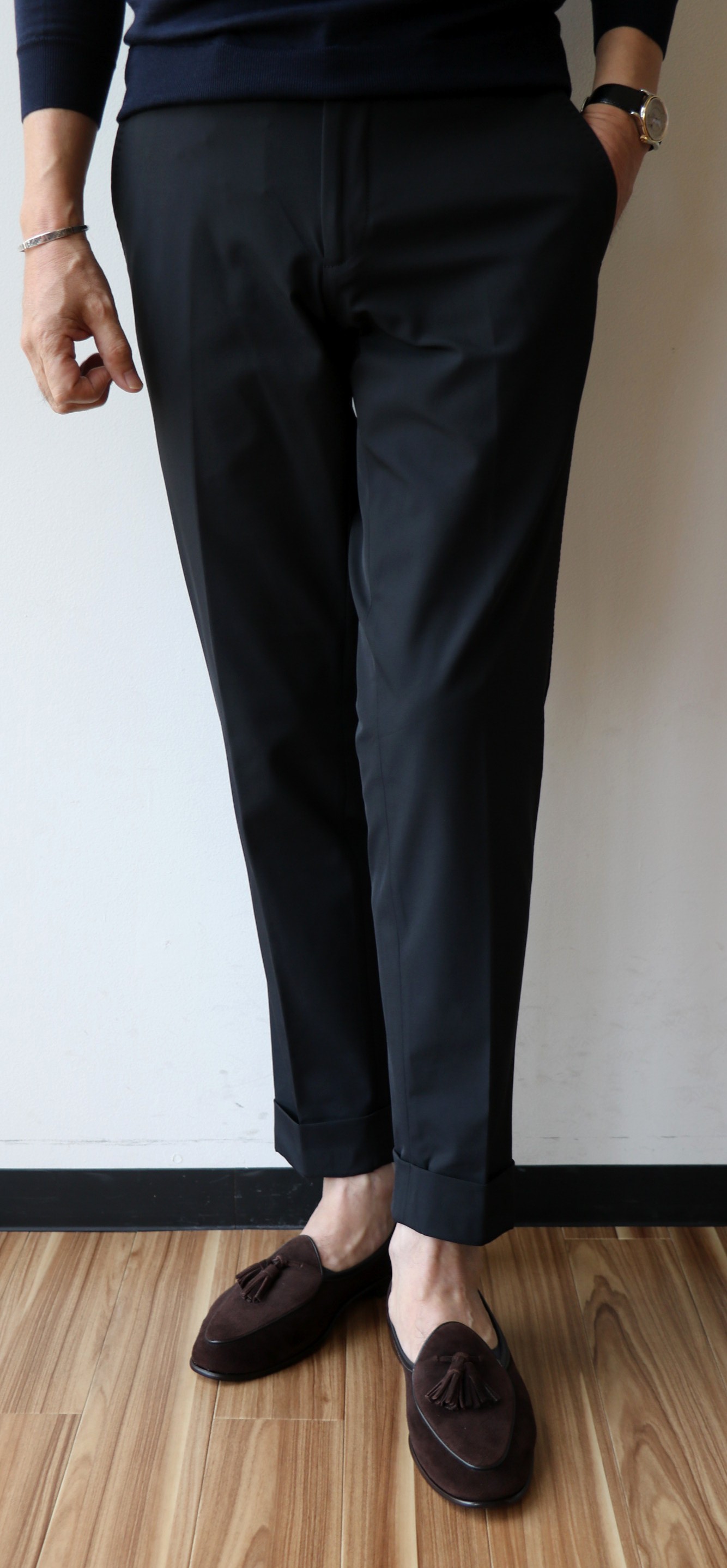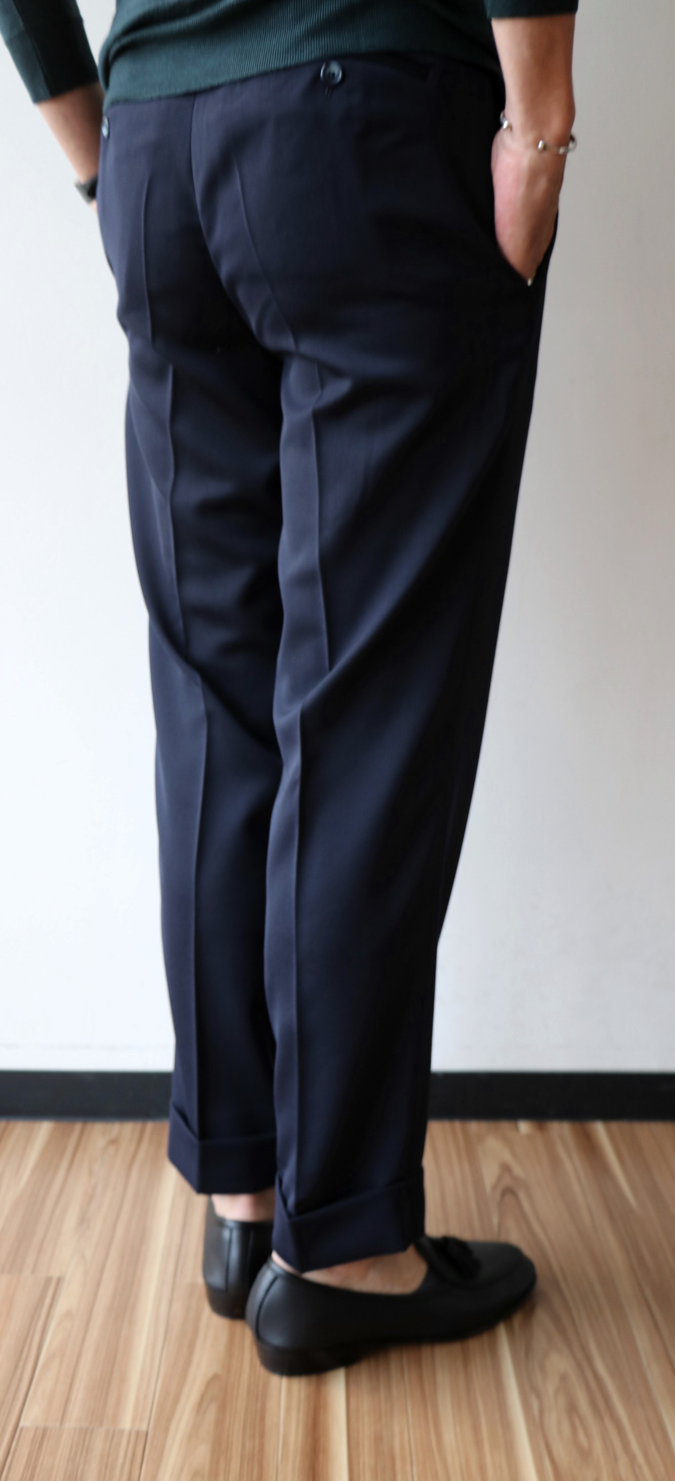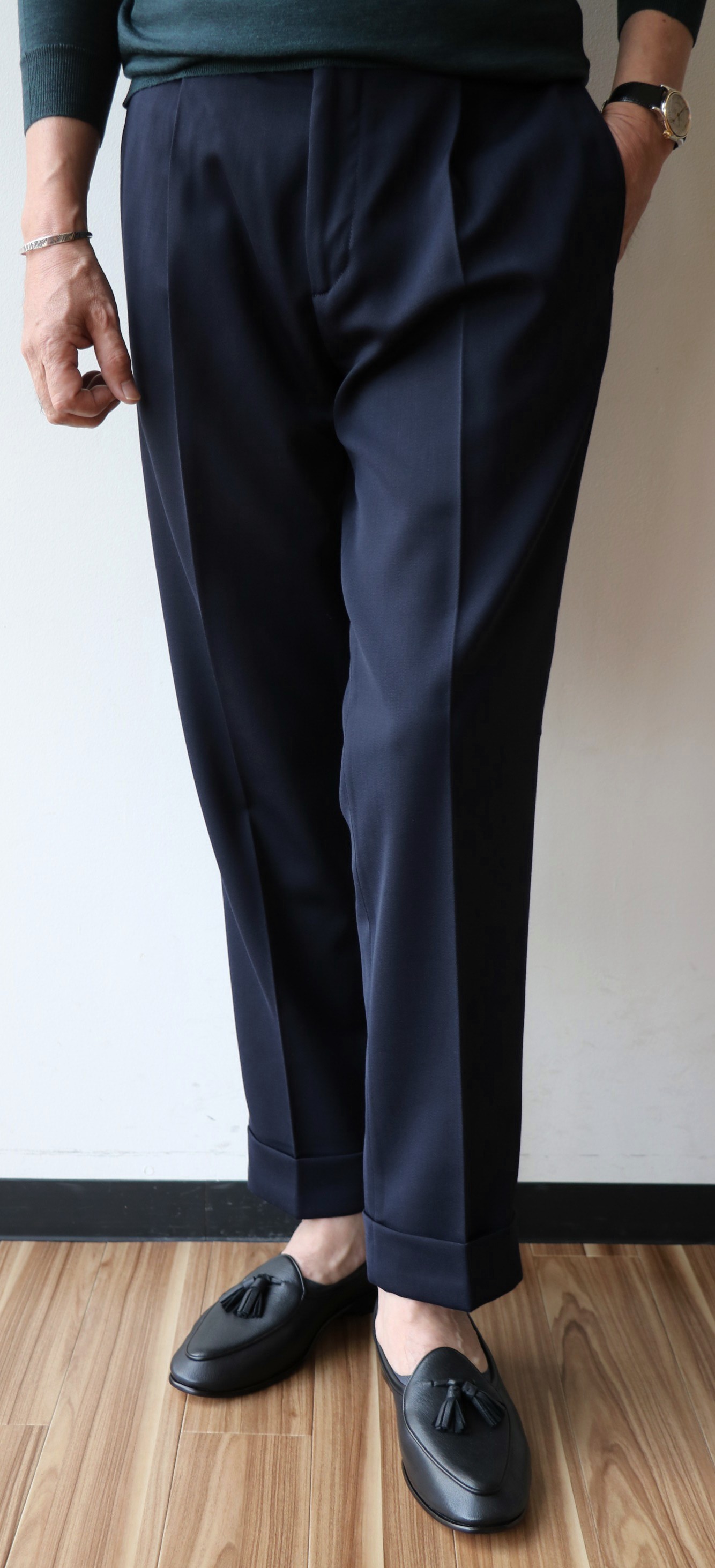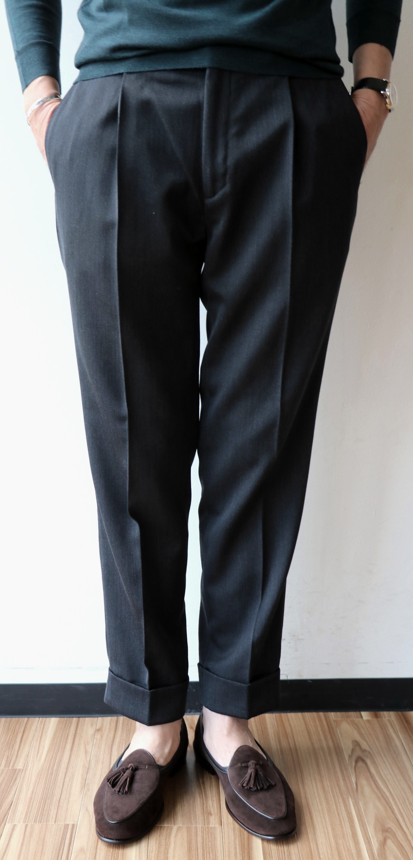 モデルは「DANNO」。ワンプリーツのクラシカルなパンツですが、INCOTEX(インコテックス)やPT01(ピーティーゼロウーノ)とも違う、独特なフォルムで魅せる【Borelio/ボレリオ】ならではの空気感。フロントは釦でしたが、ジップに変更してご提案です。