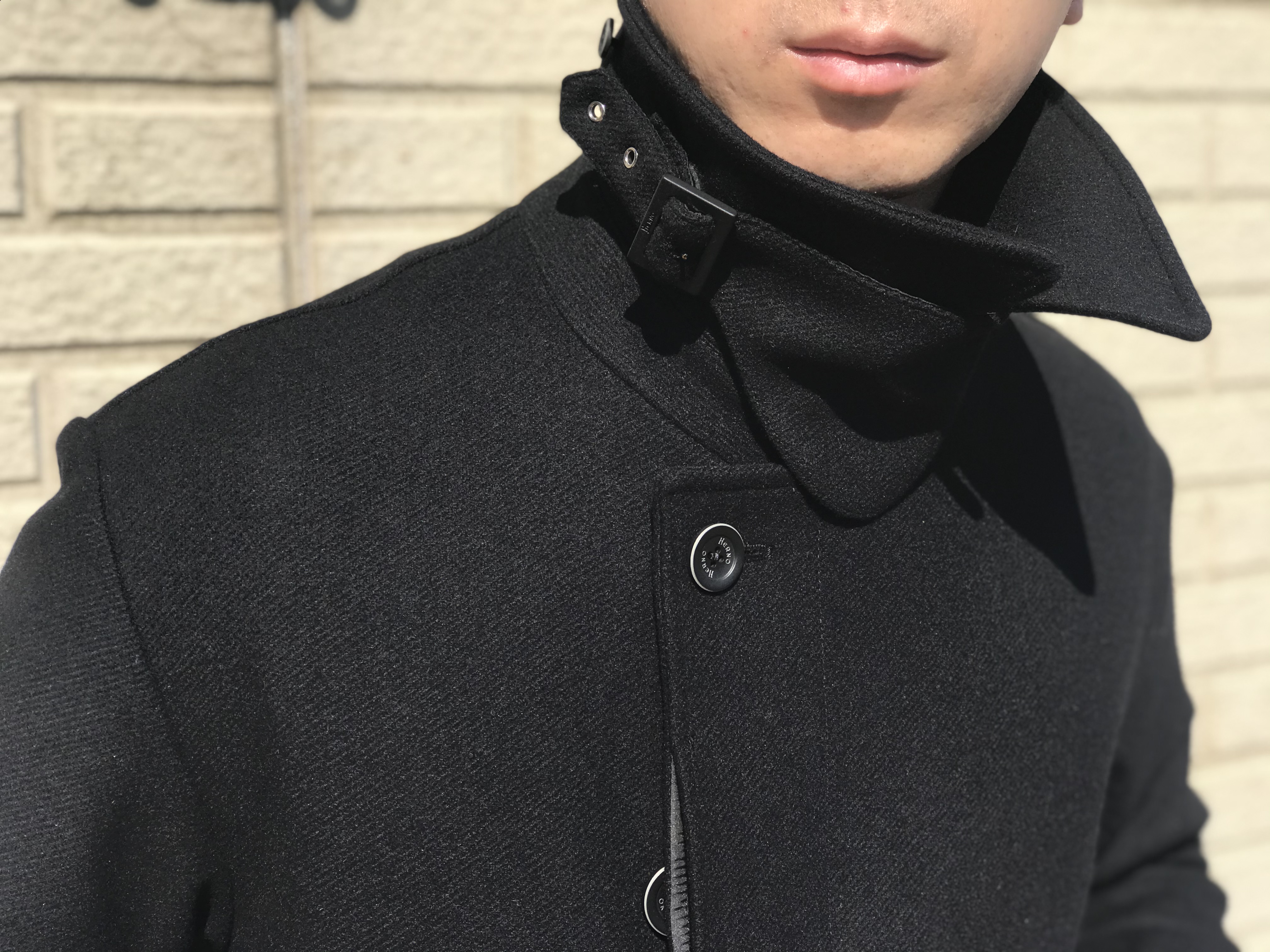 首周りから雨風が入ったり、暖かい空気を逃がさないよう、そして、襟のバタつきを抑えるためのチンストラップが付いたコート。