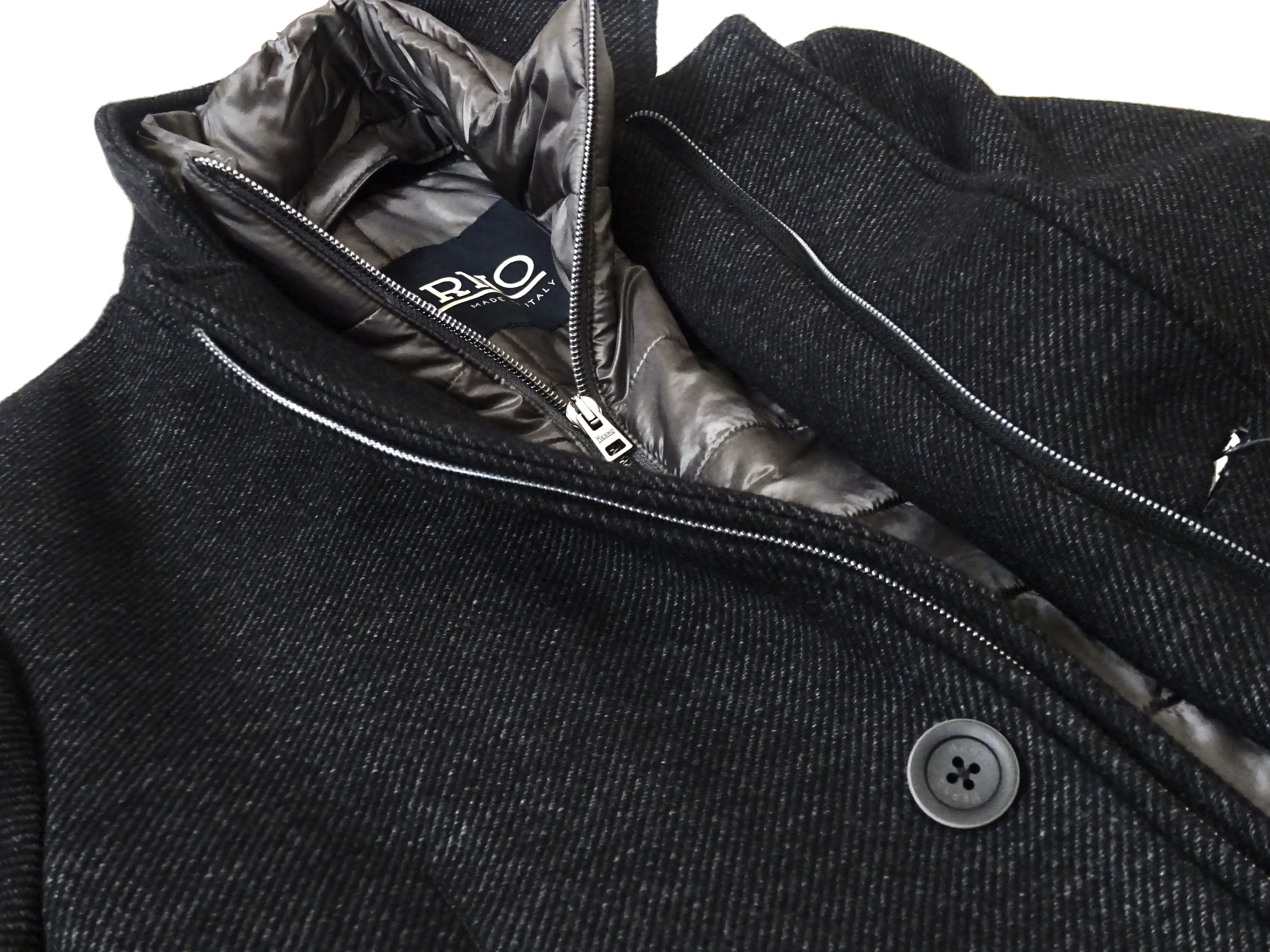 チンストラップは、襟裏に収納されます。こうして見れば、"ヘルノらしい"シンプルなバルカラーコートです。