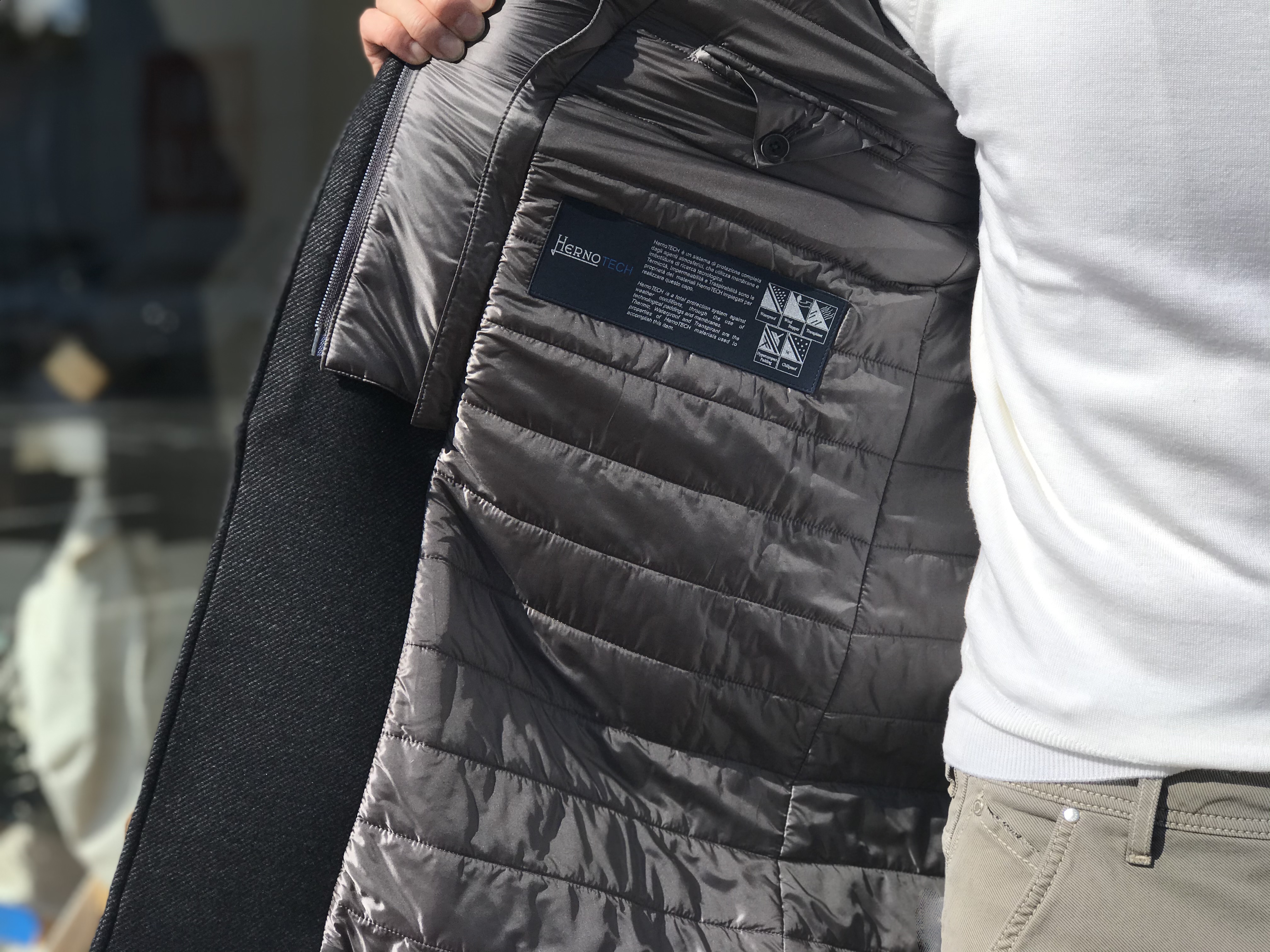 中綿はダウンではなく、ポリエステル100%。独自に開発した多機能ファブリックの「HERNO-TECH」は、雨と風をシャットアウトしながら、内側にこもった湿気は発散。雪が降るような環境下でも内側を36℃に保ちます。