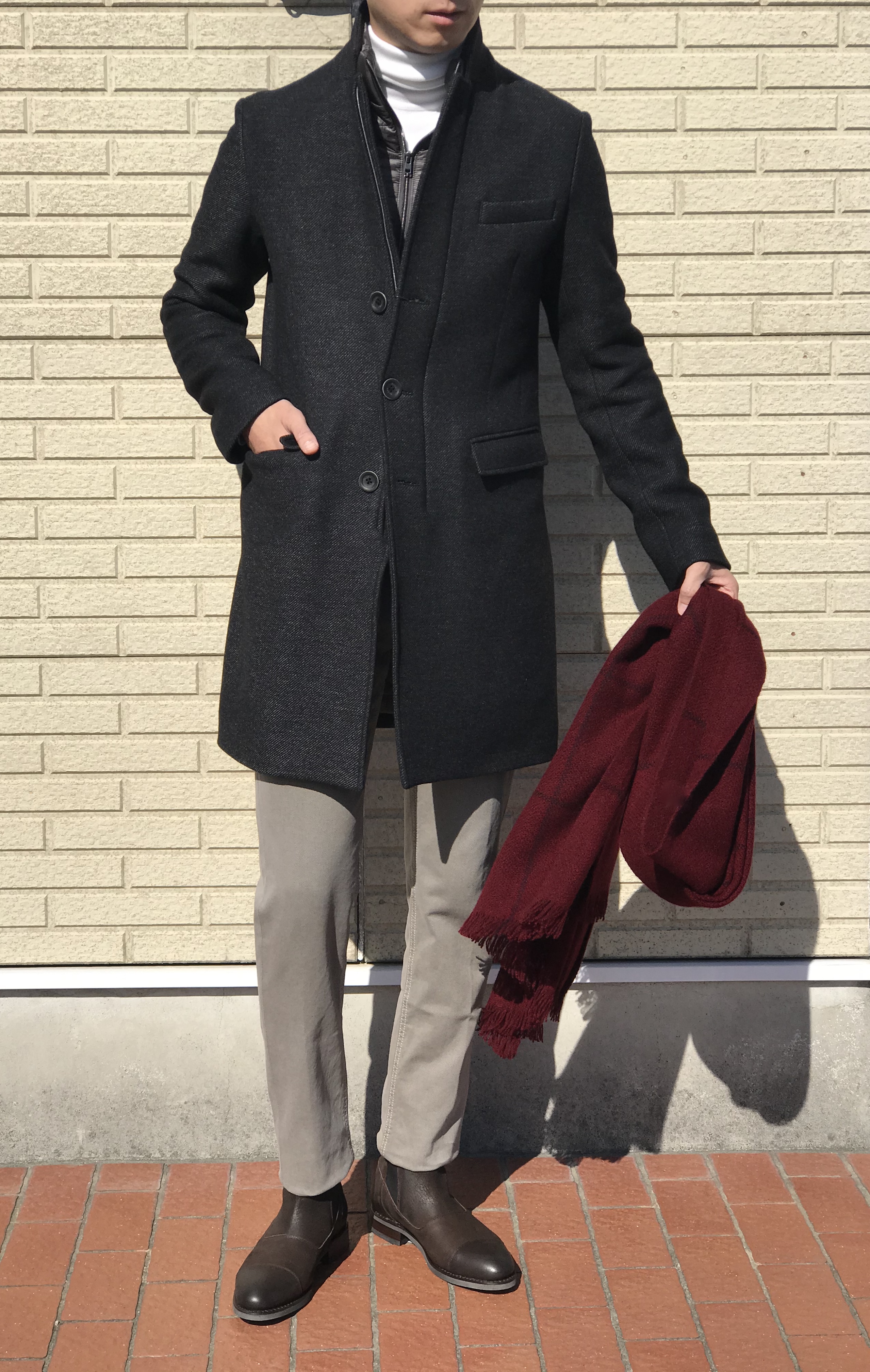 シンプルにコーディネートしても、前身頃のボタン位置をずらしたことで、通常のシングルブレストとは異なった表情になりますね。