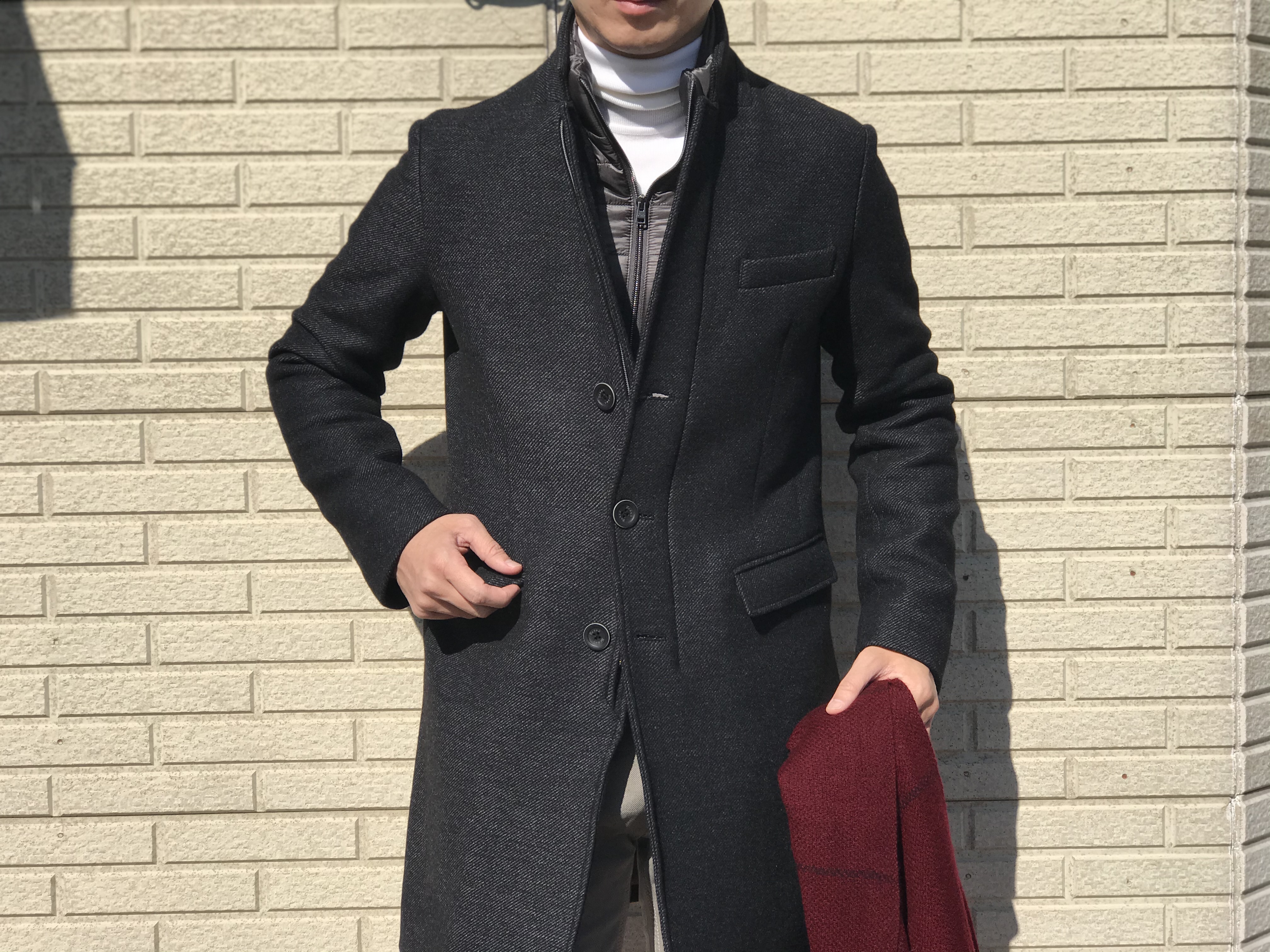襟は純粋なチェスターコートとは異なり、襟の返しをきっちりと付けていないスタンドカラー。チェスターコートよりもスポーティなデザインで、レイヤード部分との重ね着感が、より一層サマになります。