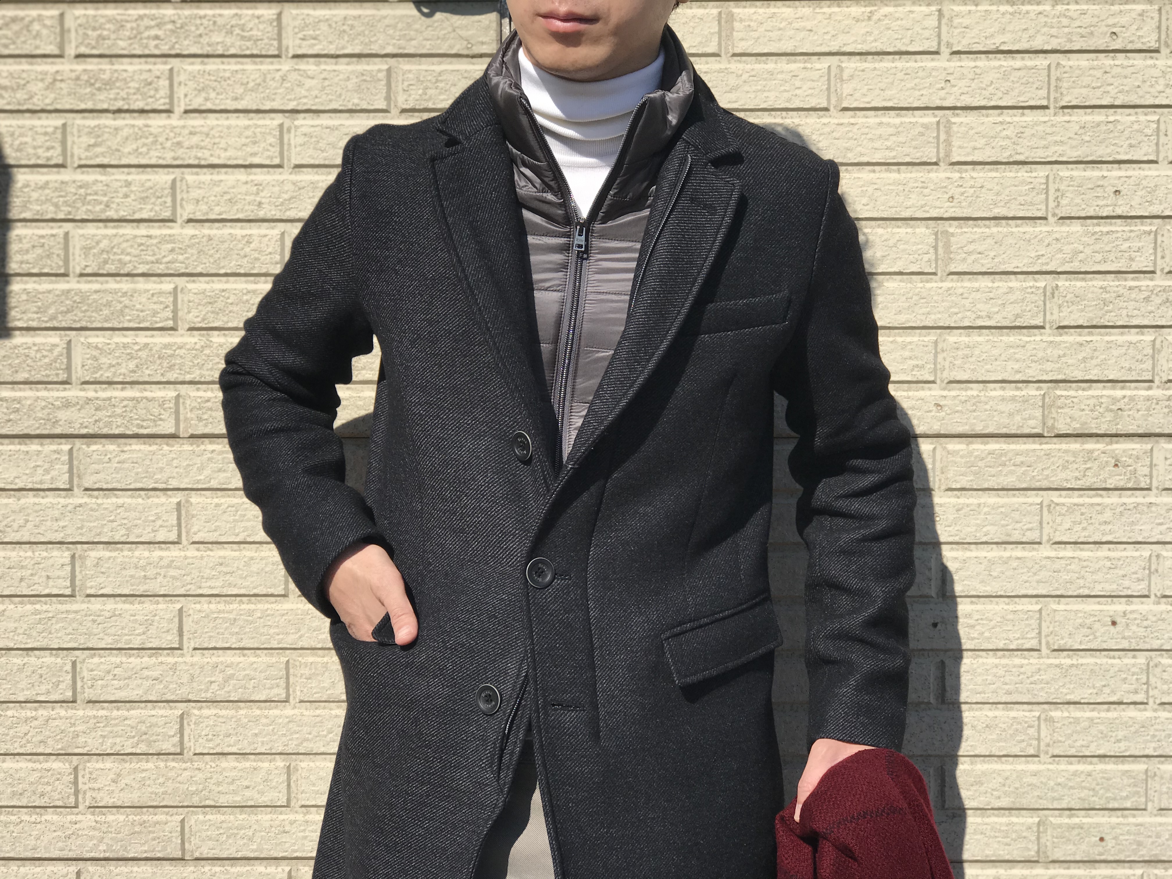 もちろん、折り返すこともできます。スタンドカラーのようなスポーティな着こなしと、チェスターコートのスマートな着こなしが楽しめます。ONの場面で使うのであれば、着脱可能のレイヤード部分を取ると良いですね。
